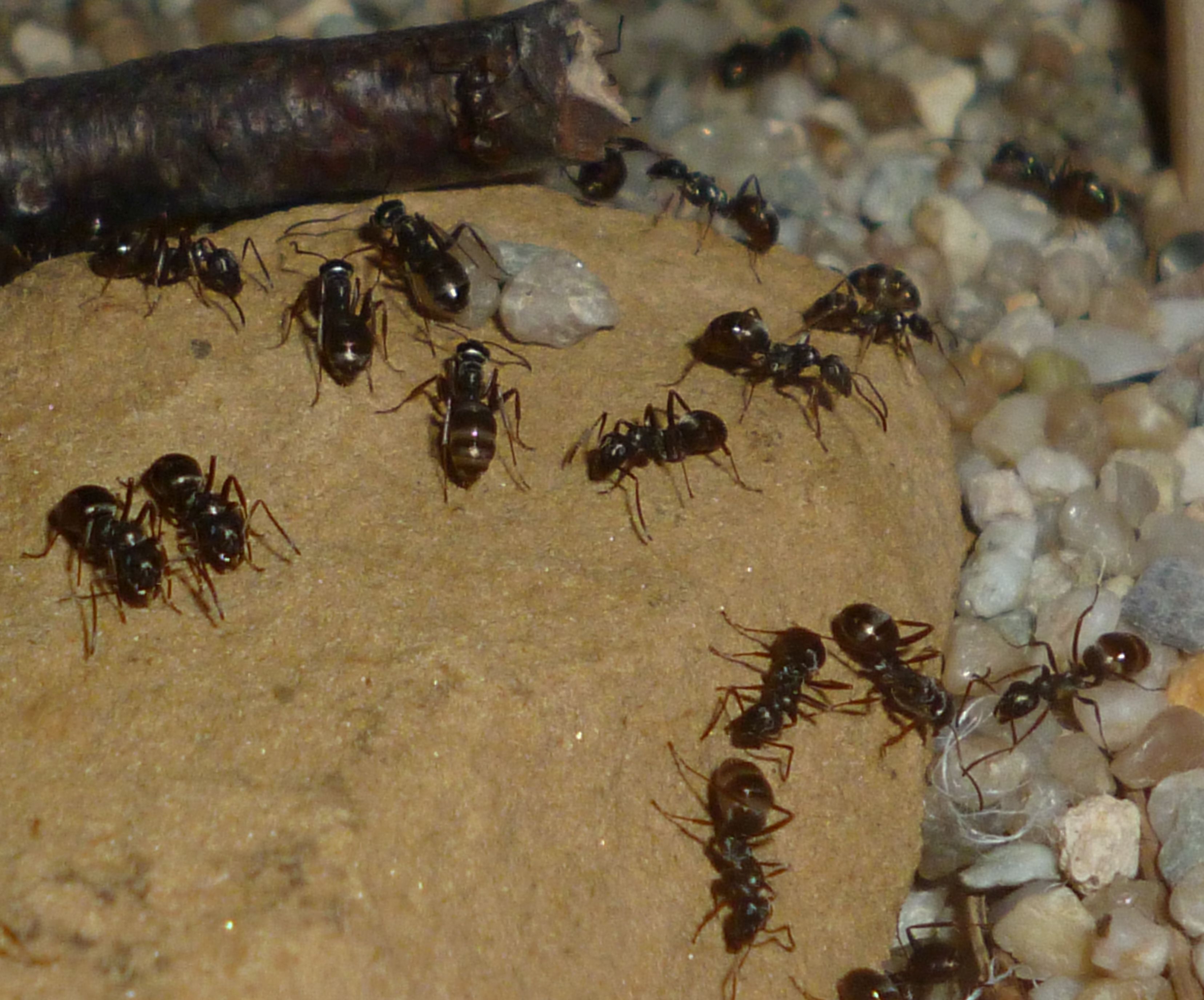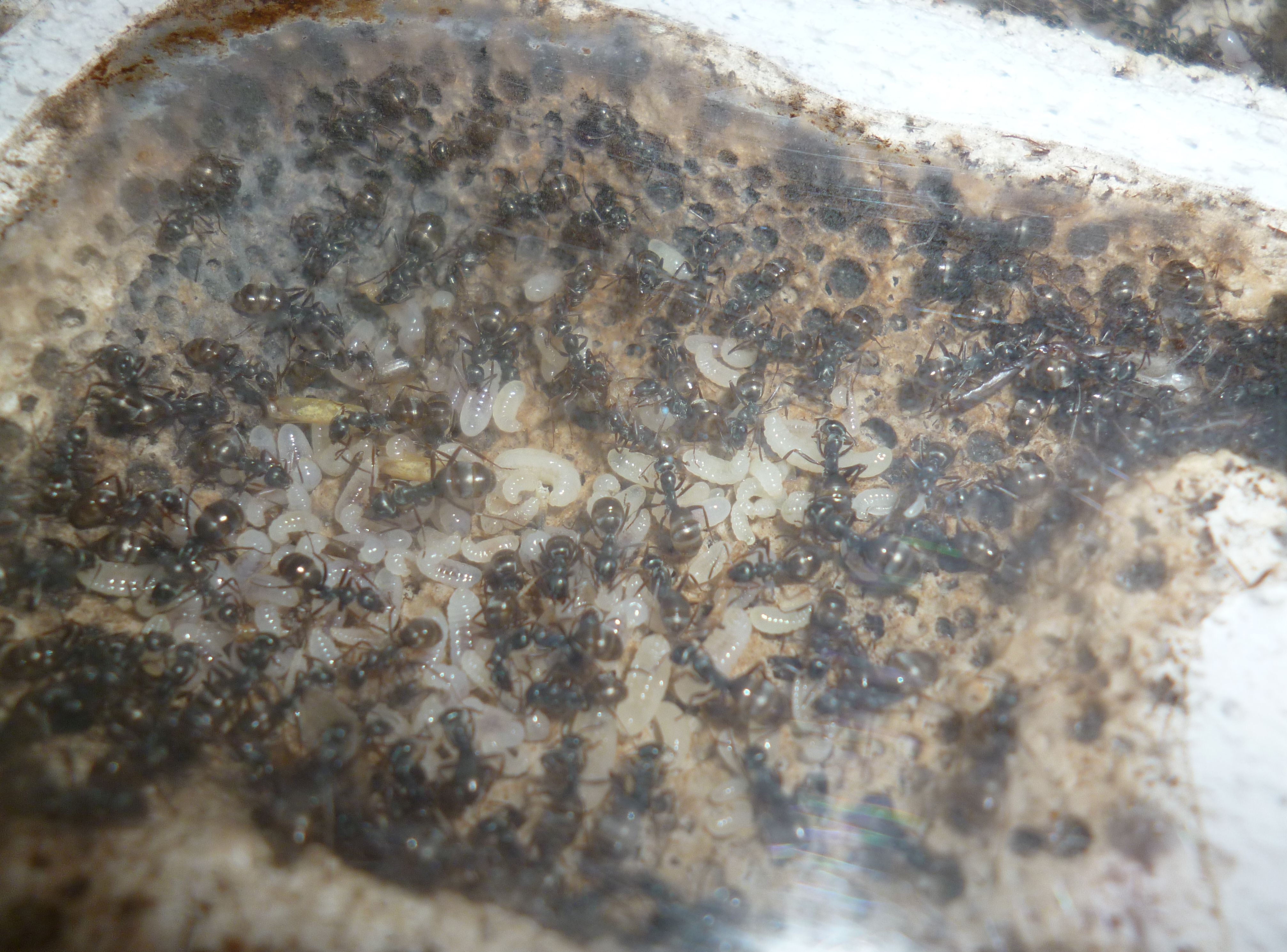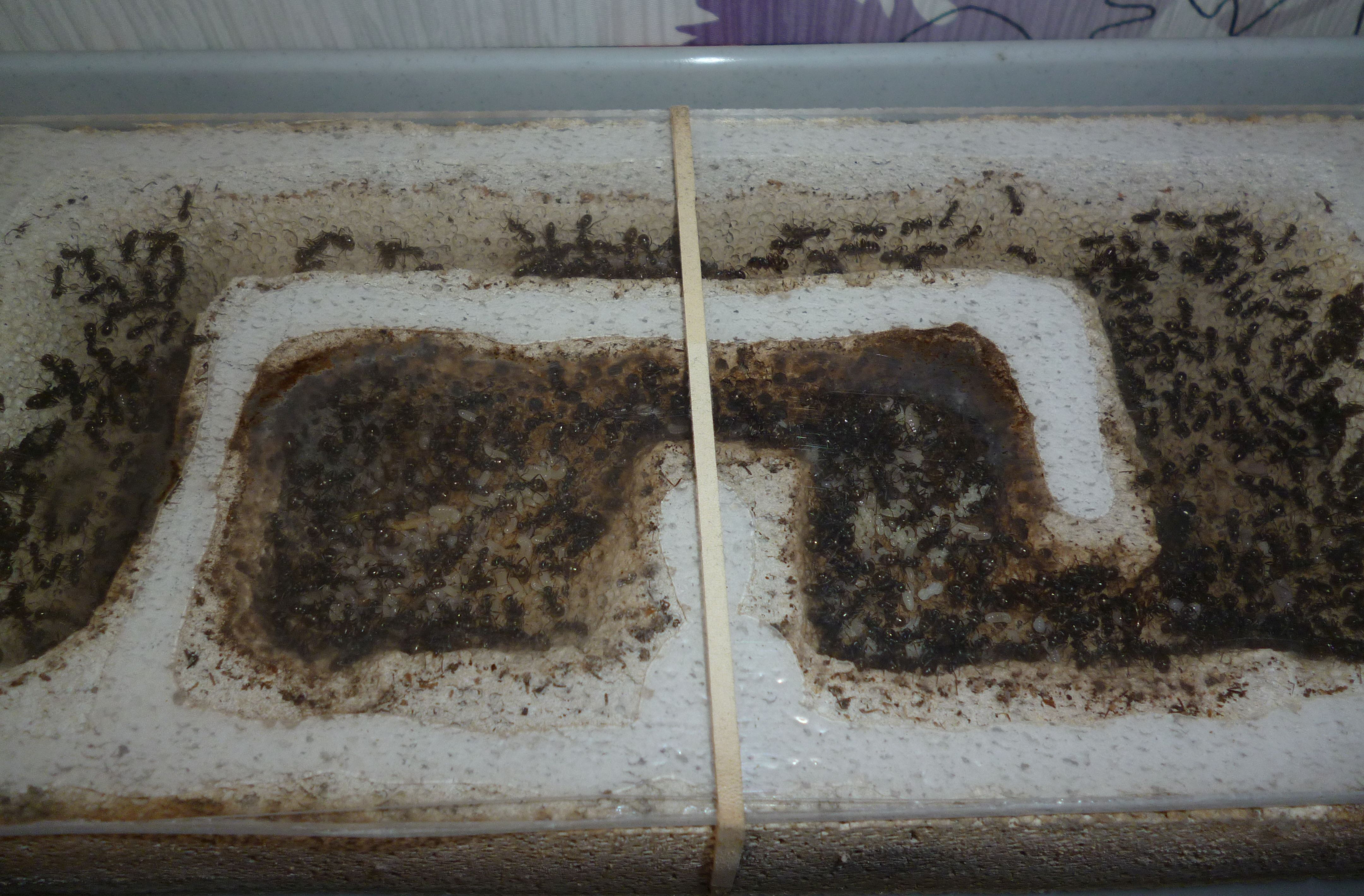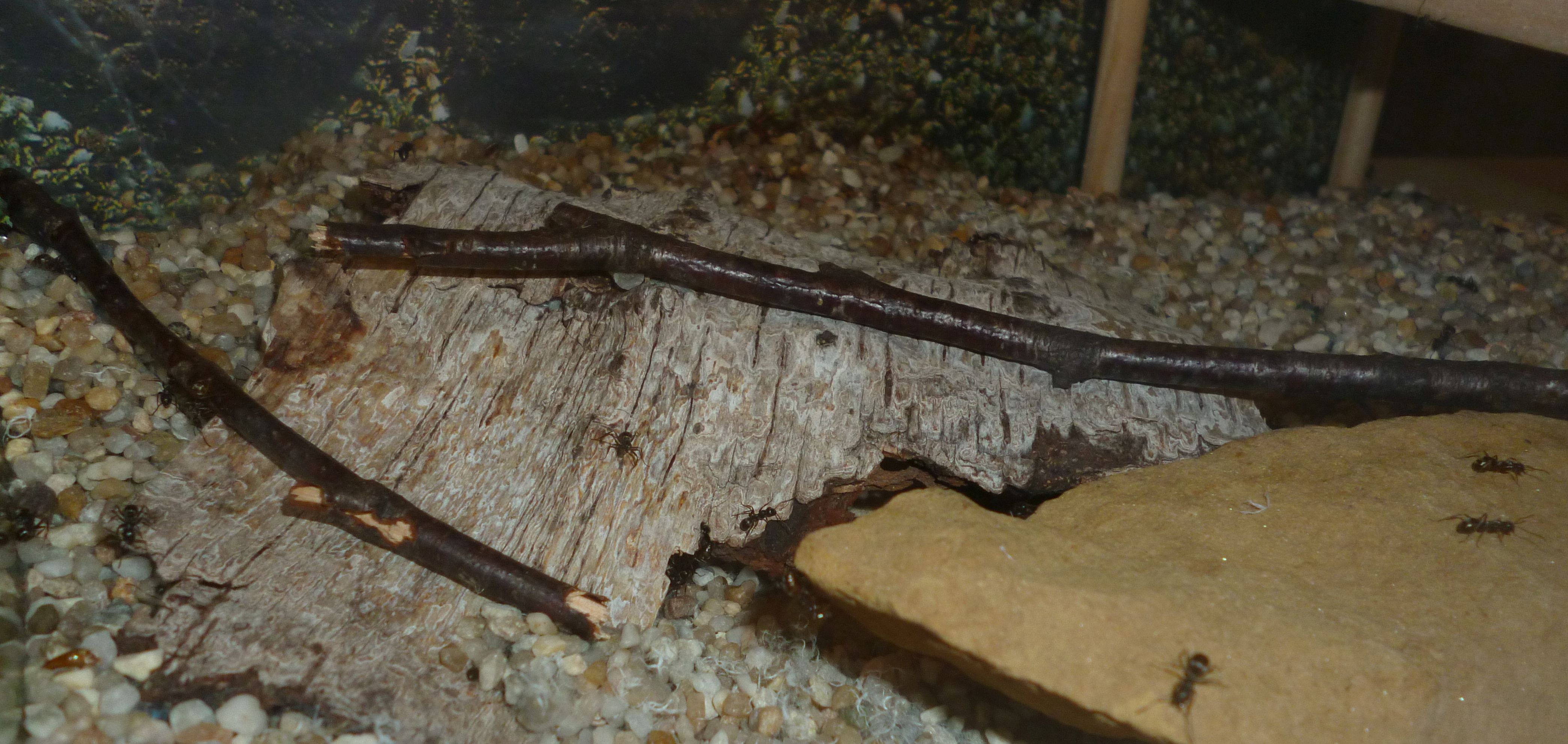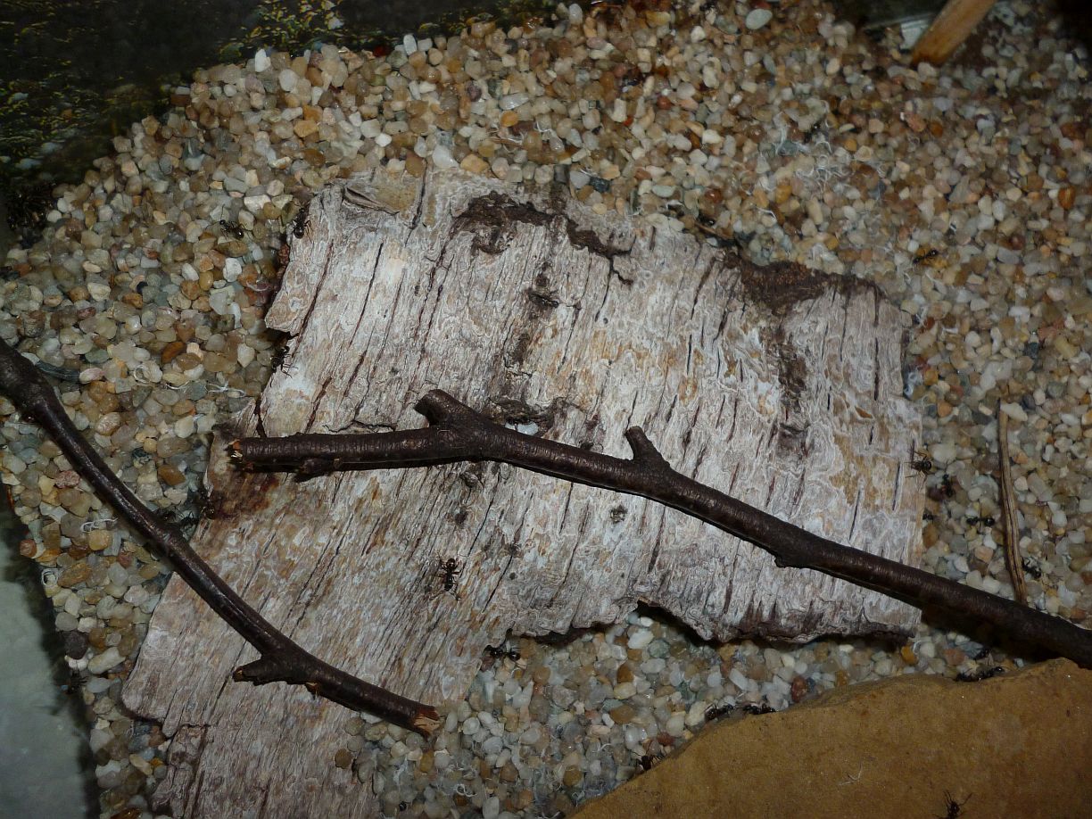 Das Holznest wurde zuletzt bereits in geringem Maße genutzt, während die Ameisen es zu Beginn regelrecht gemieden haben. Die Idee hinter dem Holznest, und der Anordnung zwischen Becken und Ytongnest, soll ja die Situation in der Natur ein Stück weit nachstellen. Dort findet man