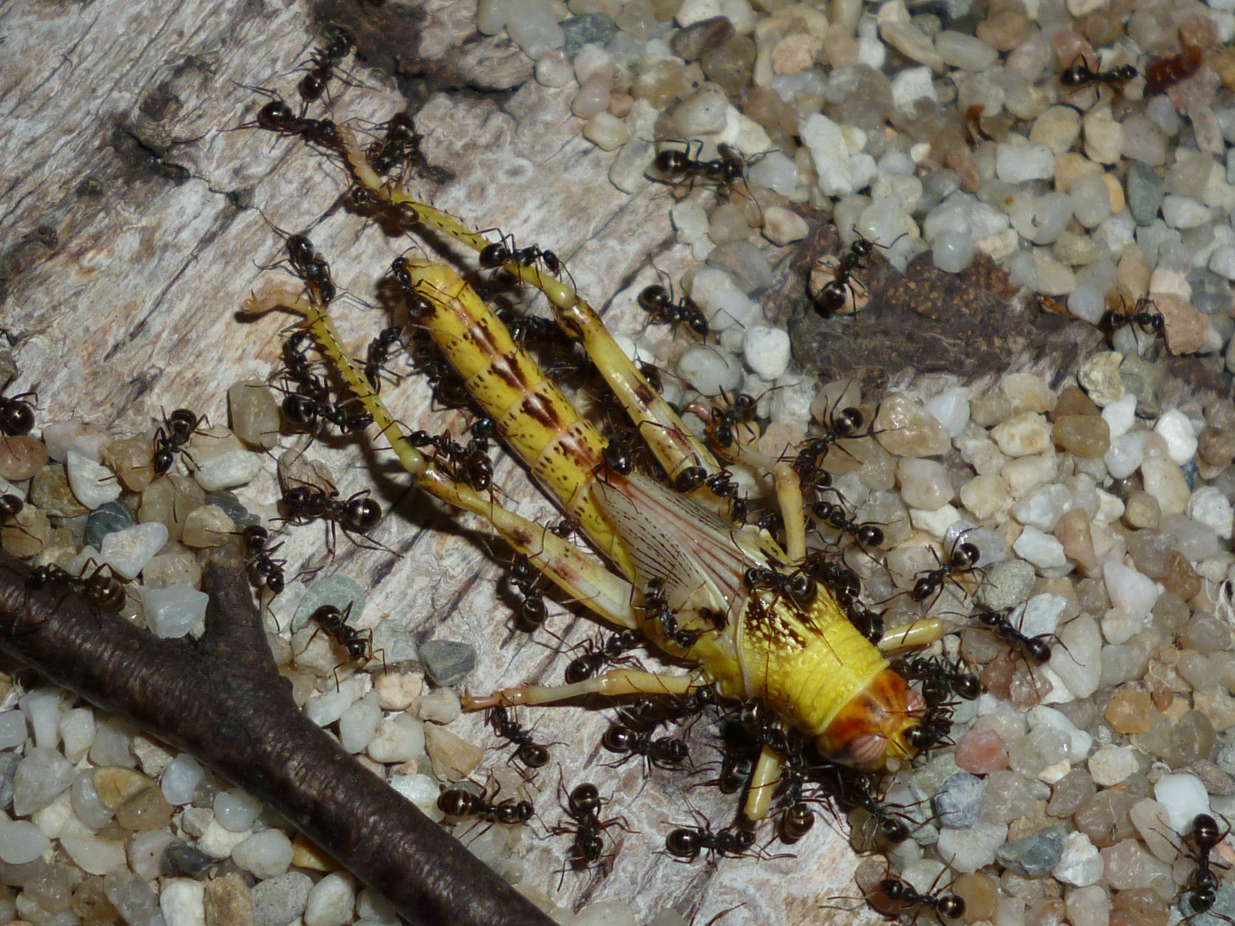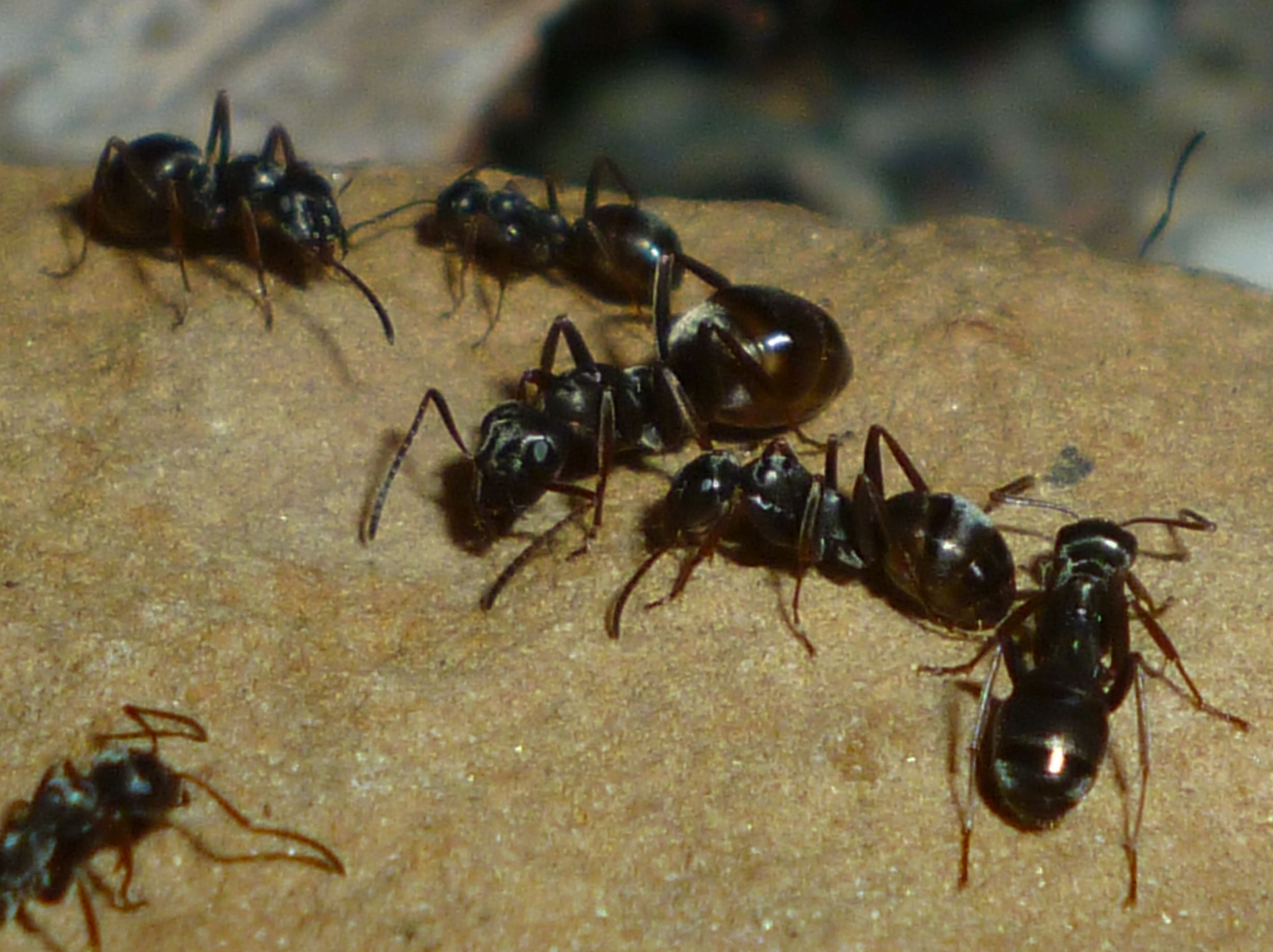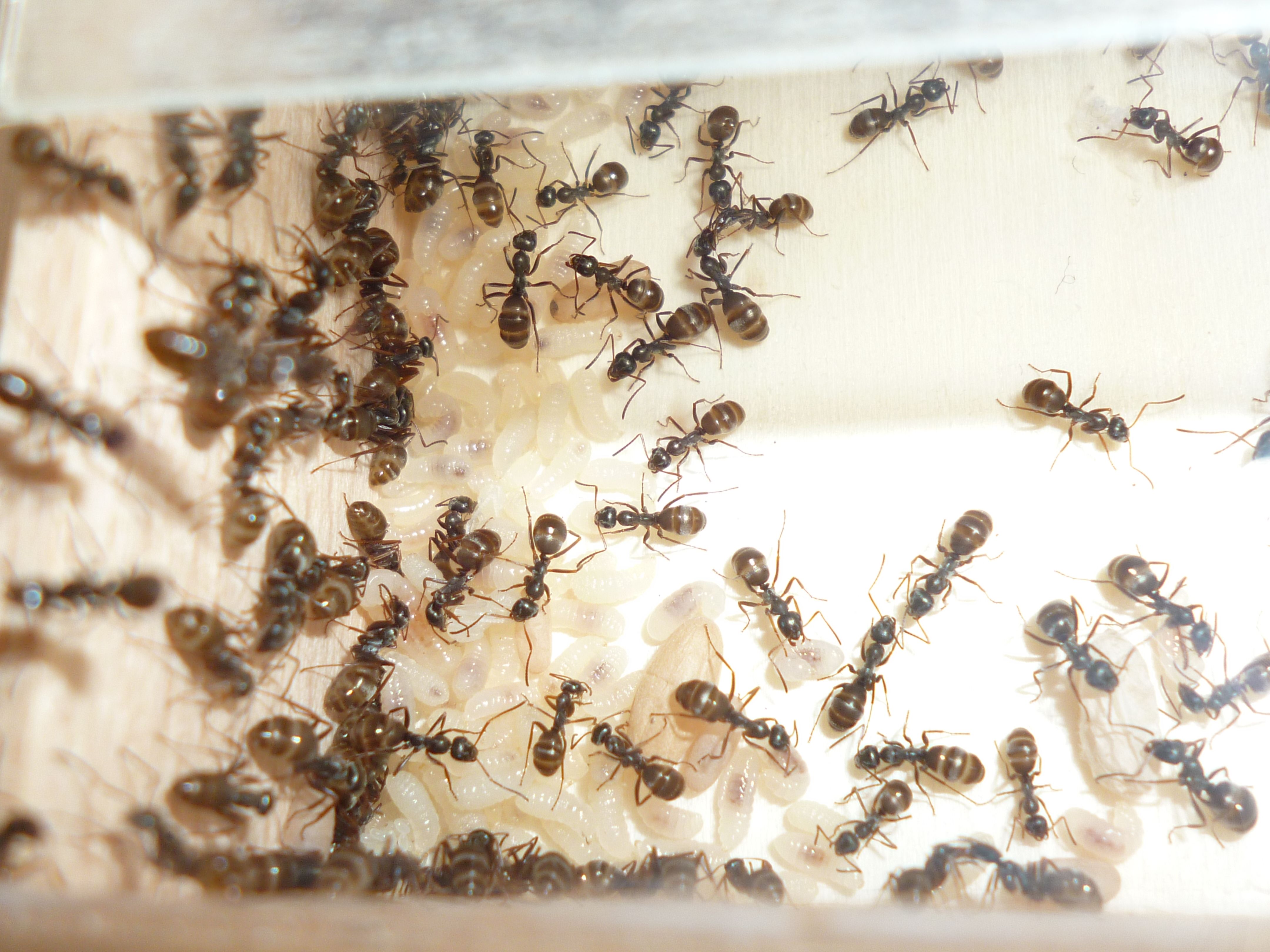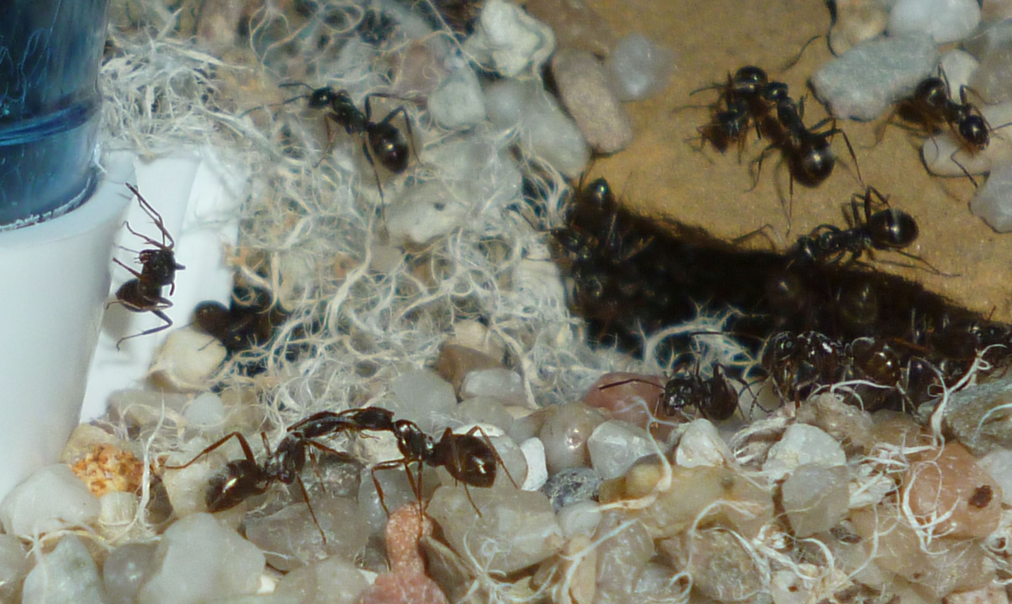Das Holznest wurde zuletzt bereits in geringem Maße genutzt, während die Ameisen es zu Beginn regelrecht gemieden haben. Die Idee hinter dem Holznest, und der Anordnung zwischen Becken und Ytongnest, soll ja die Situation in der Natur ein Stück weit nachstellen. Dort findet man