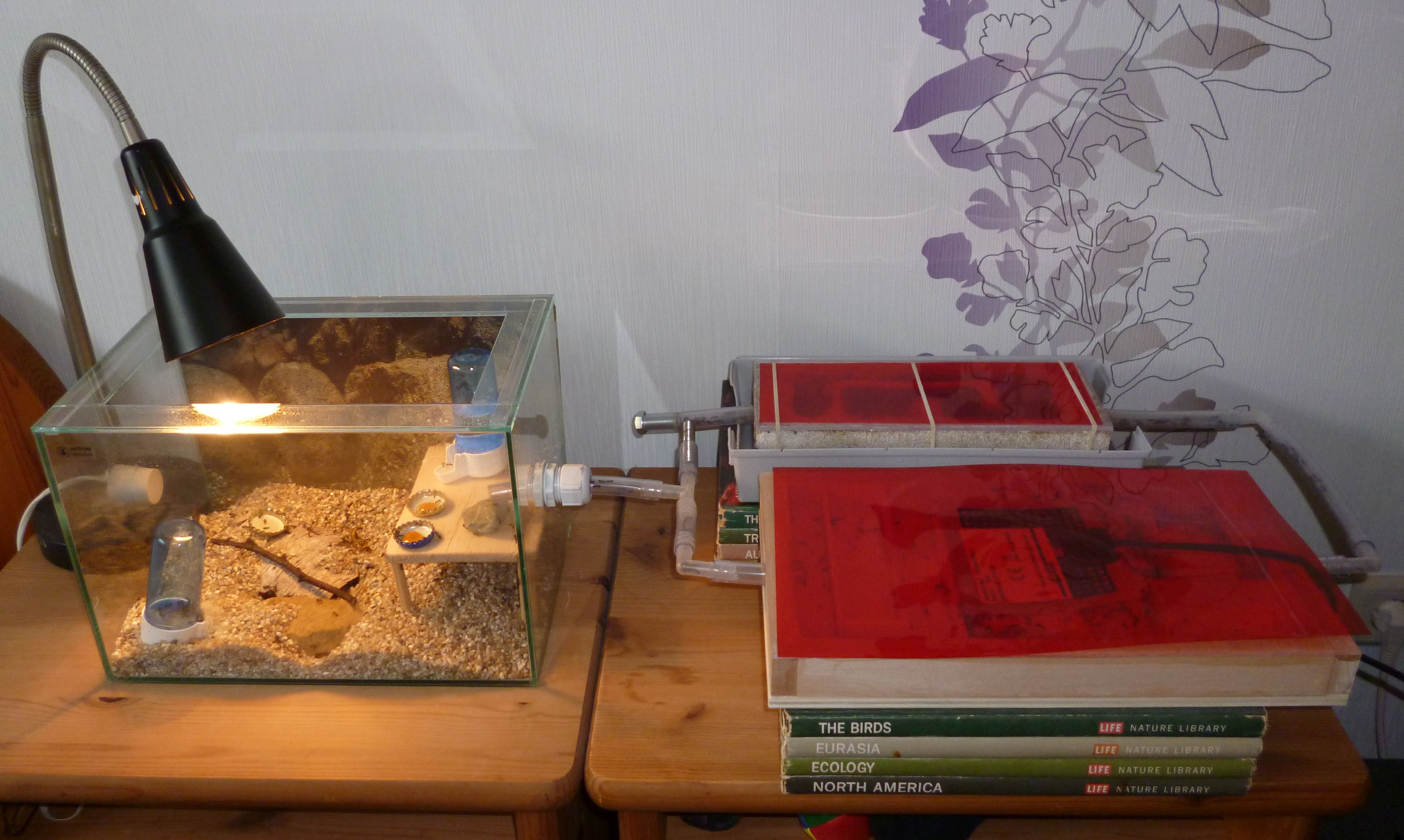 Um dem einen Riegel vorzuschieben, habe ich noch einen Glasrahmen angebracht, welcher von unten reichlich mit Paraffinöl eingestrichen ist. Auch den Ölstreifen am Beckenrand selbst habe ich erneuert. Anders als auf dem Bild liegt normalerweise der Deckel noch zusätzlich auf dem Rahmen.
