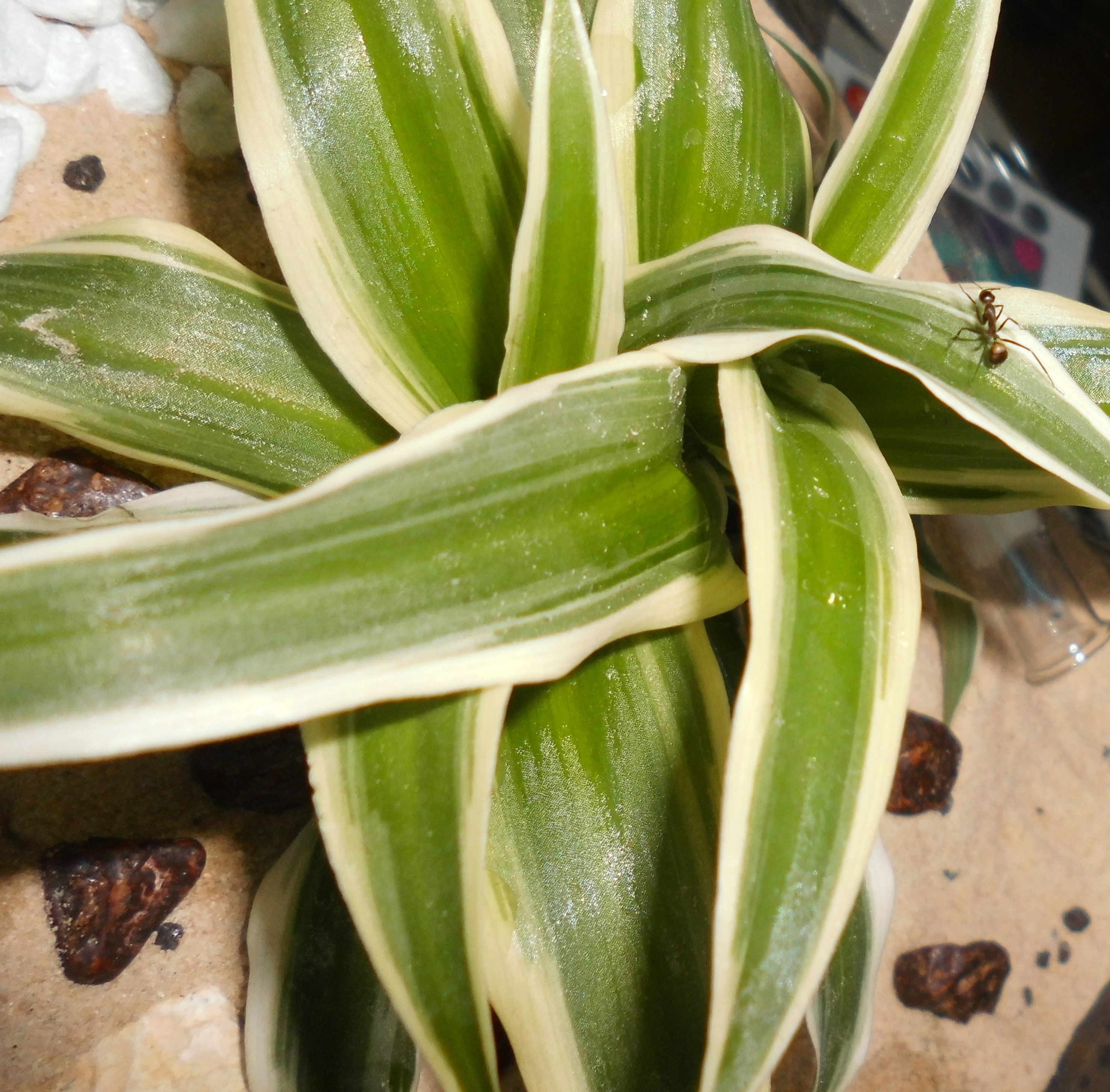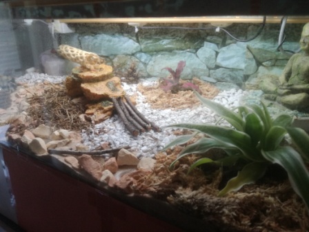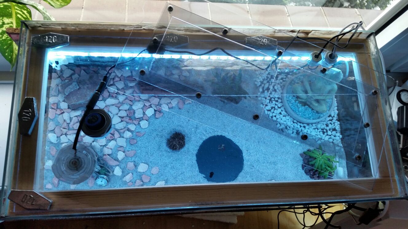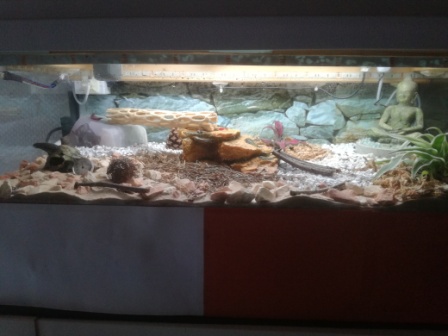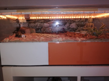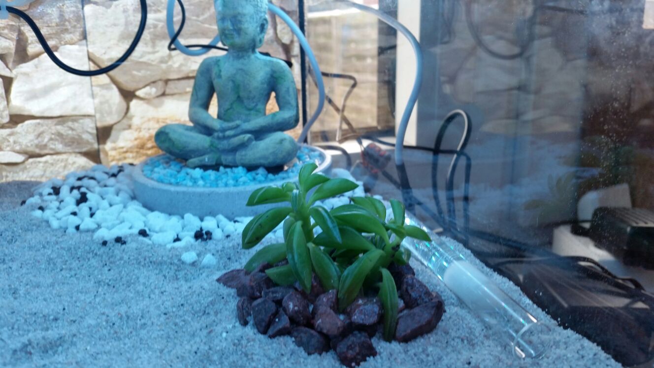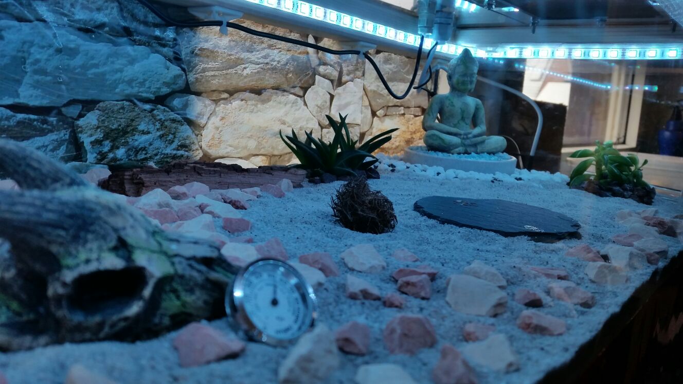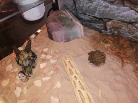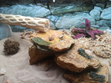Um den Kleinen das Habitat noch wohnlicher zu gestalten, habe ich Ende März den feinen Sand durch Wüstensand (aus der Region Südostasien) und die Flora ersetzt, da die vorherigen Pflanzen den Klimabedingungen nicht gewachsen waren.