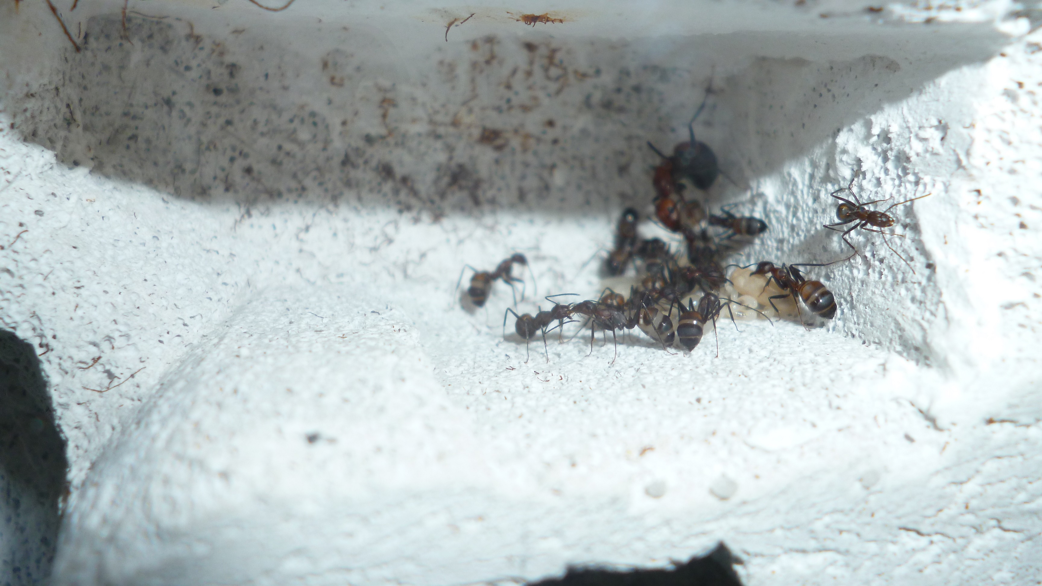 Zur Entwicklung der Kolonie sei noch kurz gesagt, dass sie vermutlich unter zweierlei Formen von Stress litten: Zophobas morio & doppeltem Umzug (aka Reise nach Jerusalem). Weshalb sie wahrscheinlich statt das Nahrungsangebot in der Arena wahrzunehmen, das ein oder andere Ei verspeisten. Jedenfalls habe ich Neuzuwachs in Form von 5 weiteren Arbeiterinnen bekommen, sodass das Volk nun insgesamt 22 Arbeiterinnen verzeichnet. :)