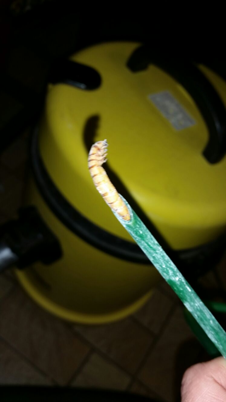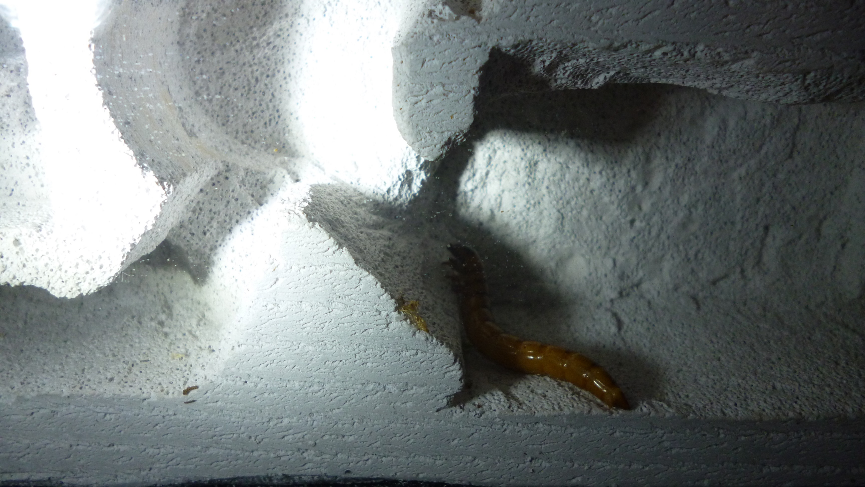 Alle zwei bis 3 Tage gibt es Proteine in Form von Mehlwürmern (alle Stadien), Zophobas Larven oder (hochwertigeres) Katzenfutter mit 97% Fleischanteil.