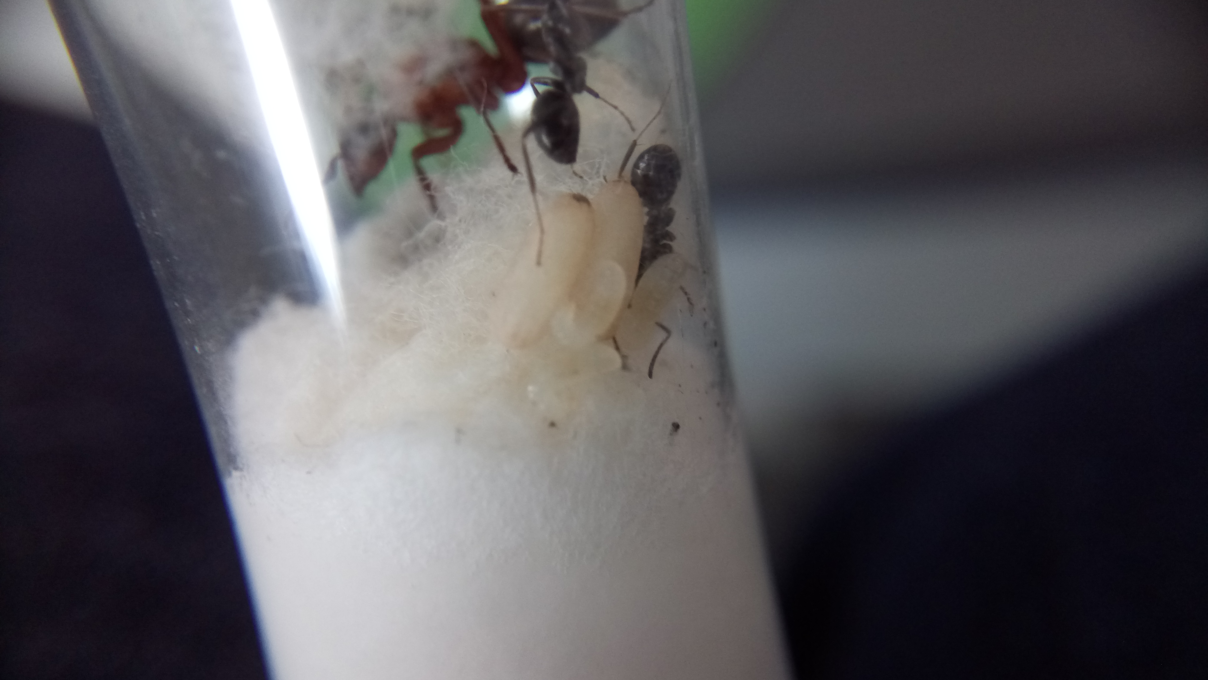 Also mussten Puppen her. Zum Glück halte ich eine kleine Serviformica sp. Kolonie. Ich habe ihnen 10 von ungefähr 20 Puppen weggenommen.