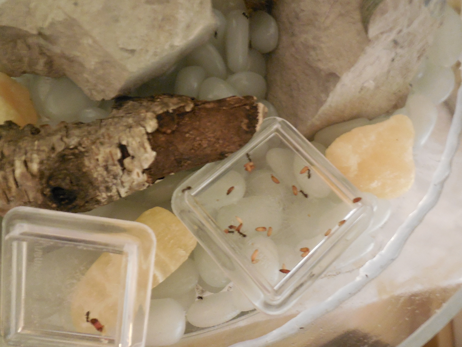 Dennoch klappte es letztendlich, die Nachzügler einzeln in die Farmen zu setzen: mittels Paraffin wurden die Ameisen am Verlassen der jeweiligen Farm gehindert. Wenn es doch zuviele waren, die nach oben drängten, wechselte ich die Farm. Mein Hauptproblem war die Schmalheit der Farmen, ich konnte die Ameisen nicht "reinschnalzen", sondern nur an den Silikonresten, die mal als Paraffinabtropfsperre gedacht waren, abstreifen. Diesmal dachte auch daran, Zeitungen drunterzu legen, damit Flüchtlinge nicht wieder auf meiner schwarzmarmorfarbenen Küchenplatte in der Unsichtbarkeit verschwinden