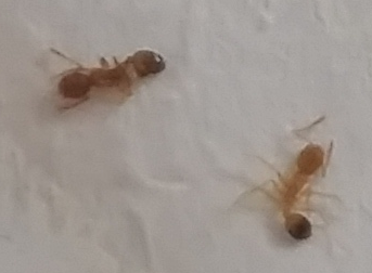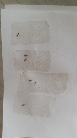 Ich habe das Gefühl, sie werden schwächer. Gestern habe ich zwei besonders kleine Exemplare gefangen. Sie hatten sehr feine Körper und waren unter 2 mm groß, während die meisten locker zwischen 2 und 2,5 mm kratzen. Außerdem bewegen sie sich langsamer und sie wirken absolut nicht mehr so forsch und selbstbewusst wie rund um ihren Einzug. Eine, die kleinste und hellste von allen, die ich gestern gefangen habe, wirkte sogar wie benommen. Sie reagierte kaum und lief total langsam, zappelte auch nicht, als ich sie am Tesa hatte. Heute habe ich nur eine Ameise gefangen, die ebenfalls sehr klein ist. Sie war auch nicht mehr auf der Küche, sondern lief an der Wand. Und sie war alleine. Also scheint es sich um eine Sucherin zu handeln, solche habe ich schon seit Tagen nicht mehr gesehen.