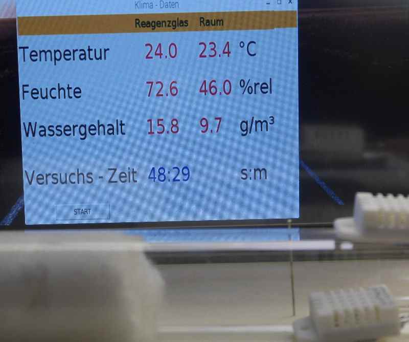 Ergänzt werden die Werte durch die absolute Feuchtigkeit in g/m³ und die Versuchszeit in Stunden und Minuten.