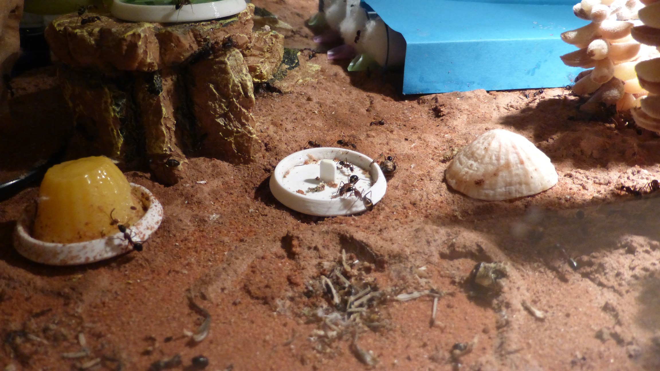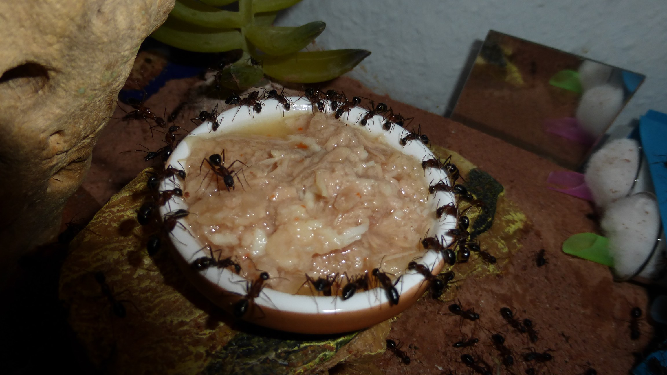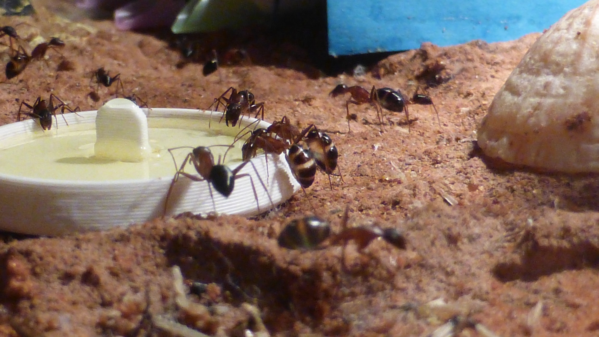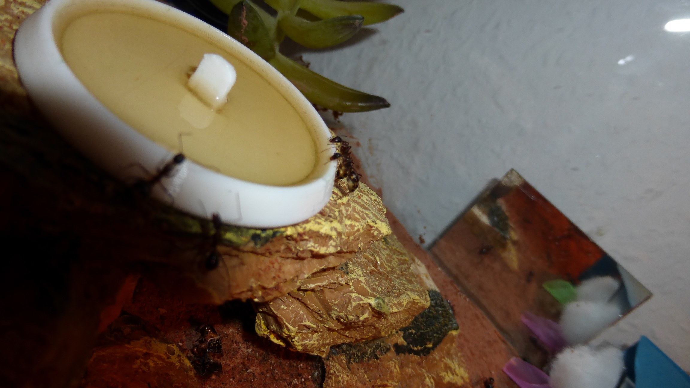 Nach einer interessante Diskussion ĂĽber den Zuckergehalt verschiedener FlĂĽssigkeiten auf Formiculture hab ich mal angefangen Traubenzucker und die Ahronsirupmischung zu geben und den Ameisen scheint das sehr zu gefallen.