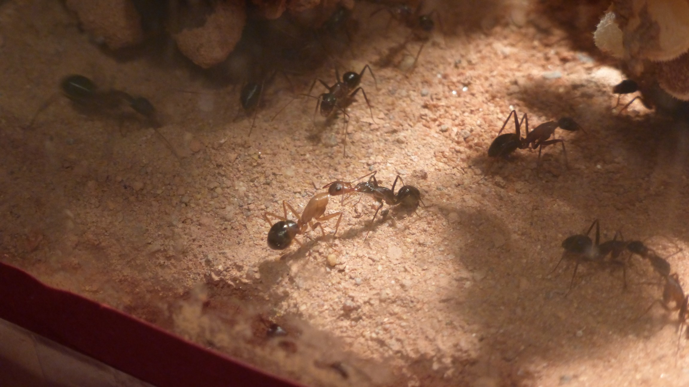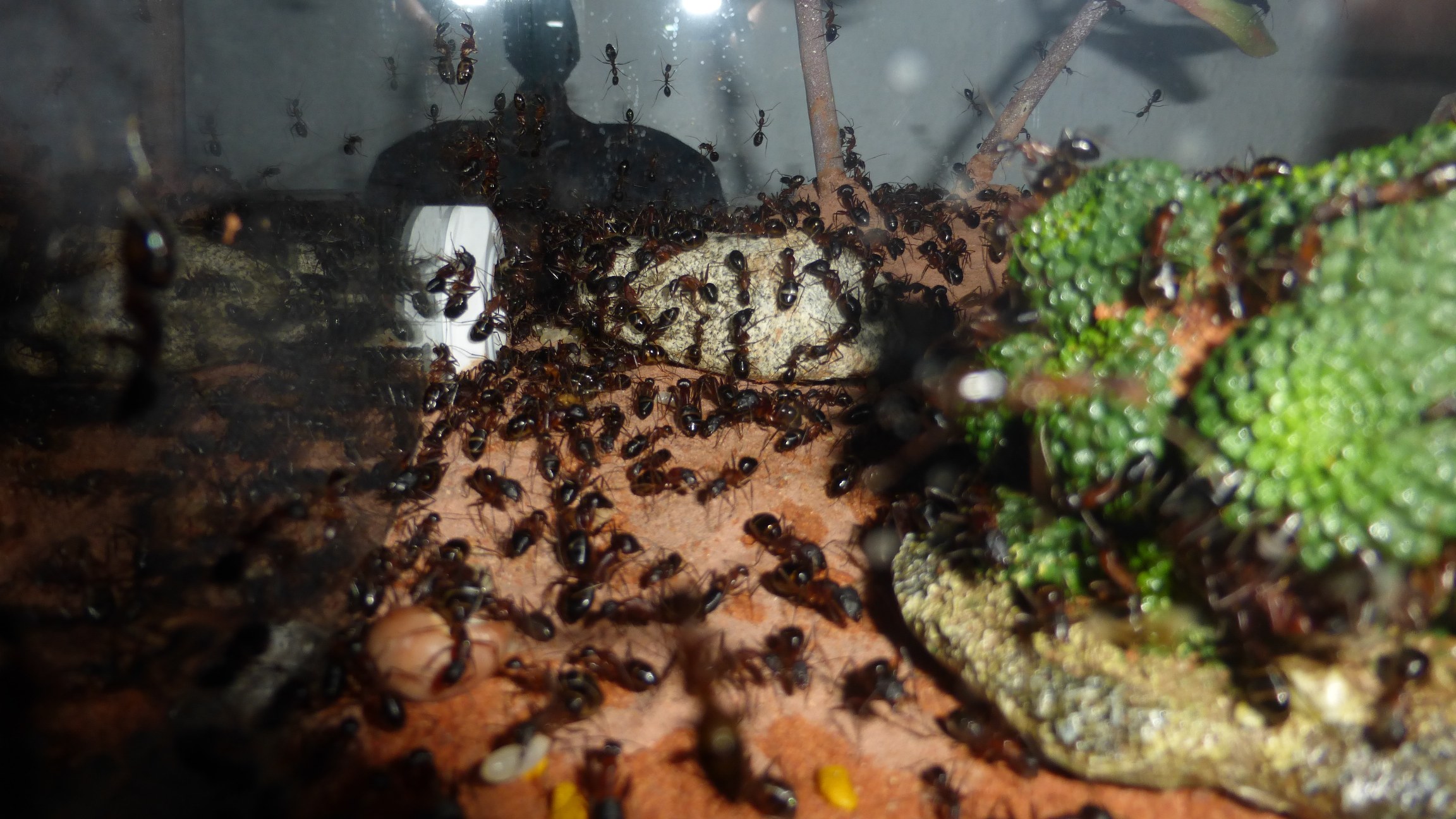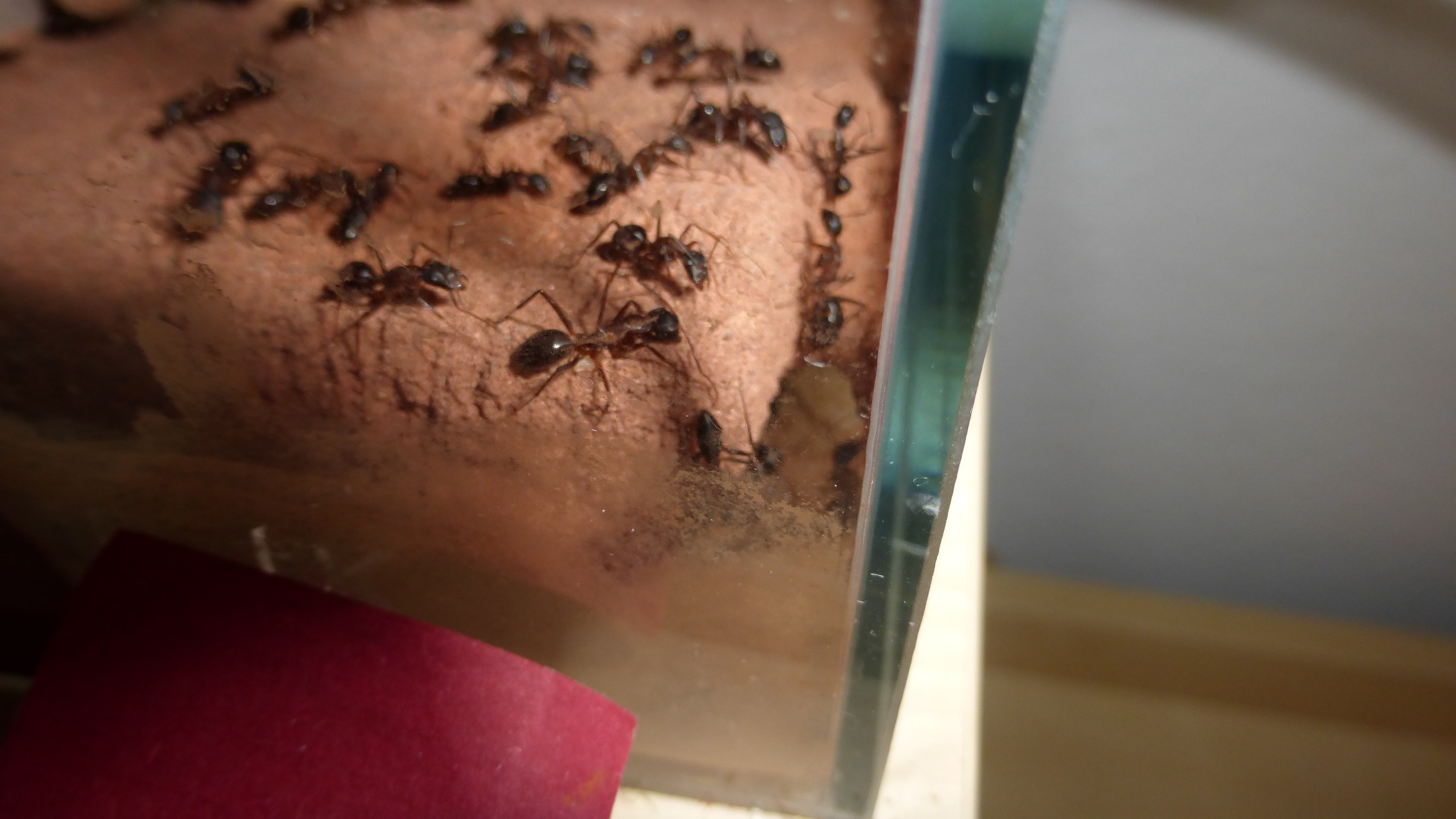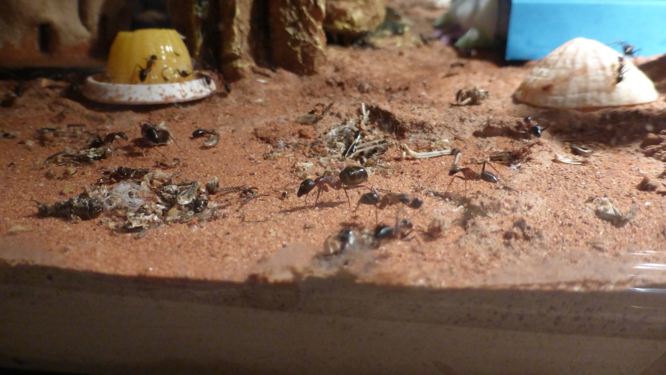 Sonnenbaden mögen sie noch immer, wobei mir aufgefallen ist, dass sich mehr Ameisen in der Arena befinden, wenn ich die Lampe ein paar Tage auslasse. Das dürfte aber wohl eher damit zu tun haben, dass sich die Ameisen generell an ungestörten Orten ansammeln.