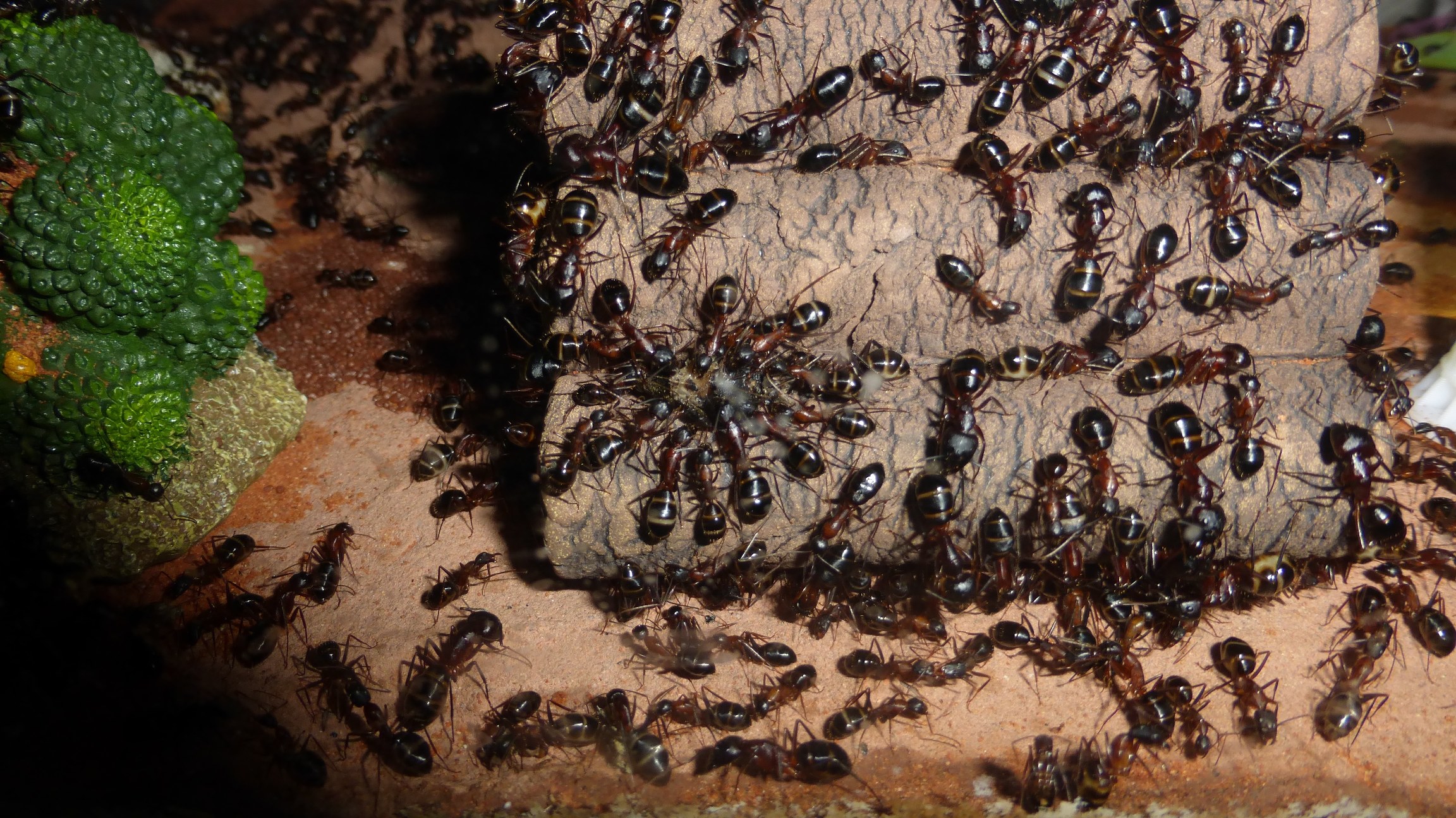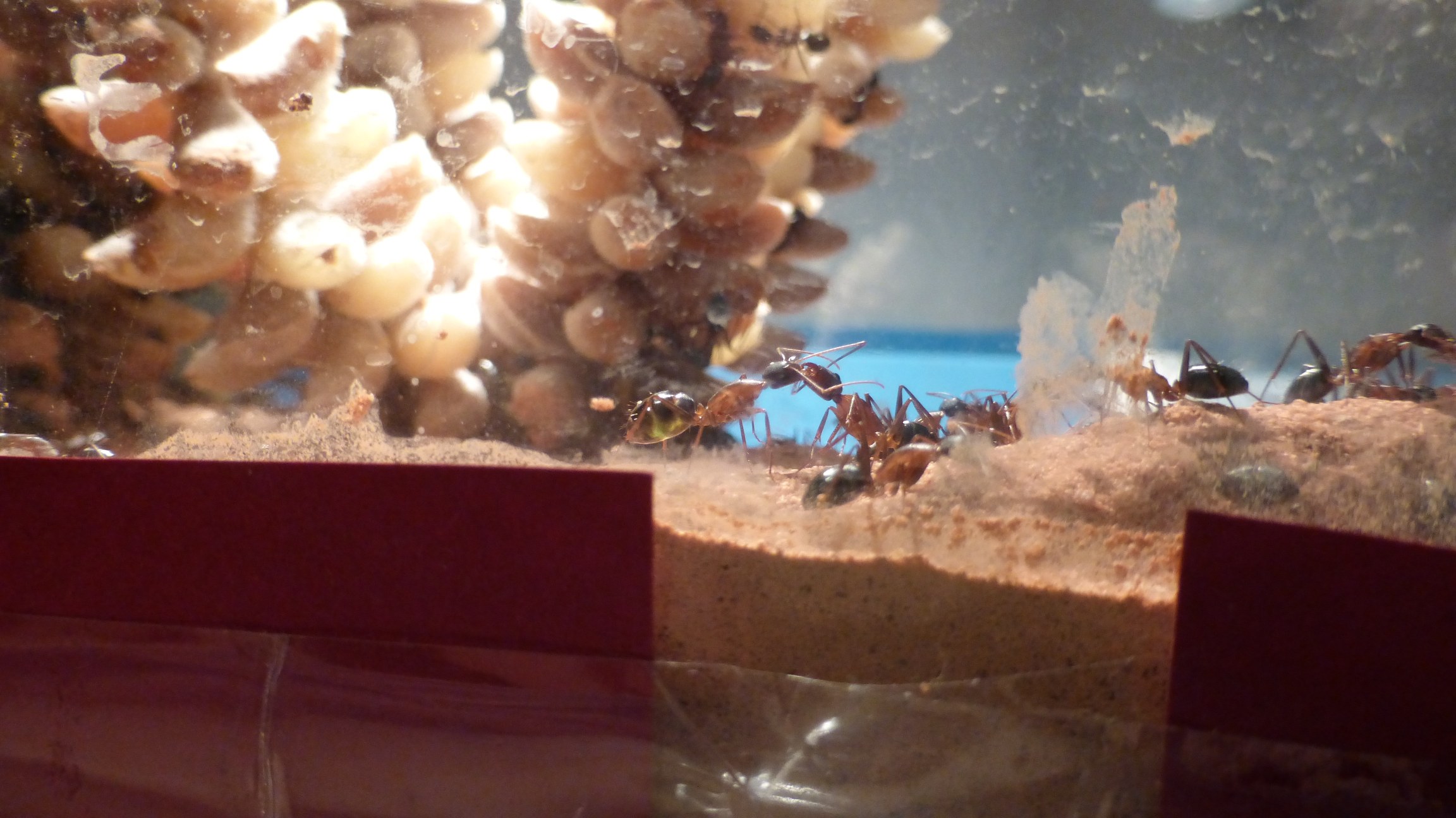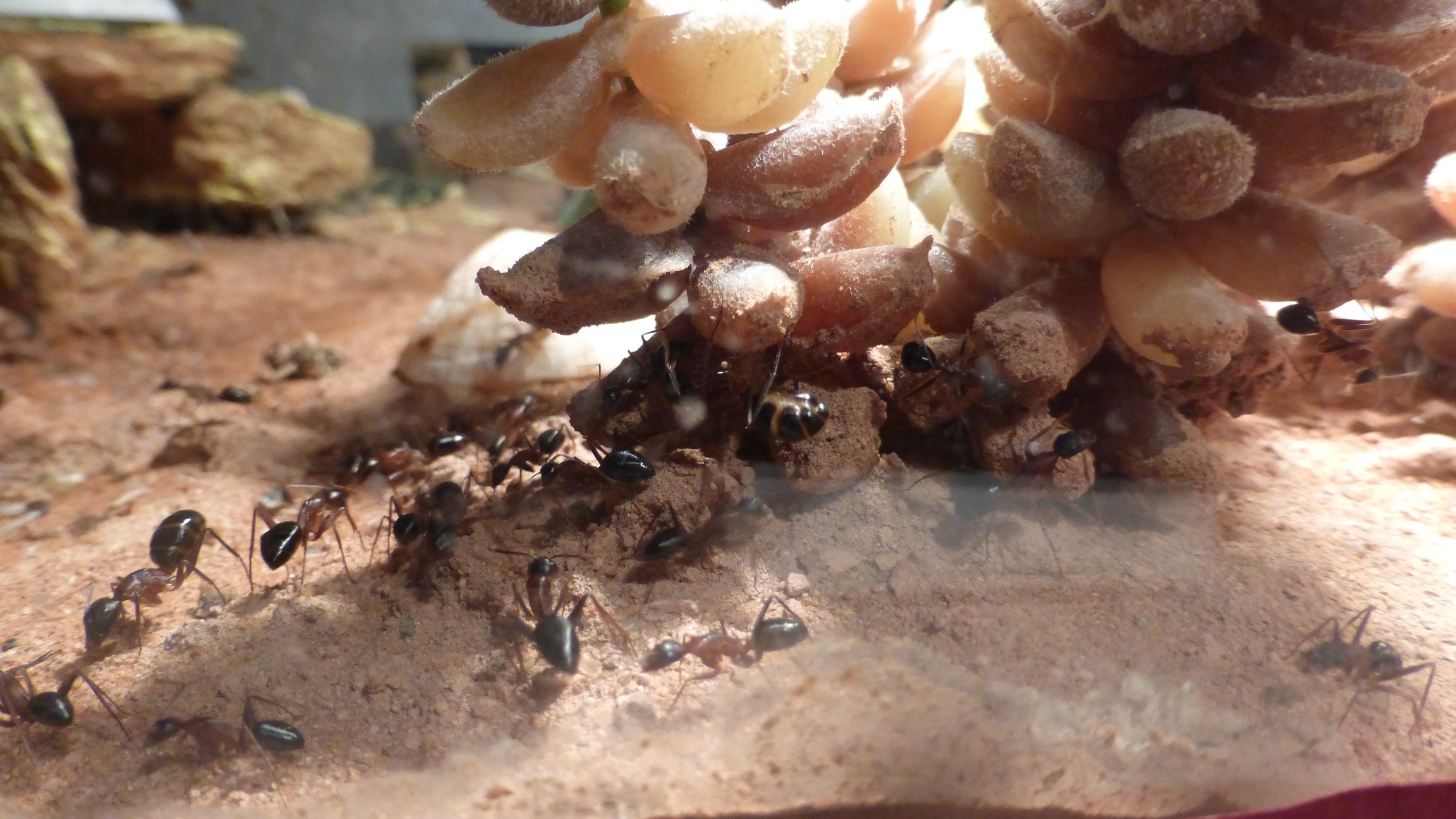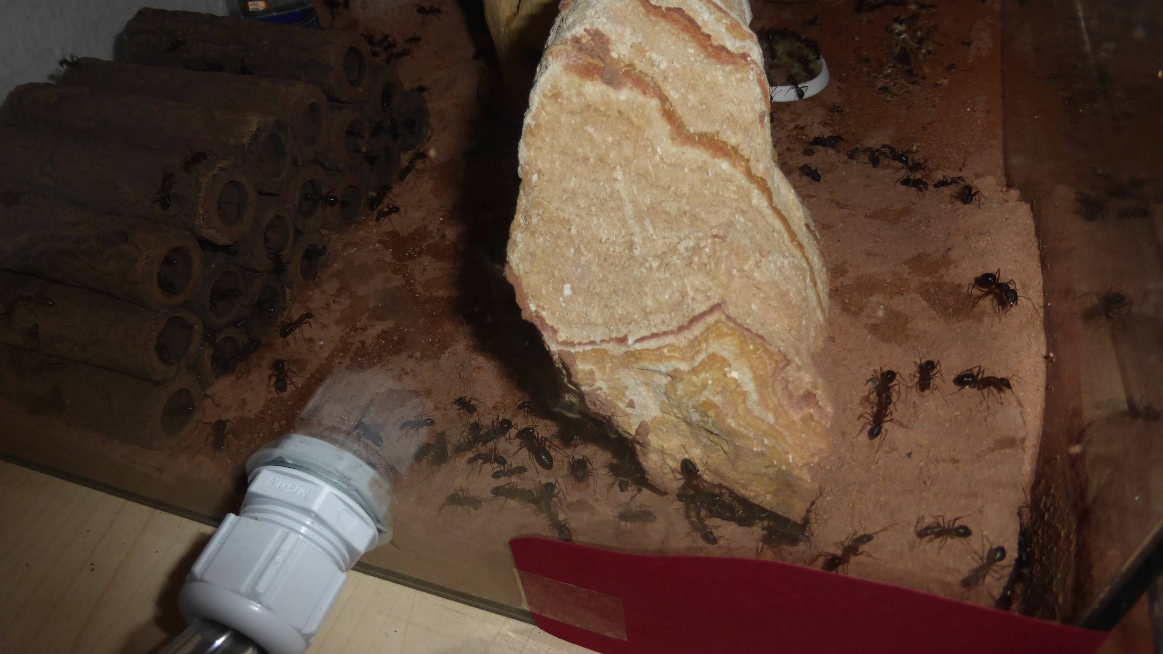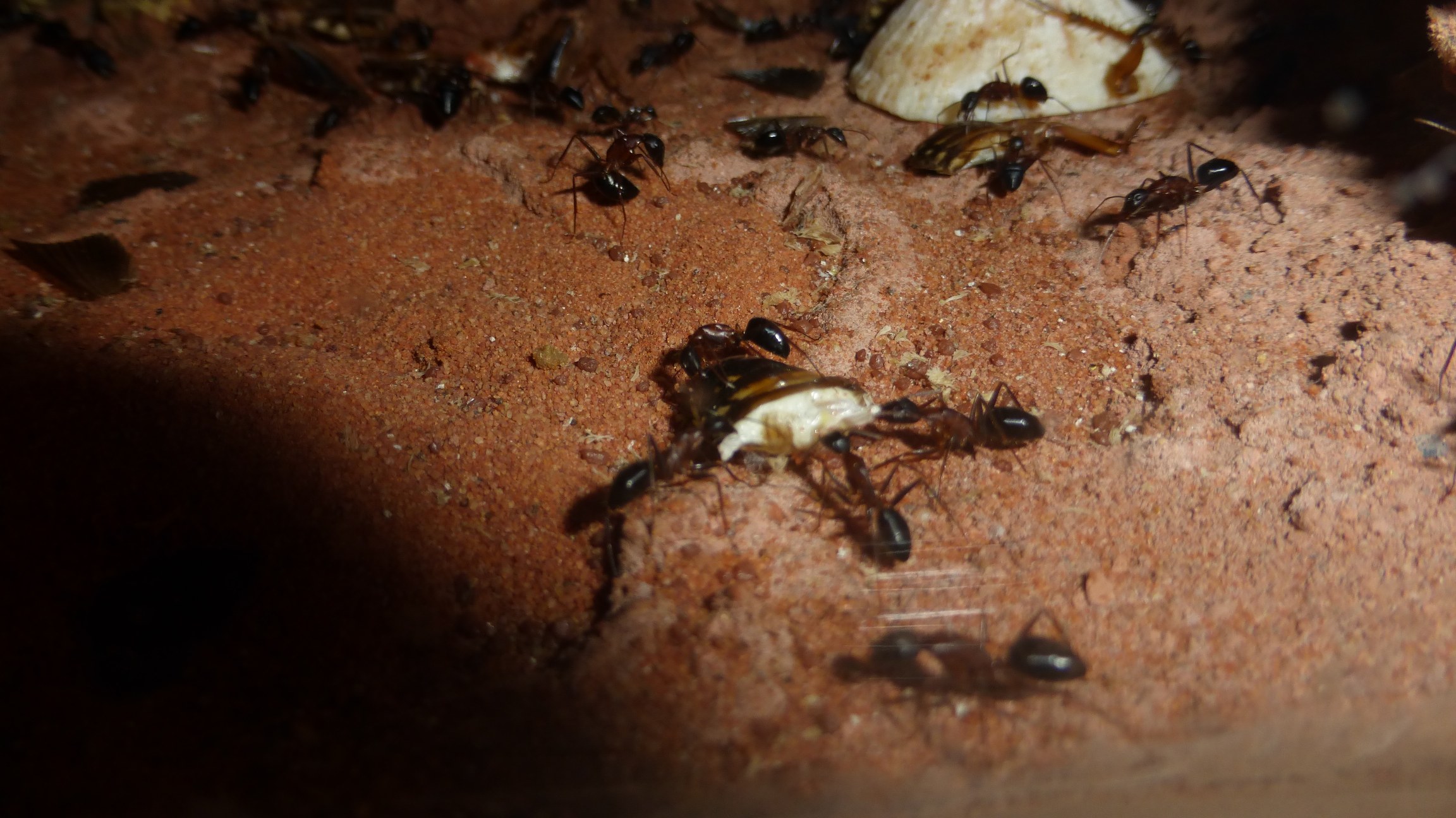 Sonnenbaden mögen sie noch immer, wobei mir aufgefallen ist, dass sich mehr Ameisen in der Arena befinden, wenn ich die Lampe ein paar Tage auslasse. Das dürfte aber wohl eher damit zu tun haben, dass sich die Ameisen generell an ungestörten Orten ansammeln.