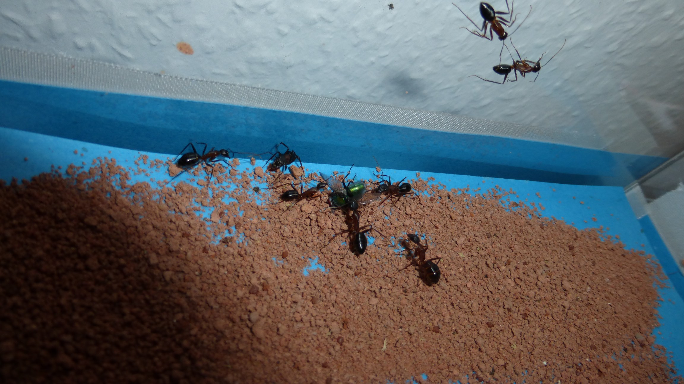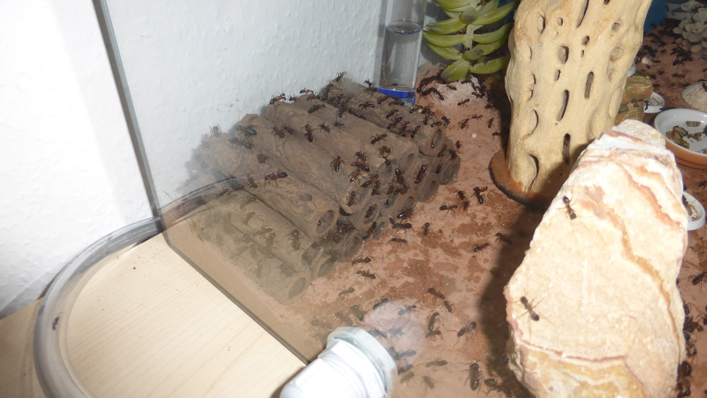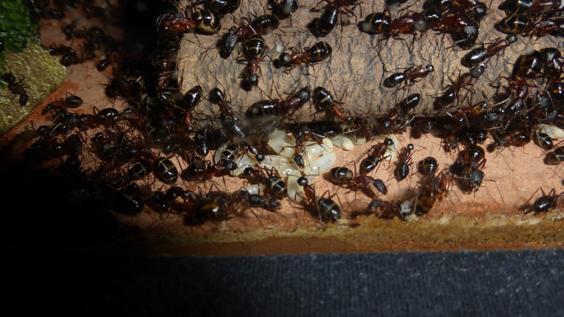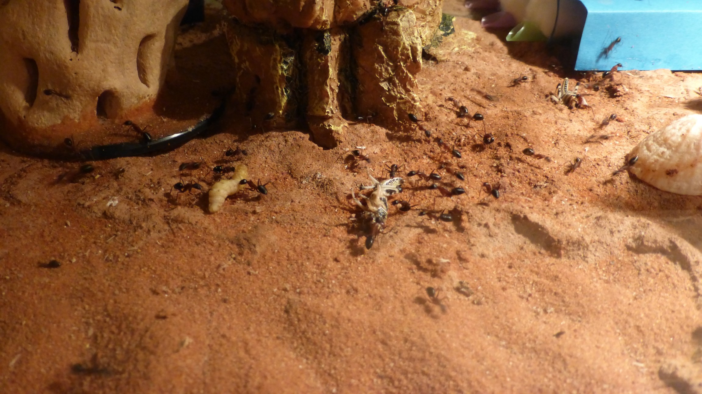 Sonnenbaden mögen sie noch immer, wobei mir aufgefallen ist, dass sich mehr Ameisen in der Arena befinden, wenn ich die Lampe ein paar Tage auslasse. Das dürfte aber wohl eher damit zu tun haben, dass sich die Ameisen generell an ungestörten Orten ansammeln.
