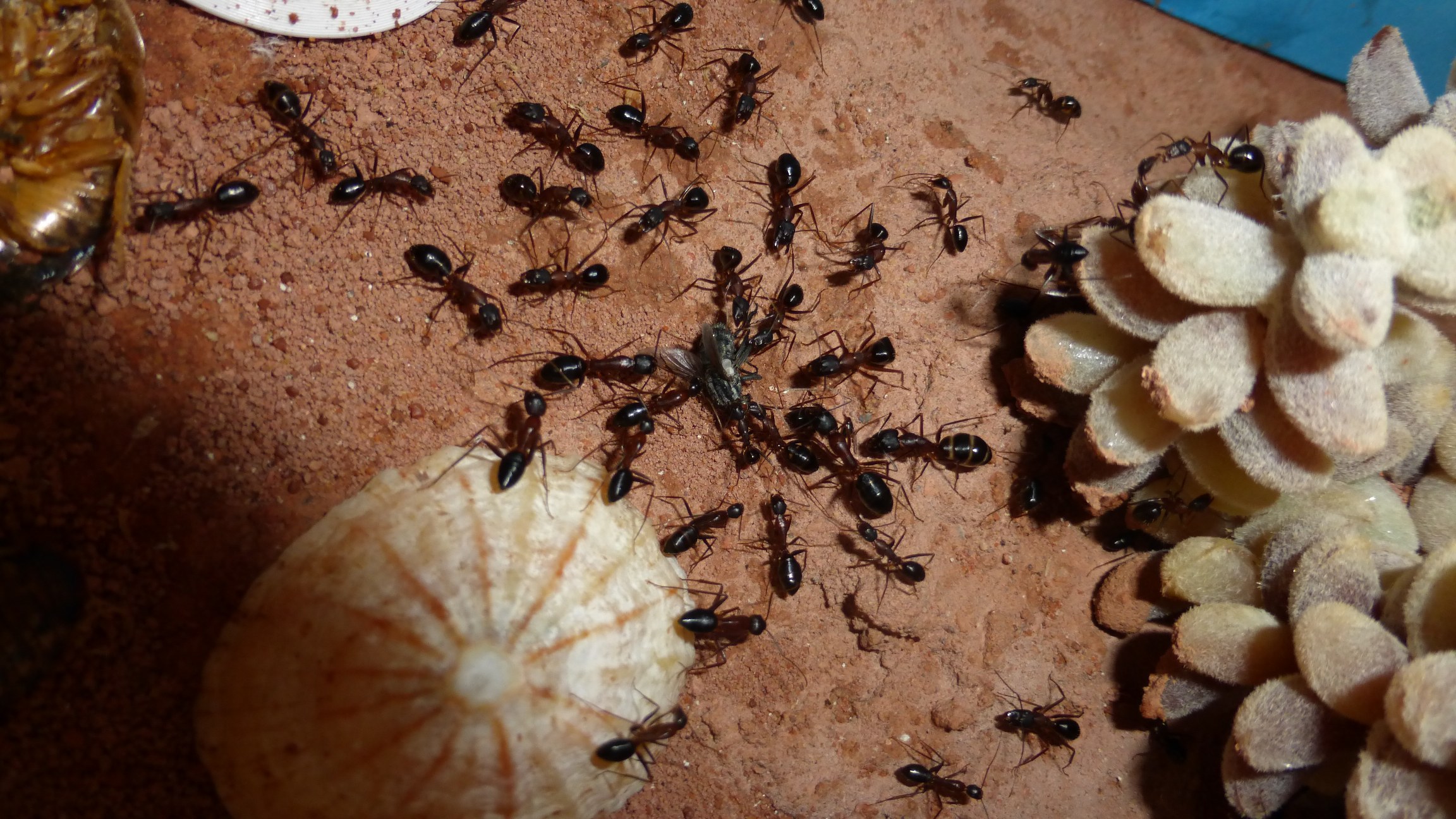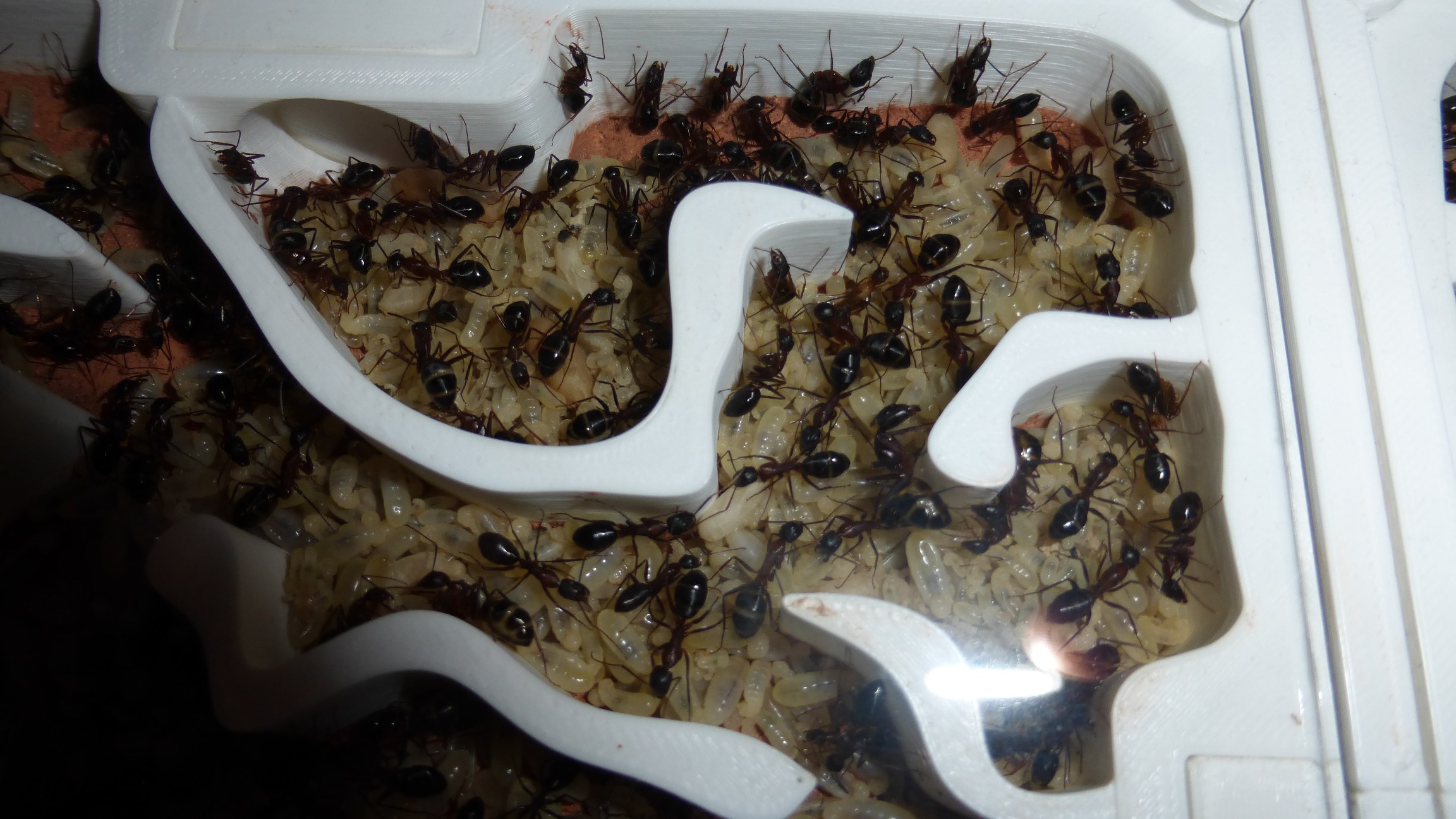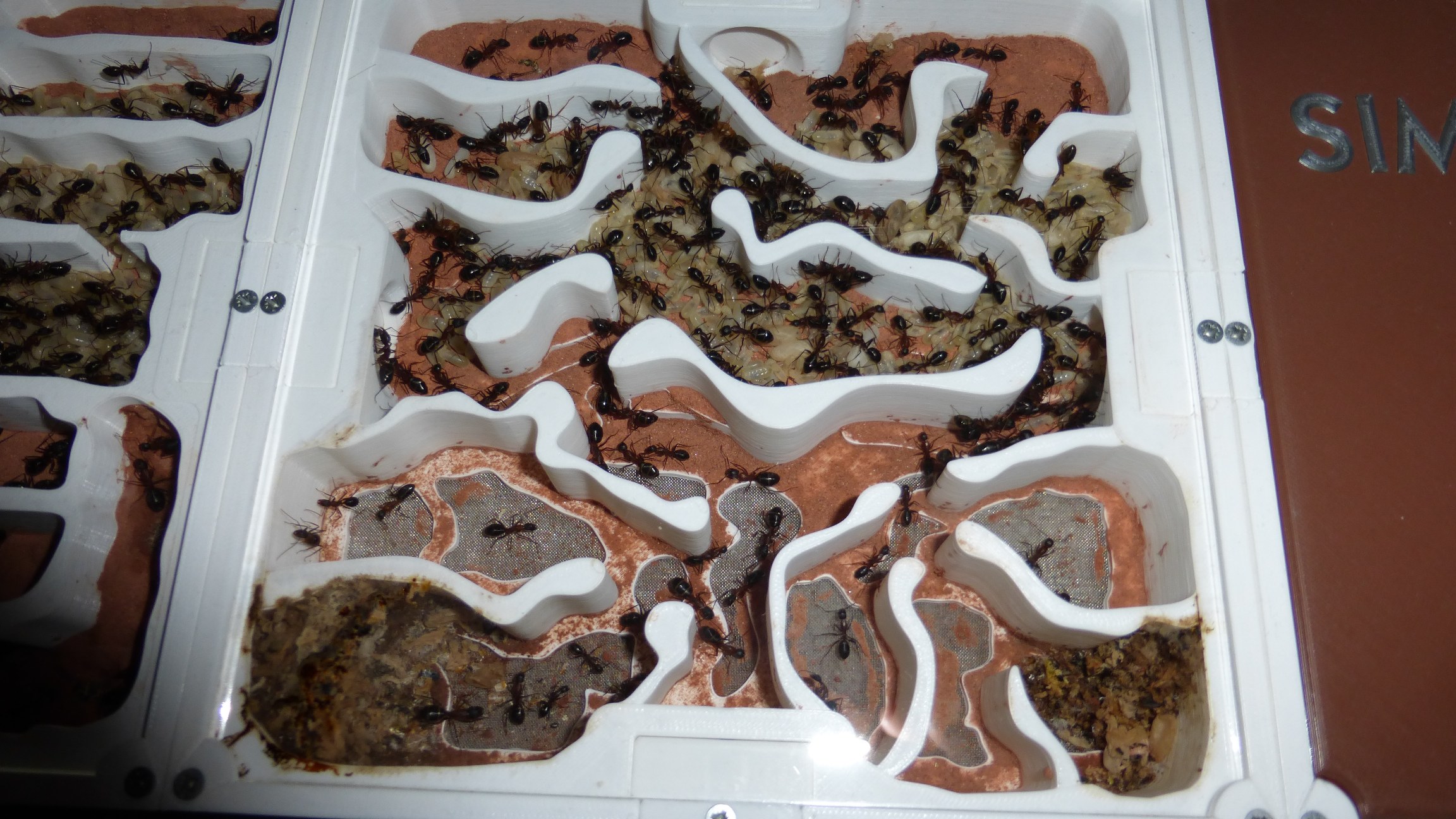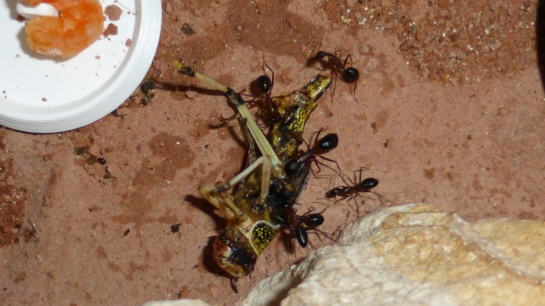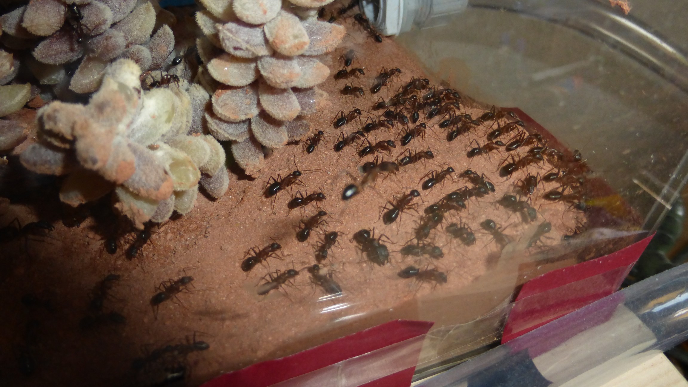 Sonnenbaden mögen sie noch immer, wobei mir aufgefallen ist, dass sich mehr Ameisen in der Arena befinden, wenn ich die Lampe ein paar Tage auslasse. Das dürfte aber wohl eher damit zu tun haben, dass sich die Ameisen generell an ungestörten Orten ansammeln.