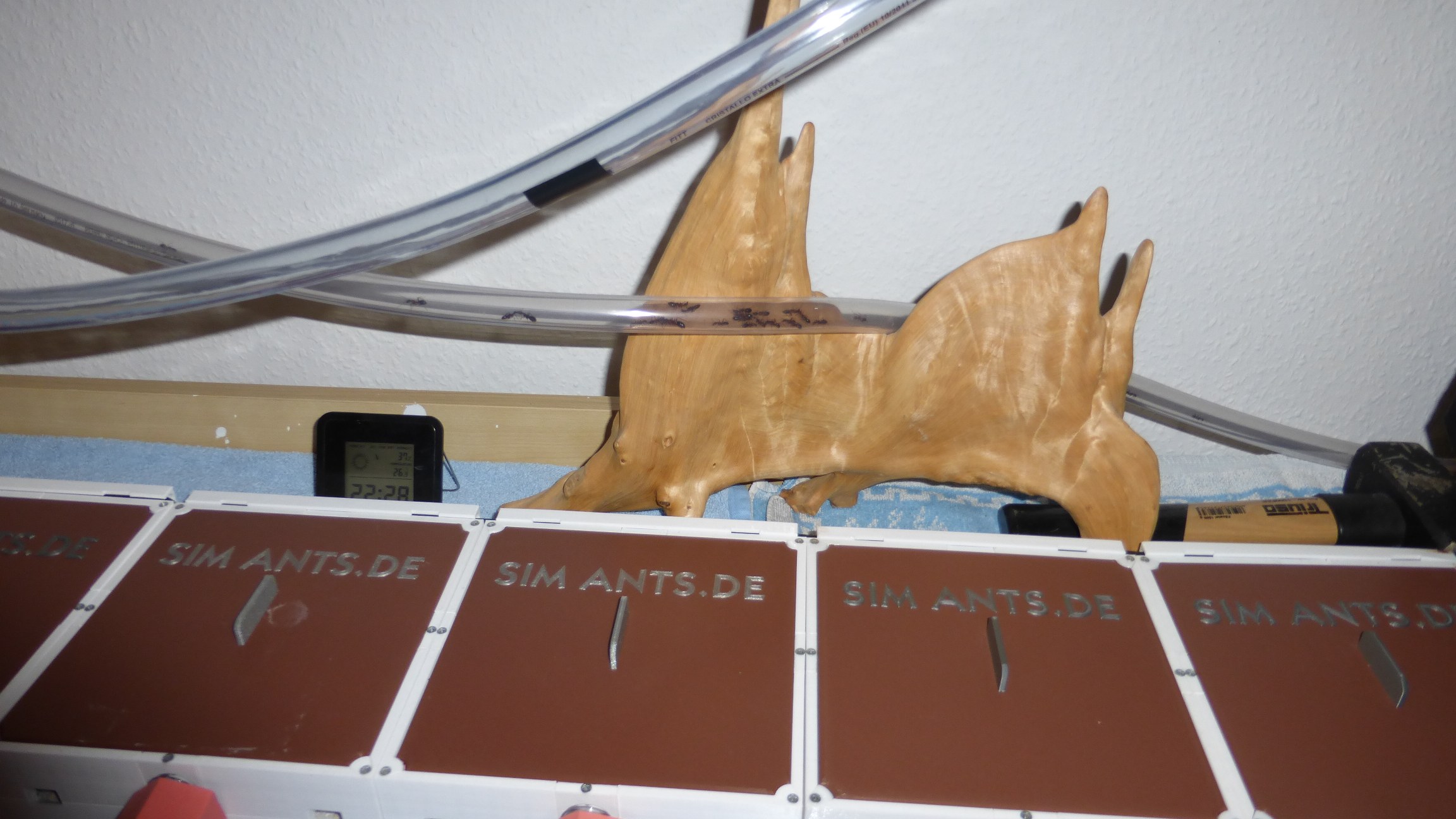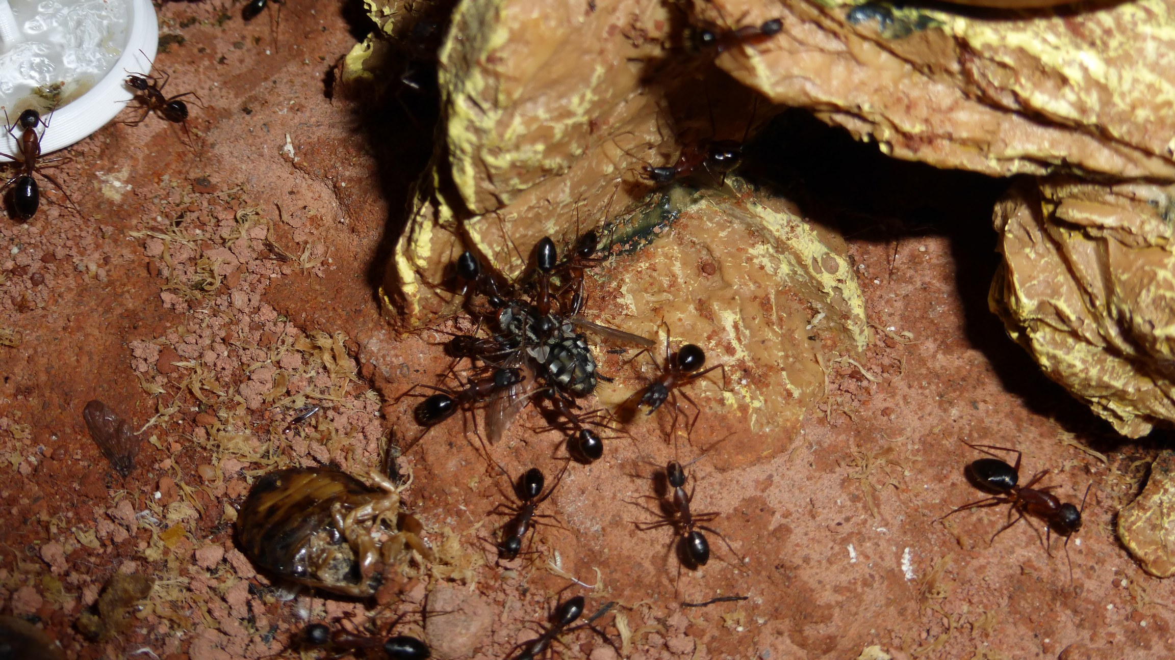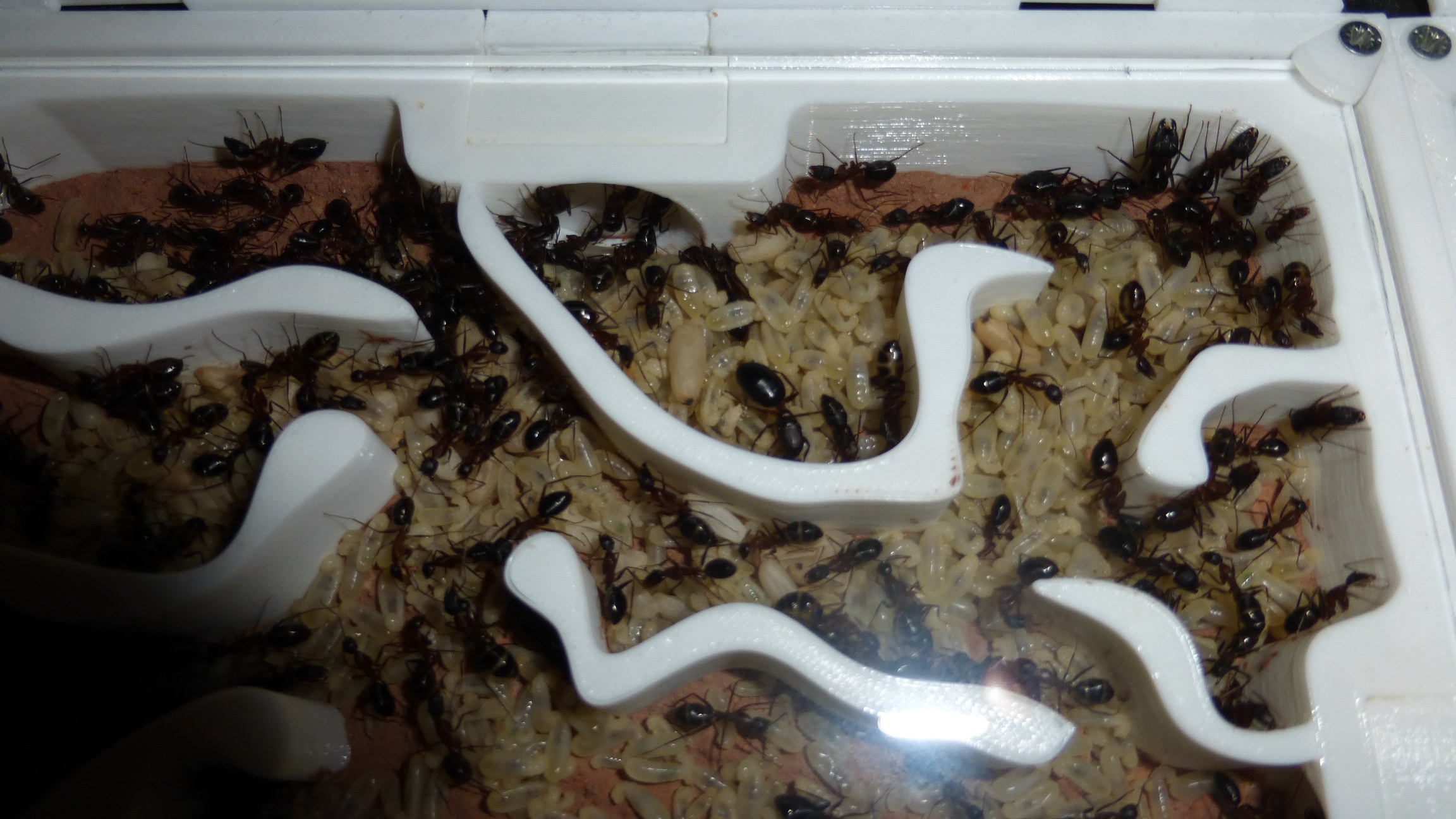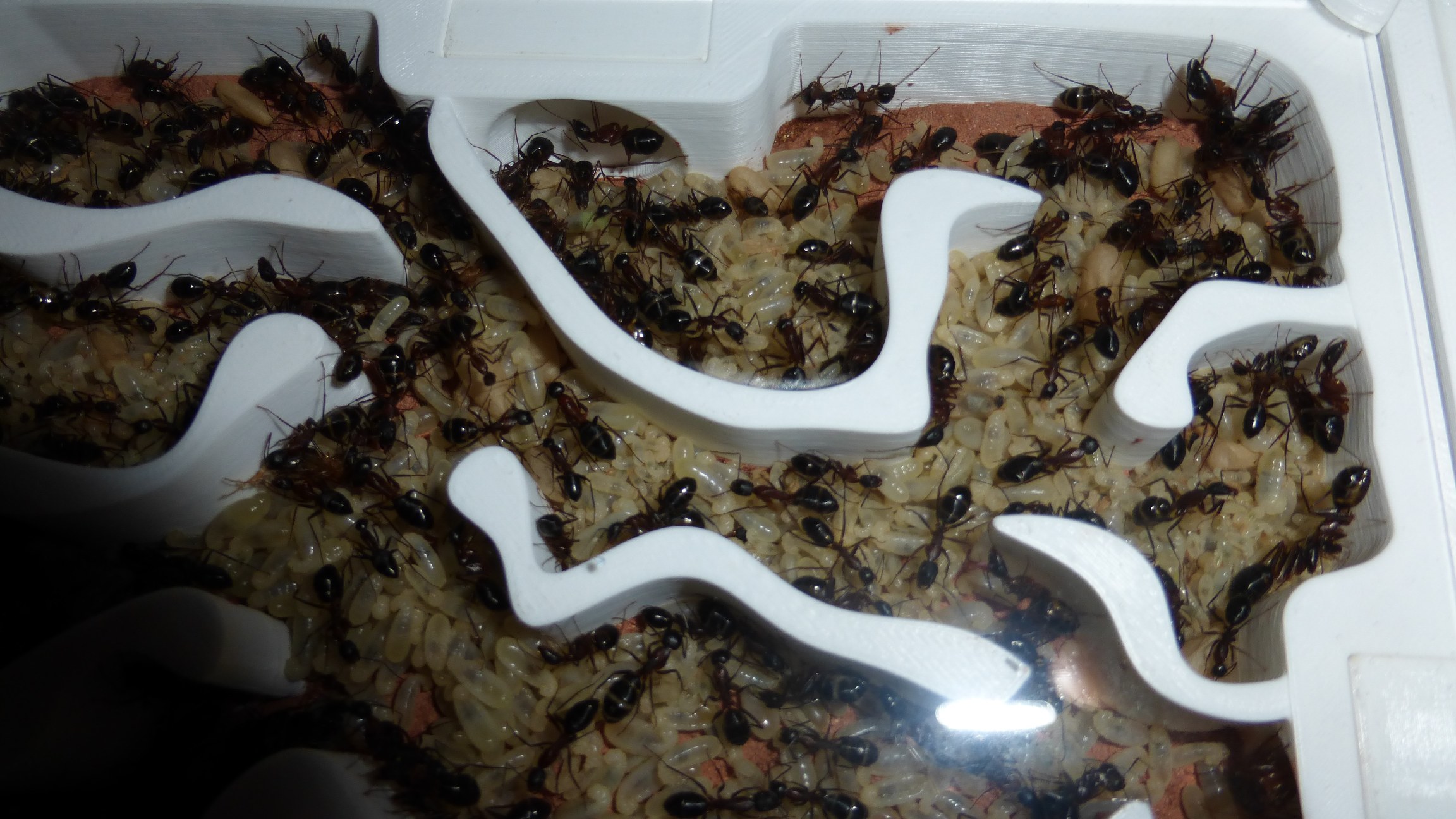 Sonnenbaden mögen sie noch immer, wobei mir aufgefallen ist, dass sich mehr Ameisen in der Arena befinden, wenn ich die Lampe ein paar Tage auslasse. Das dürfte aber wohl eher damit zu tun haben, dass sich die Ameisen generell an ungestörten Orten ansammeln.