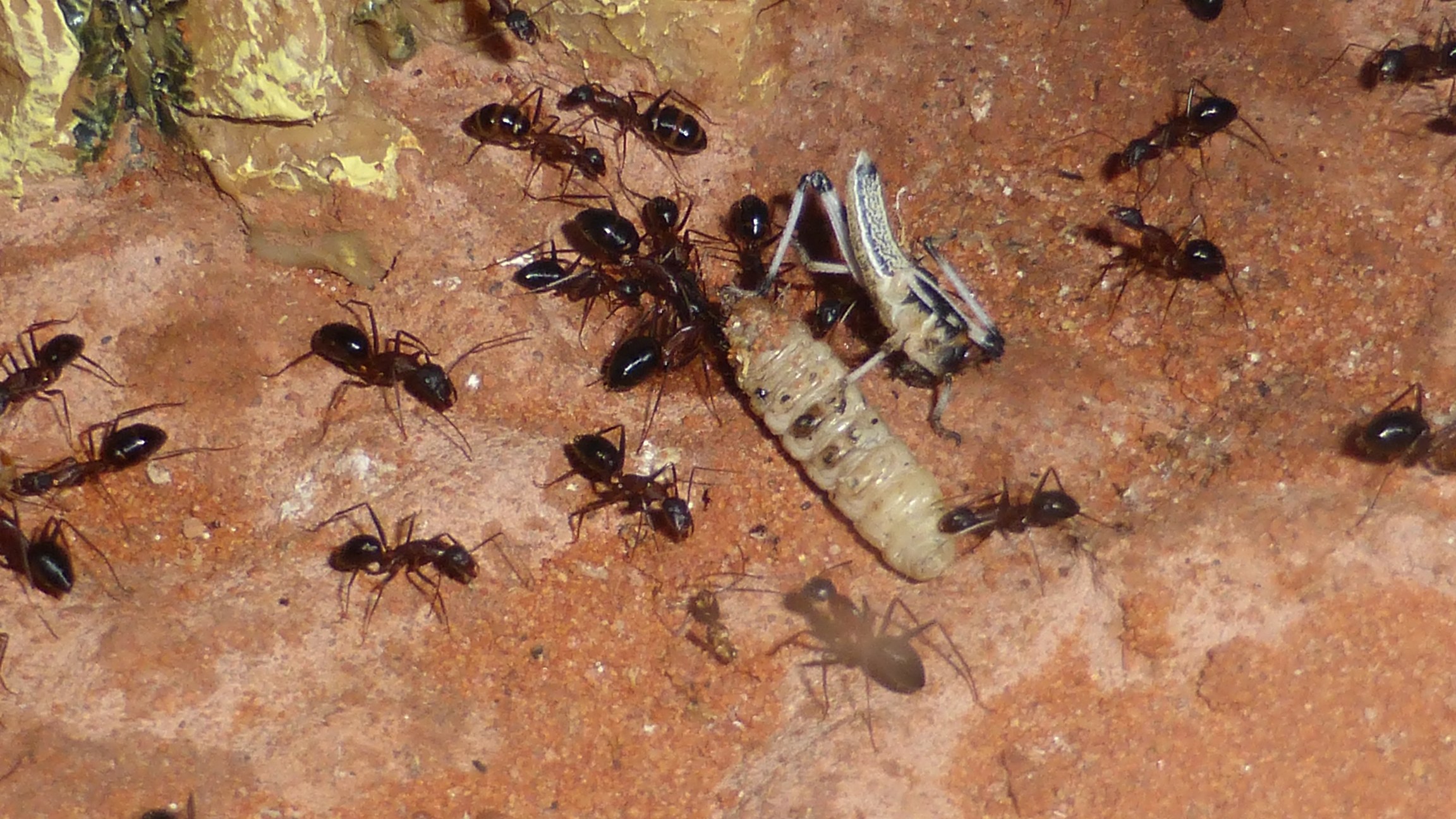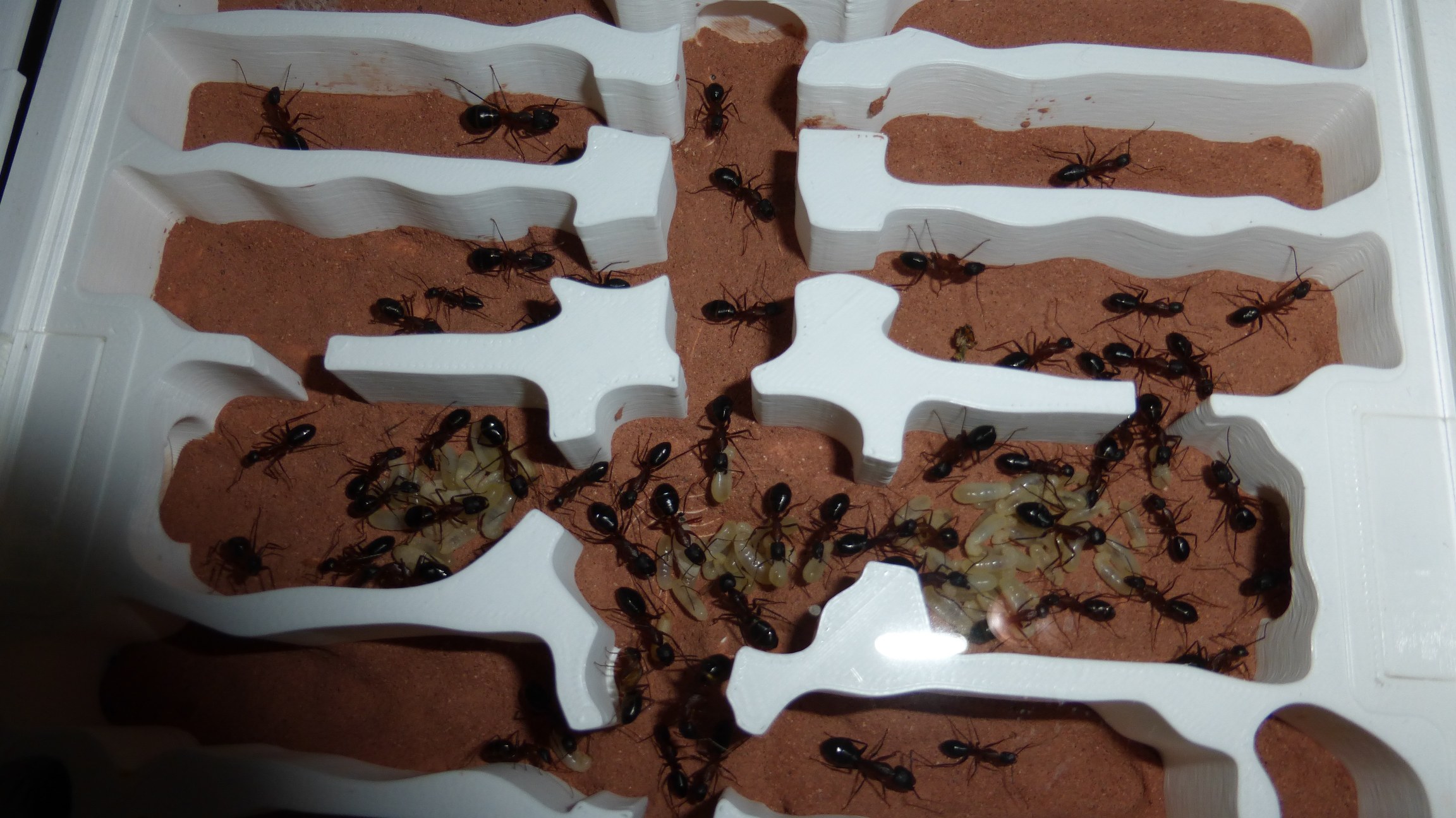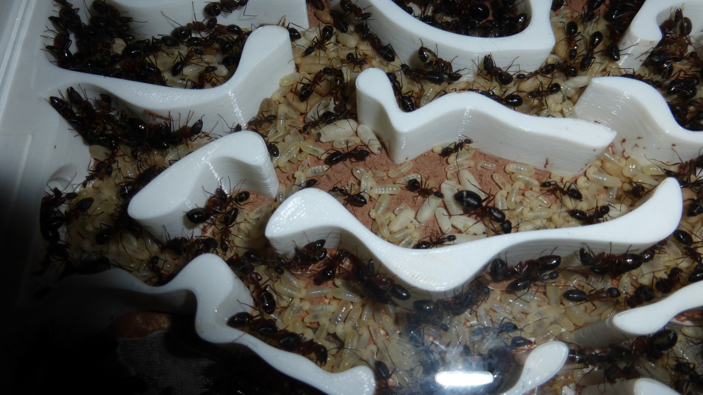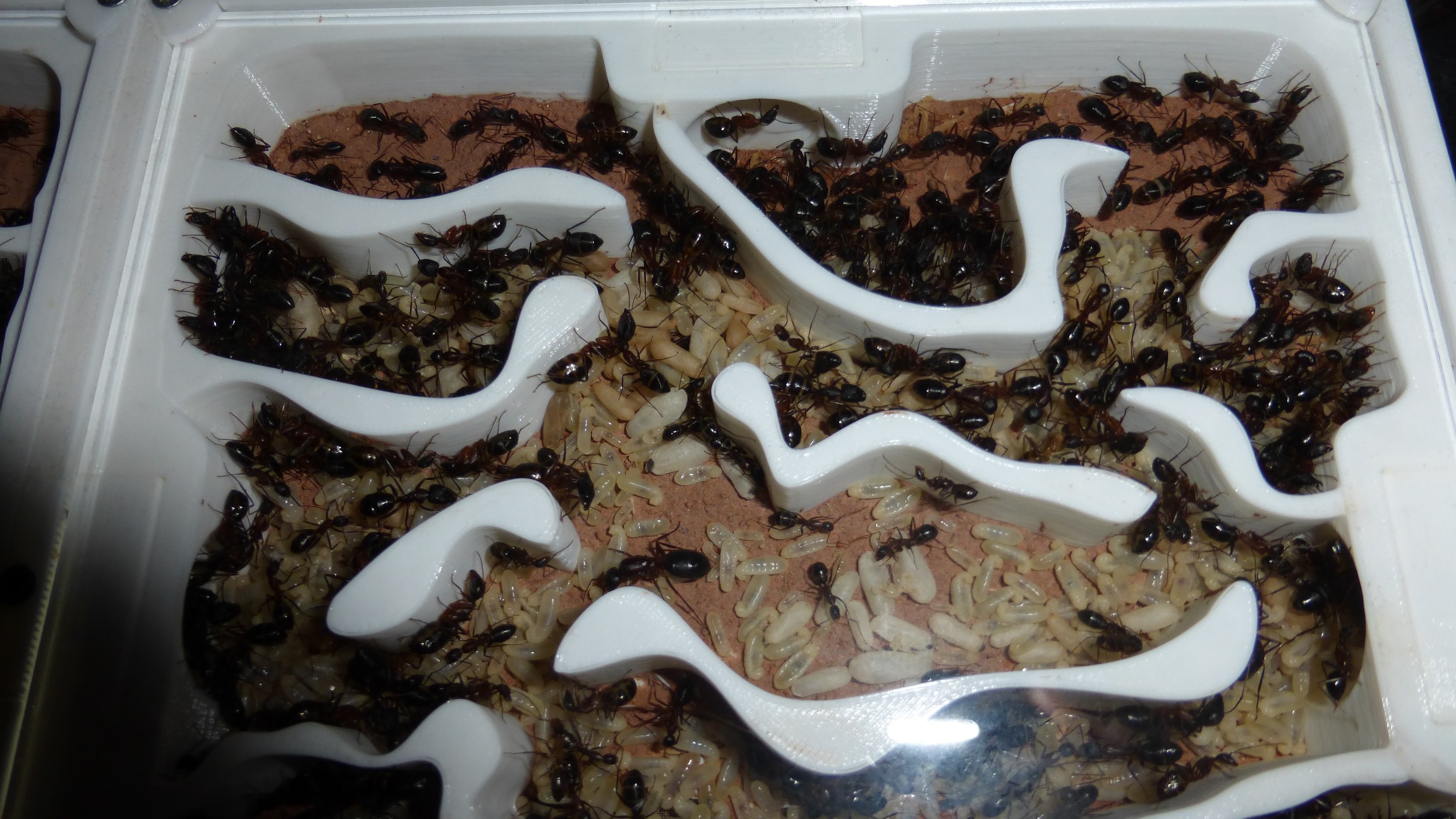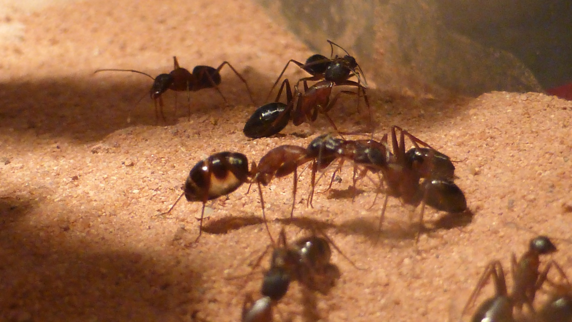 Sonnenbaden mögen sie noch immer, wobei mir aufgefallen ist, dass sich mehr Ameisen in der Arena befinden, wenn ich die Lampe ein paar Tage auslasse. Das dürfte aber wohl eher damit zu tun haben, dass sich die Ameisen generell an ungestörten Orten ansammeln.