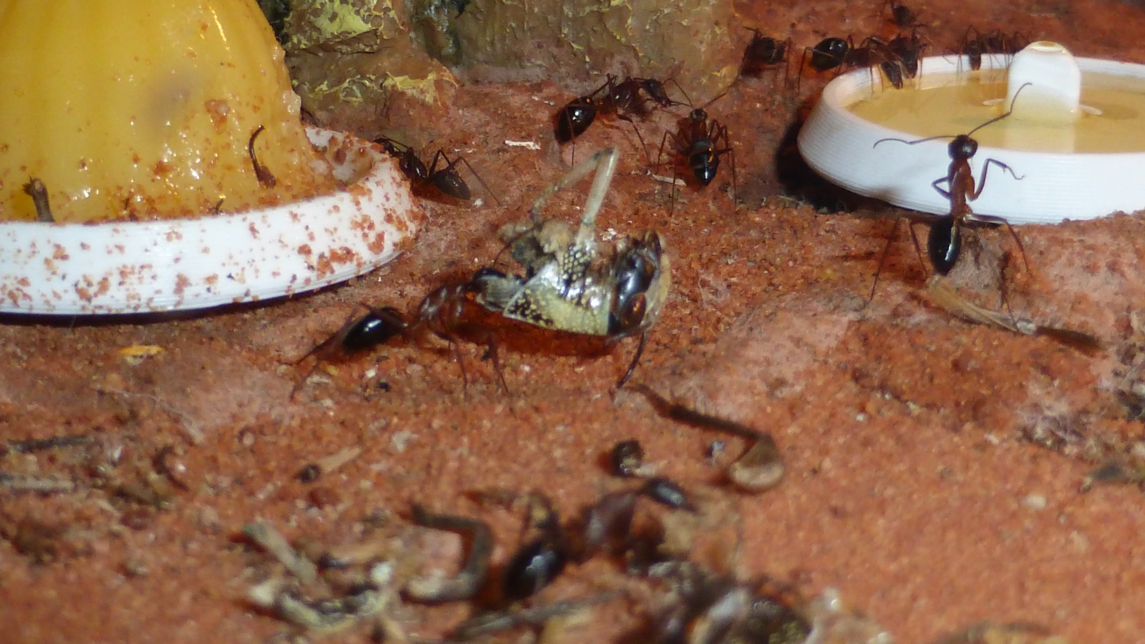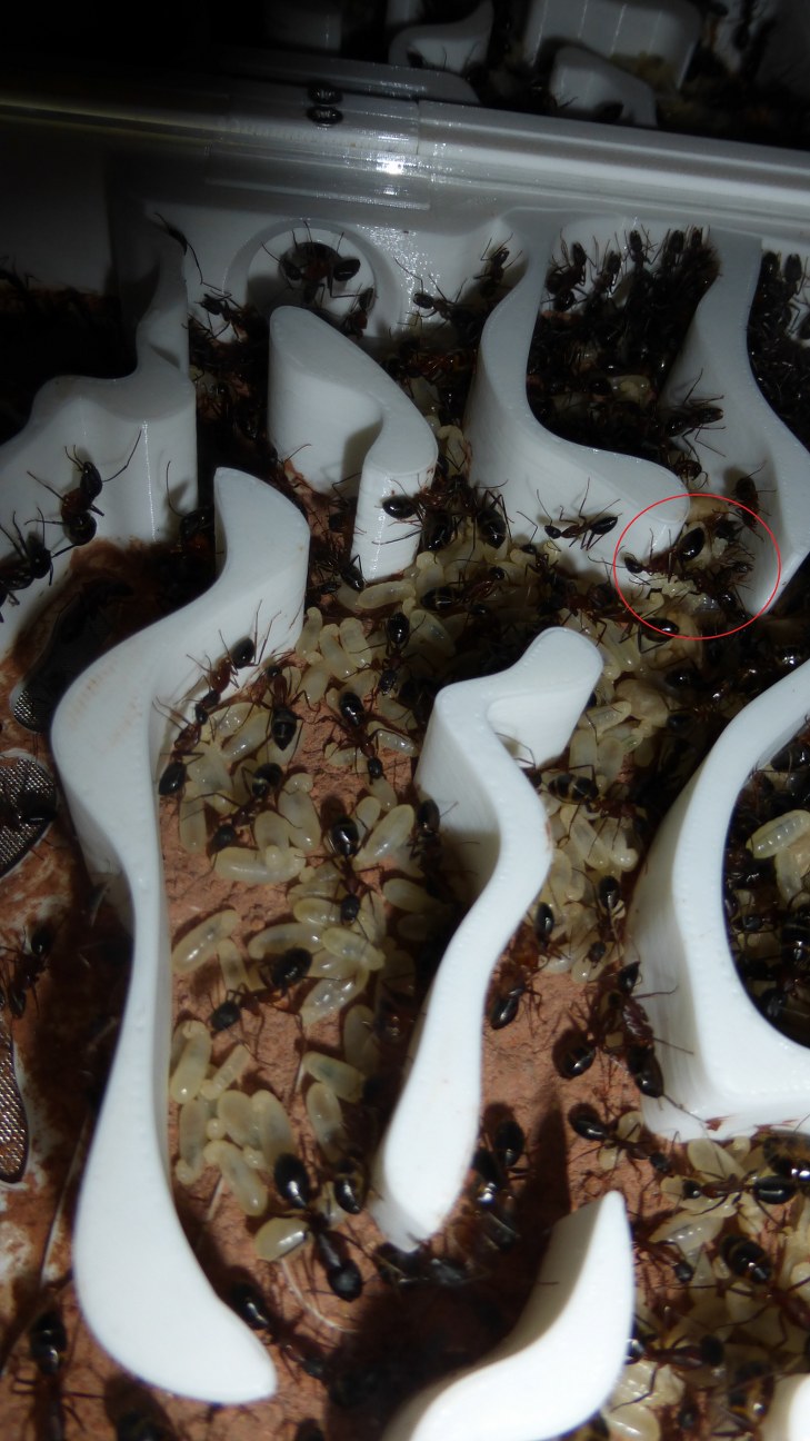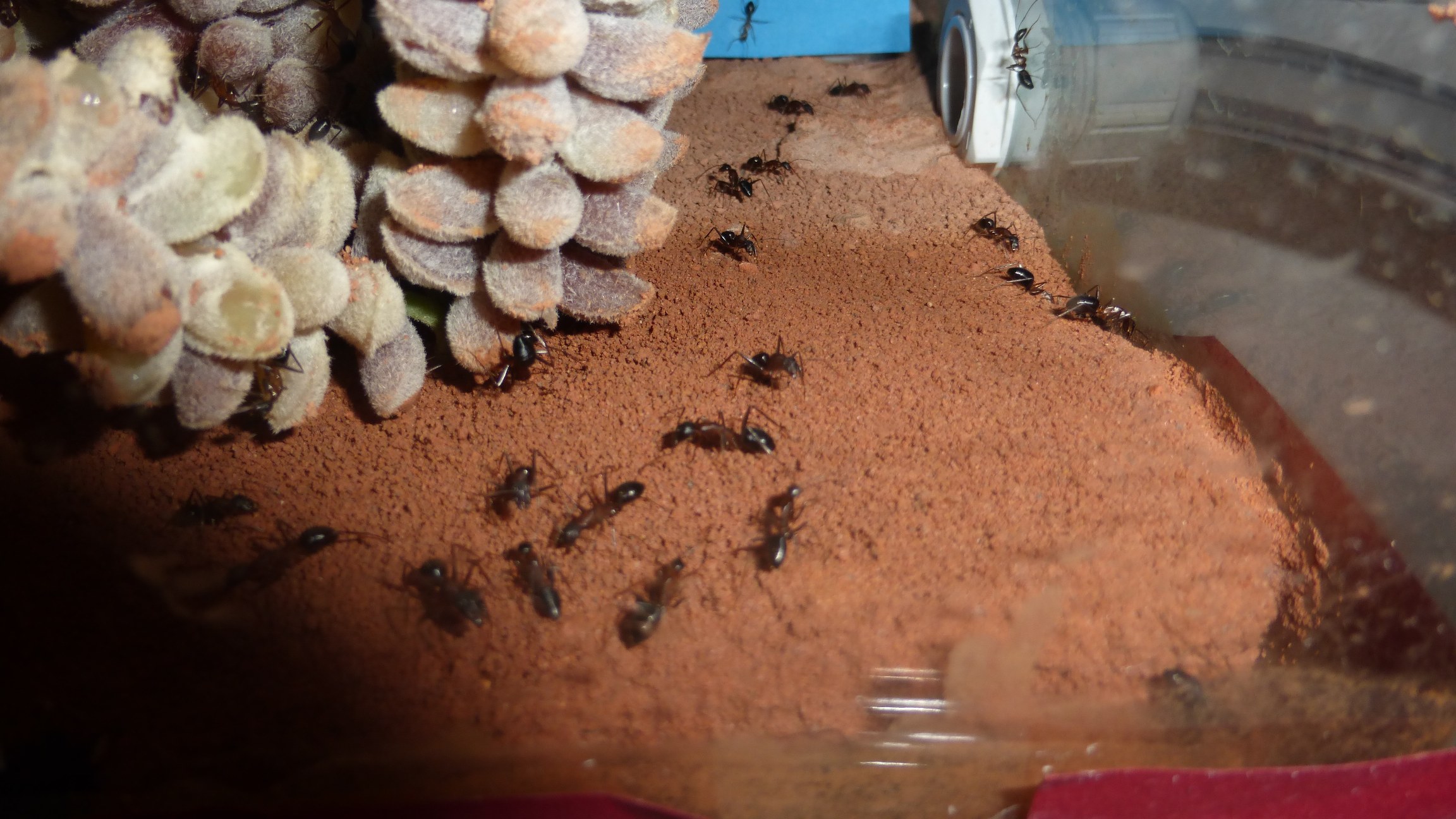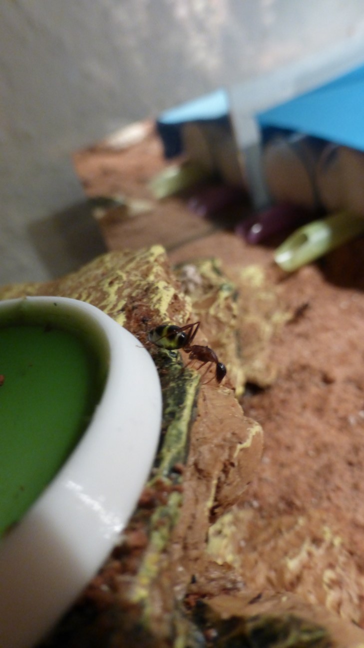 Thorax, dem hauptsächlich roten Kopf und den roten Mandiblen. Die ist auch definitiv keine Jungarbeiterin (die gehen normalerweise nicht aus dem Nest und allgemein schlüpfen die Arbeiterinnen bei mir sowieso immer fast vollständig ausgefärbt), sie rennt jetzt seit über einer Woche so in der Arena umher. Vermutlich eine etwas ungewöhnliche Farbvariante, mal sehen ob noch mehr von der Sorte auftauchen.