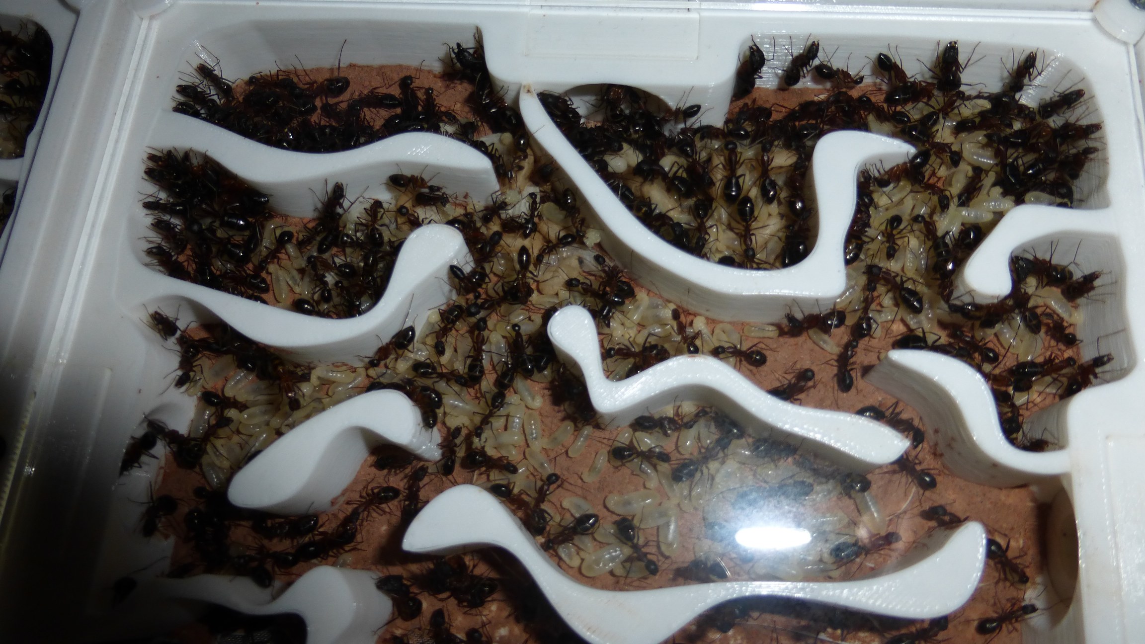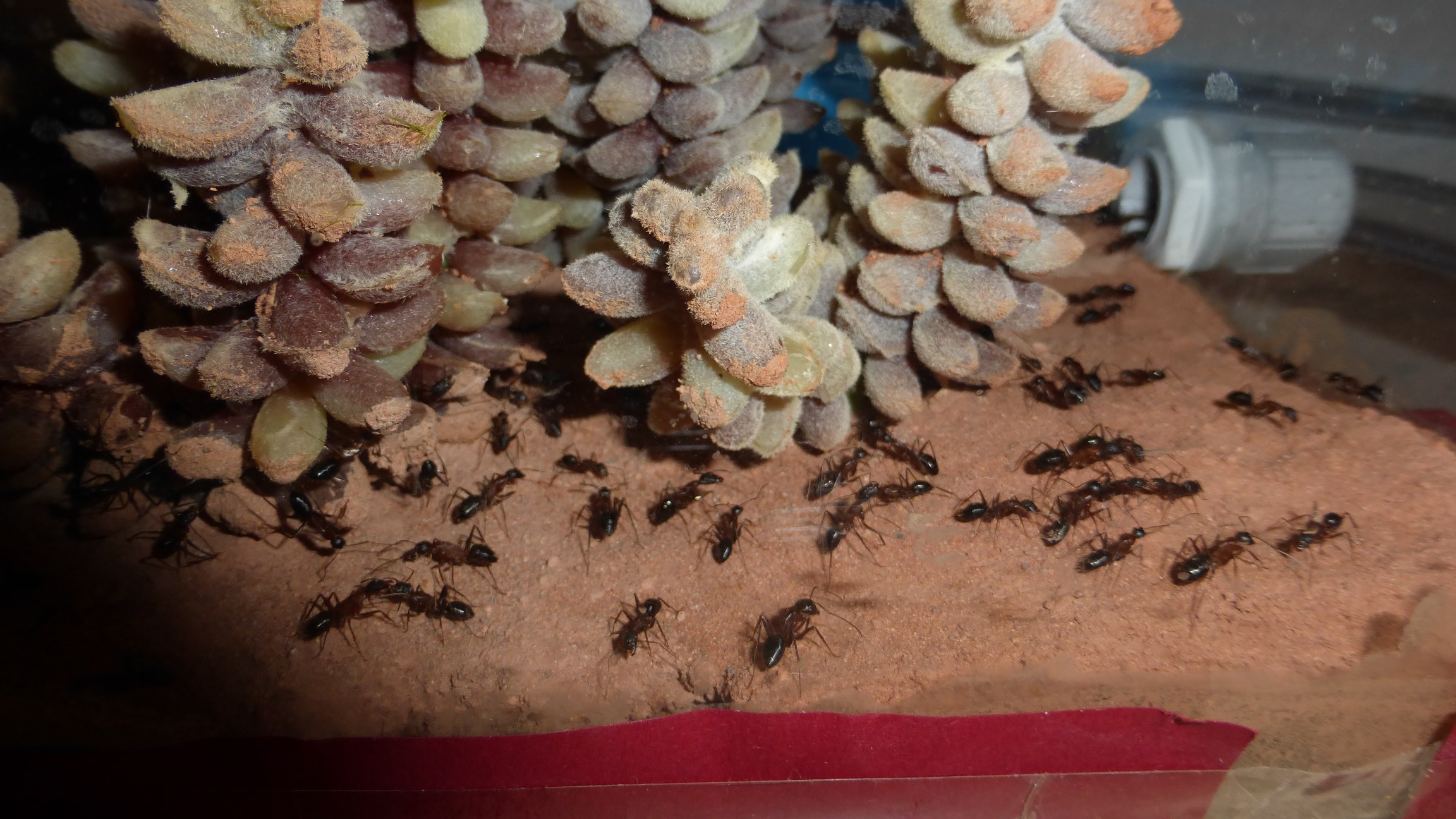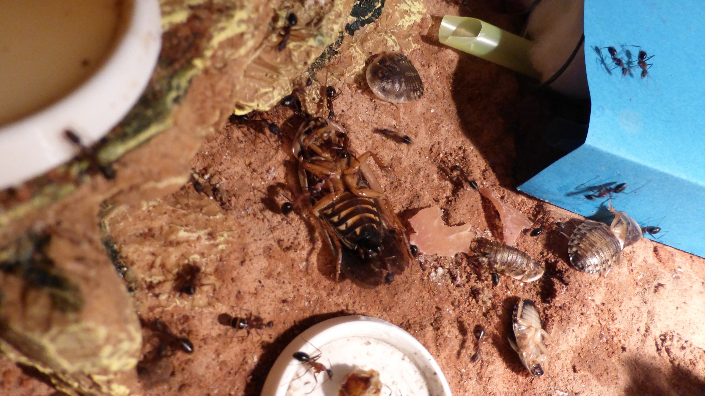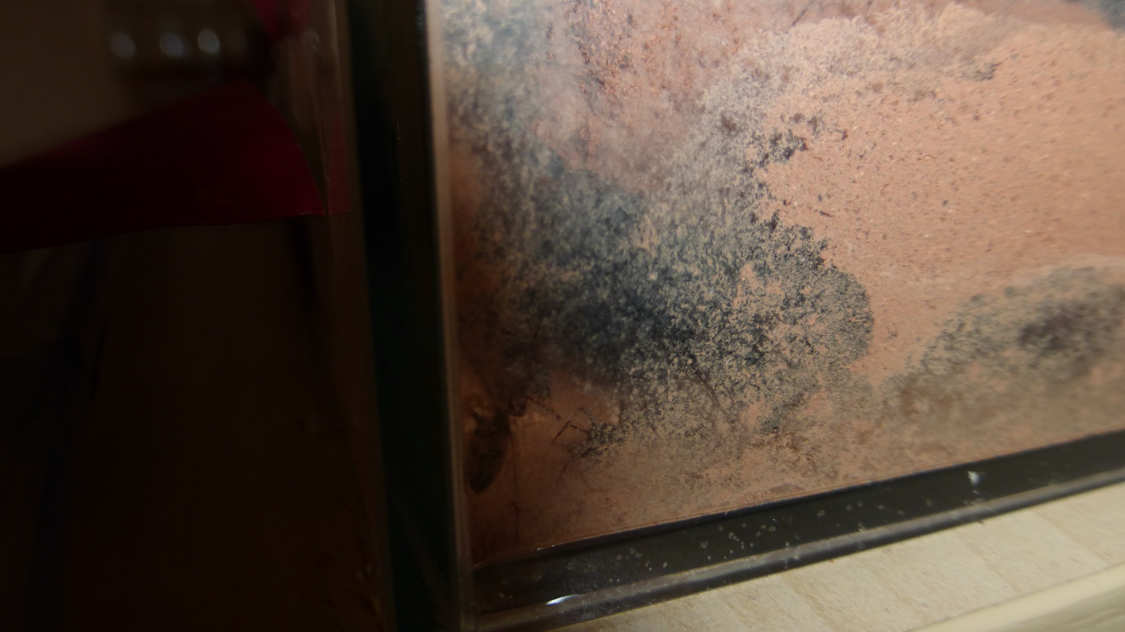 Thorax, dem hauptsächlich roten Kopf und den roten Mandiblen. Die ist auch definitiv keine Jungarbeiterin (die gehen normalerweise nicht aus dem Nest und allgemein schlüpfen die Arbeiterinnen bei mir sowieso immer fast vollständig ausgefärbt), sie rennt jetzt seit über einer Woche so in der Arena umher. Vermutlich eine etwas ungewöhnliche Farbvariante, mal sehen ob noch mehr von der Sorte auftauchen.