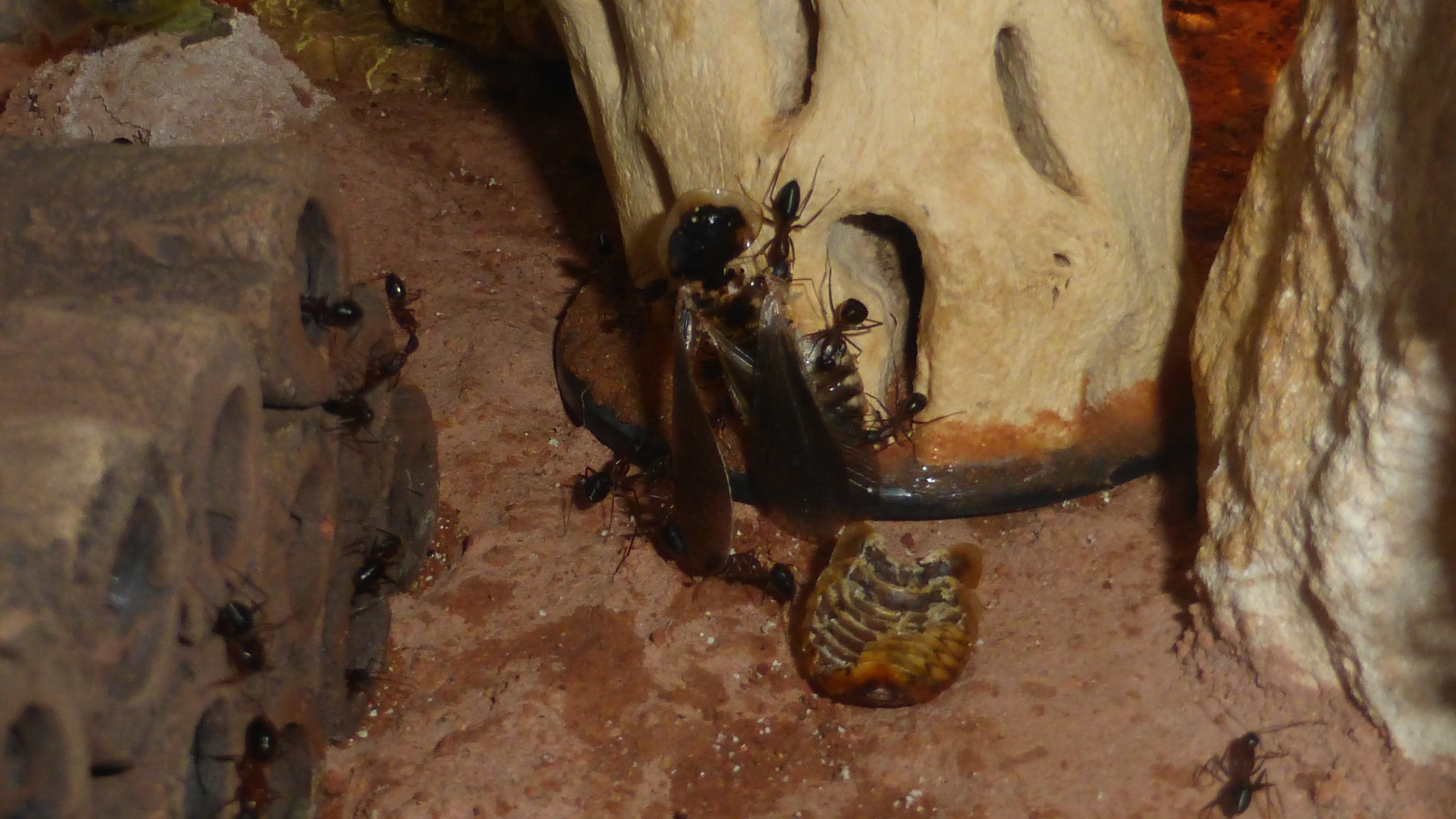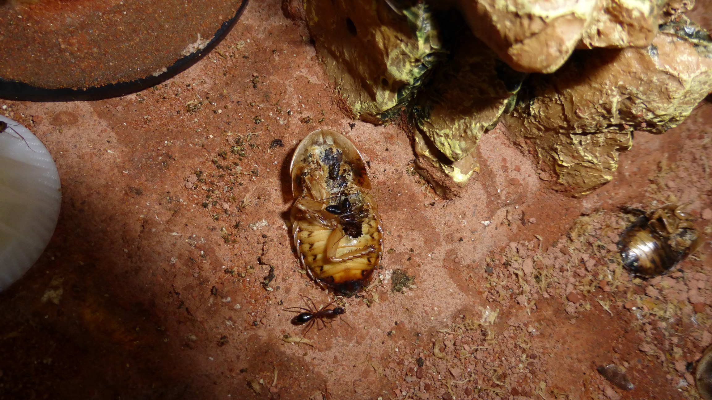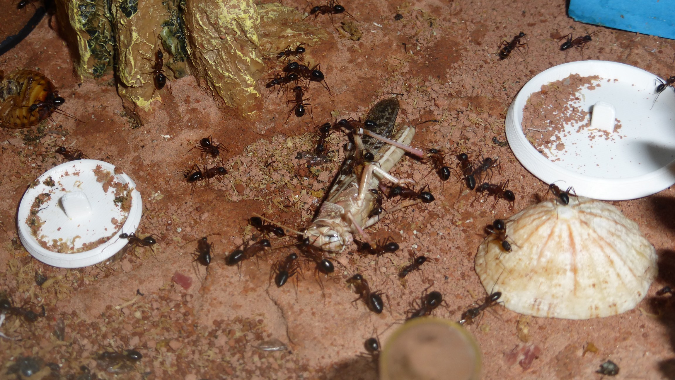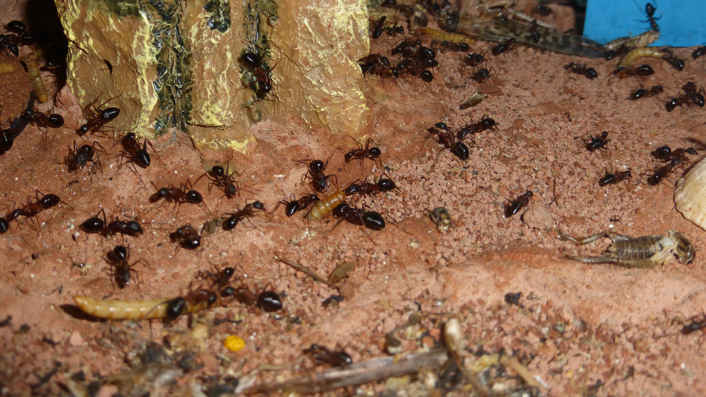 Thorax, dem hauptsächlich roten Kopf und den roten Mandiblen. Die ist auch definitiv keine Jungarbeiterin (die gehen normalerweise nicht aus dem Nest und allgemein schlüpfen die Arbeiterinnen bei mir sowieso immer fast vollständig ausgefärbt), sie rennt jetzt seit über einer Woche so in der Arena umher. Vermutlich eine etwas ungewöhnliche Farbvariante, mal sehen ob noch mehr von der Sorte auftauchen.