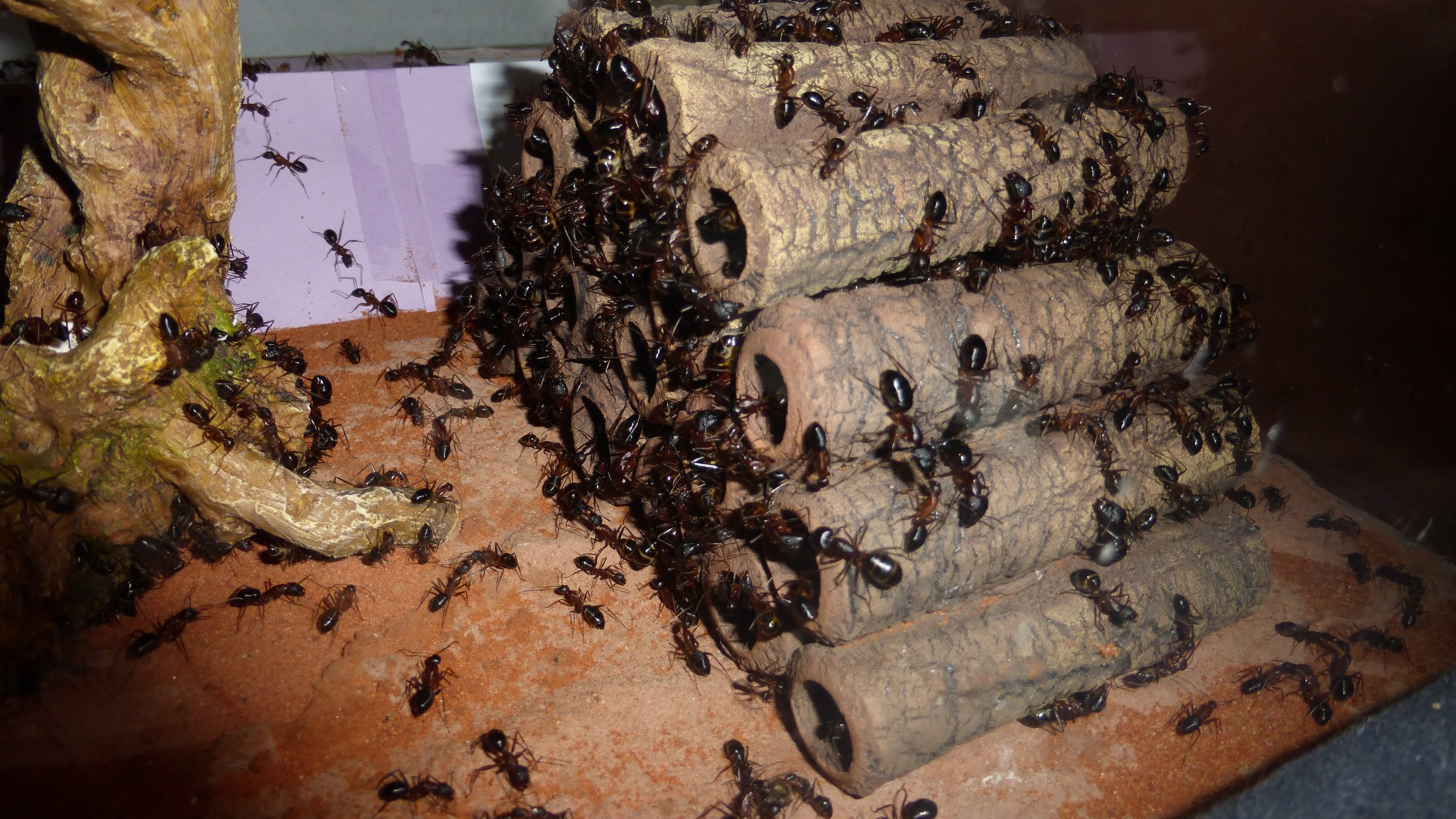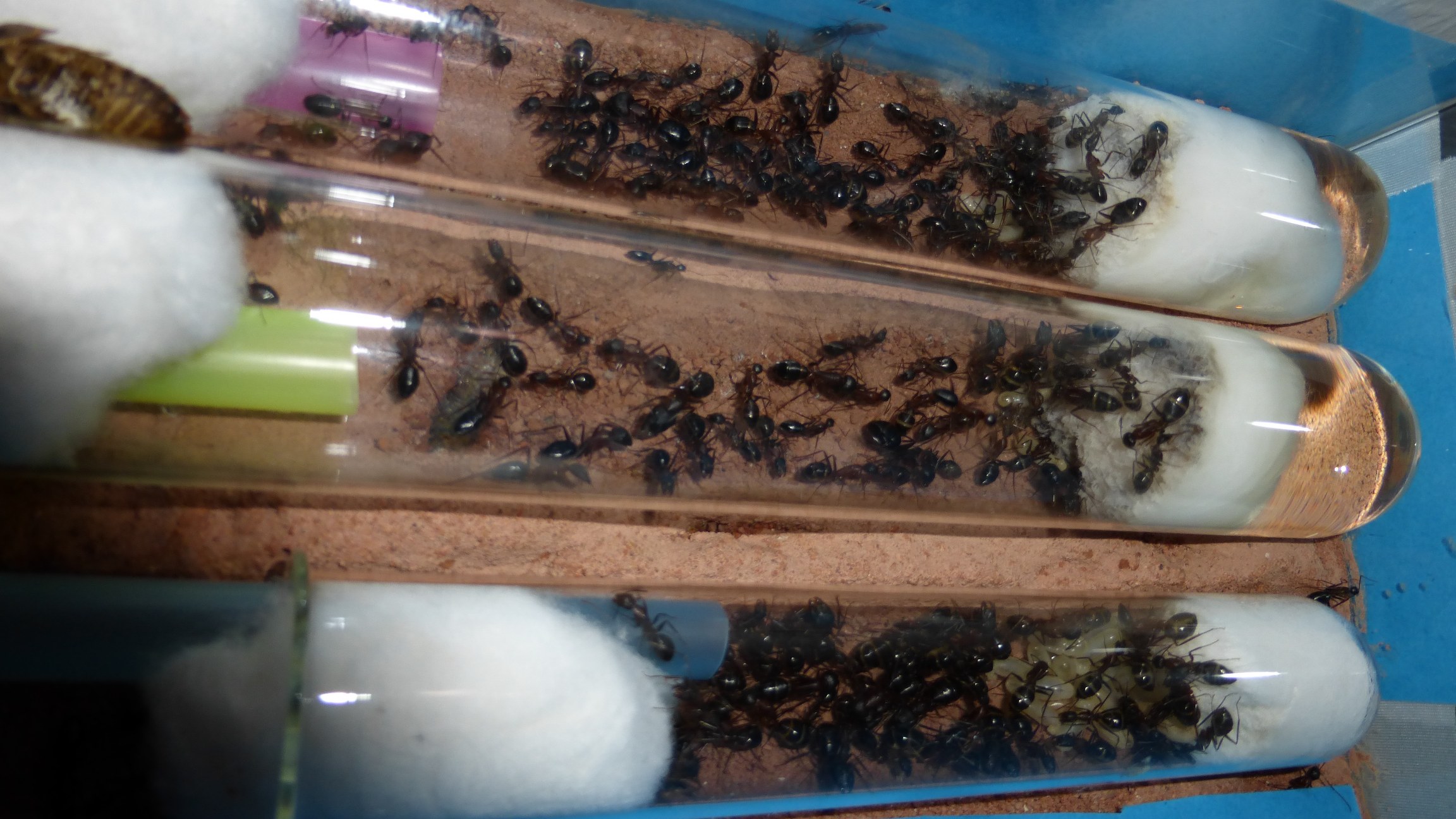 Ein Großteil der Ameisen versteckt sich tagsüber in den Schrimpsröhren (sogar deutlich mehr als in den Reagenzgläsern) und kommt nur nachts raus.