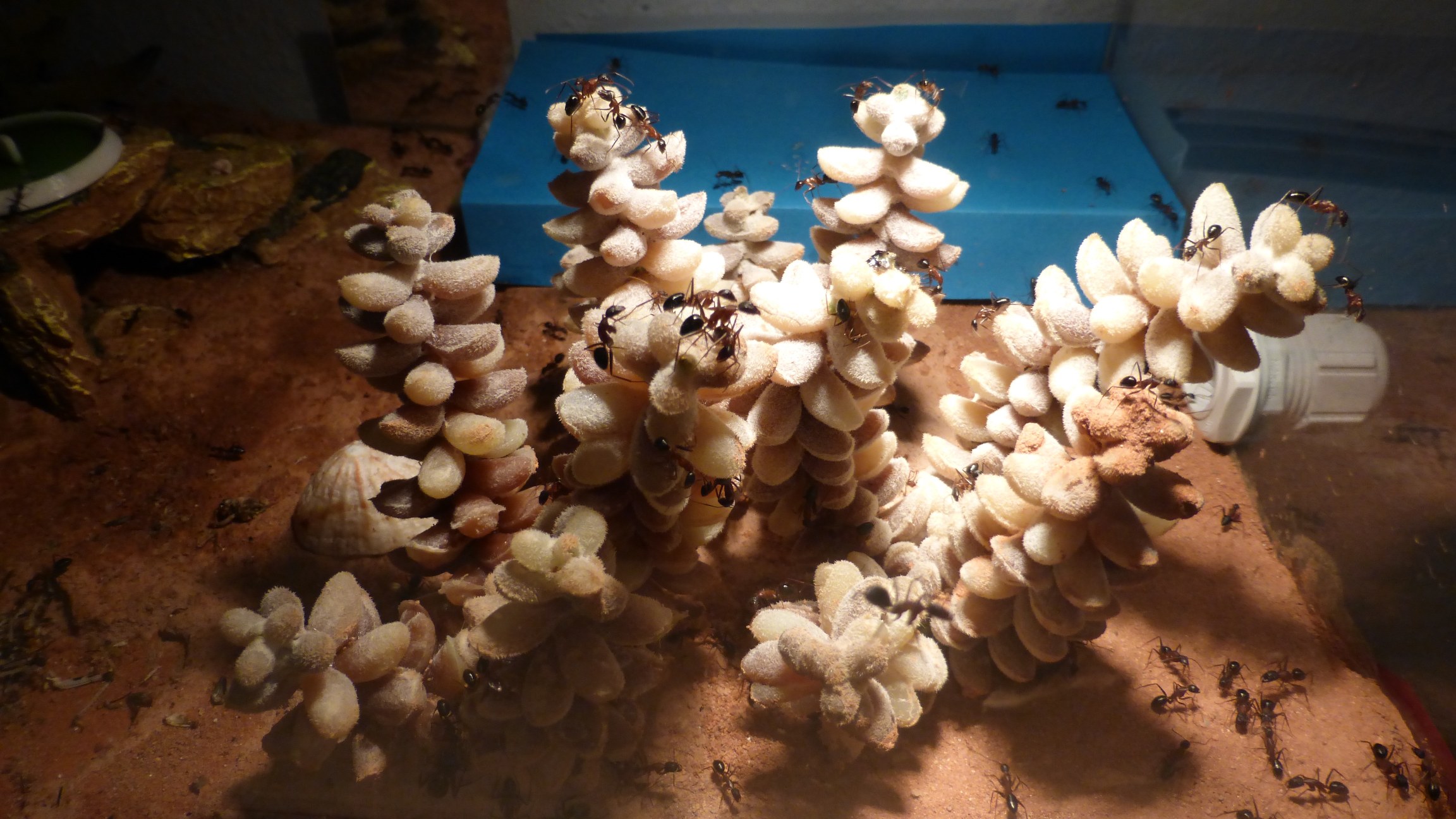 Da die Ameisen dauernd versuchten zum Boden des Beckens zu graben hab ich die Bereiche mal ordentlich bewässert. Sobald das Bodensubstrat sdchön weich war haben die Arbeiterinnen eine abstruse Ausgrabungsoperation in die Wege geleitet – bin mir nicht sucher wie viel Bodengrund sie tatsächlich abgetragen haben, aber gemessen am Auswurf mussen sich dort unten ein paar ziemlich große Kammern befinden.