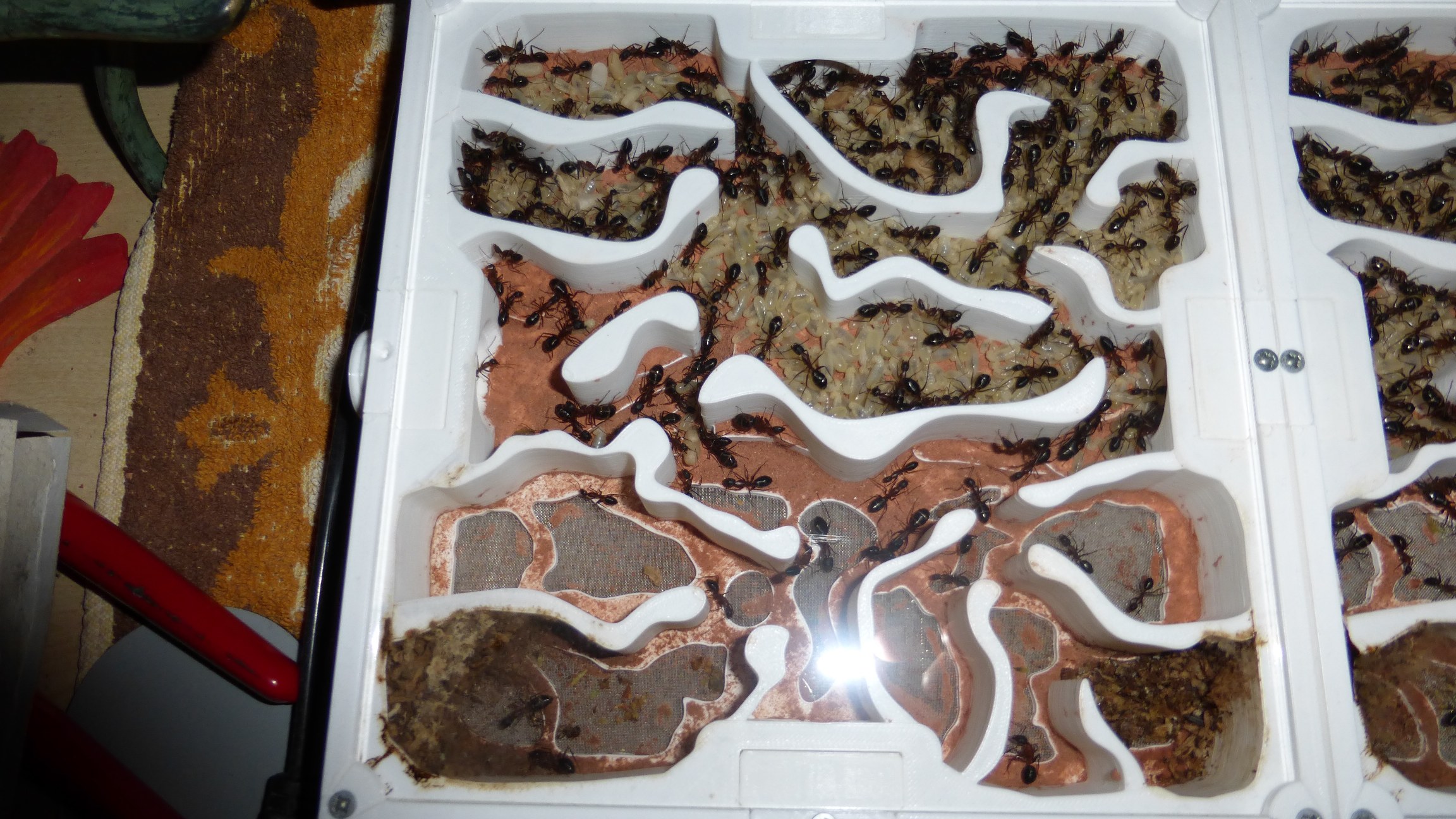 Vor ein paar Tagen fiel mir ein gewissen Mangel and Garnelensand auf, den sie normalerweise fĂĽr die MĂĽllkammern im Nest benutzen, also haben sie ne neue Ladung bekommen - das kam dabei raus.