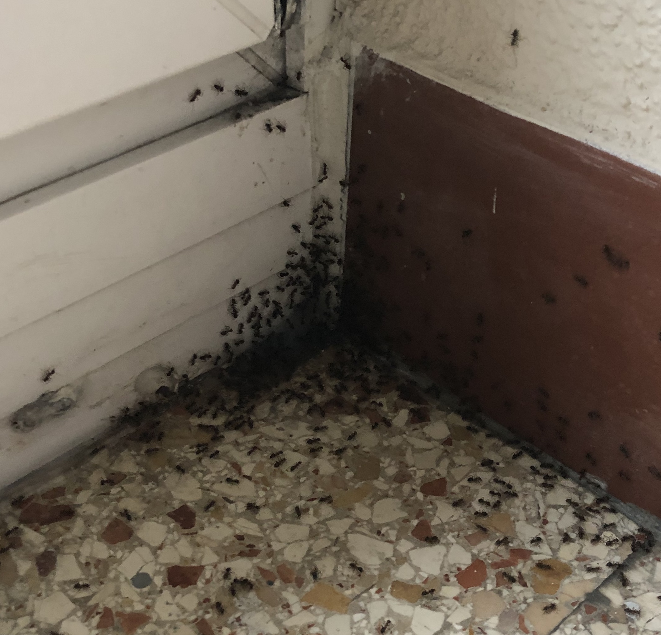 Durch einen nicht sehr professionell verschlossenen alten Kabeldurchgang kommen die Ameisen aus dem Treppenhaus und dort durch einen ebenso unprofessionell verschlossenen Kabeldurchgang durch die Wand unterhalb einer BalkontĂŒr.