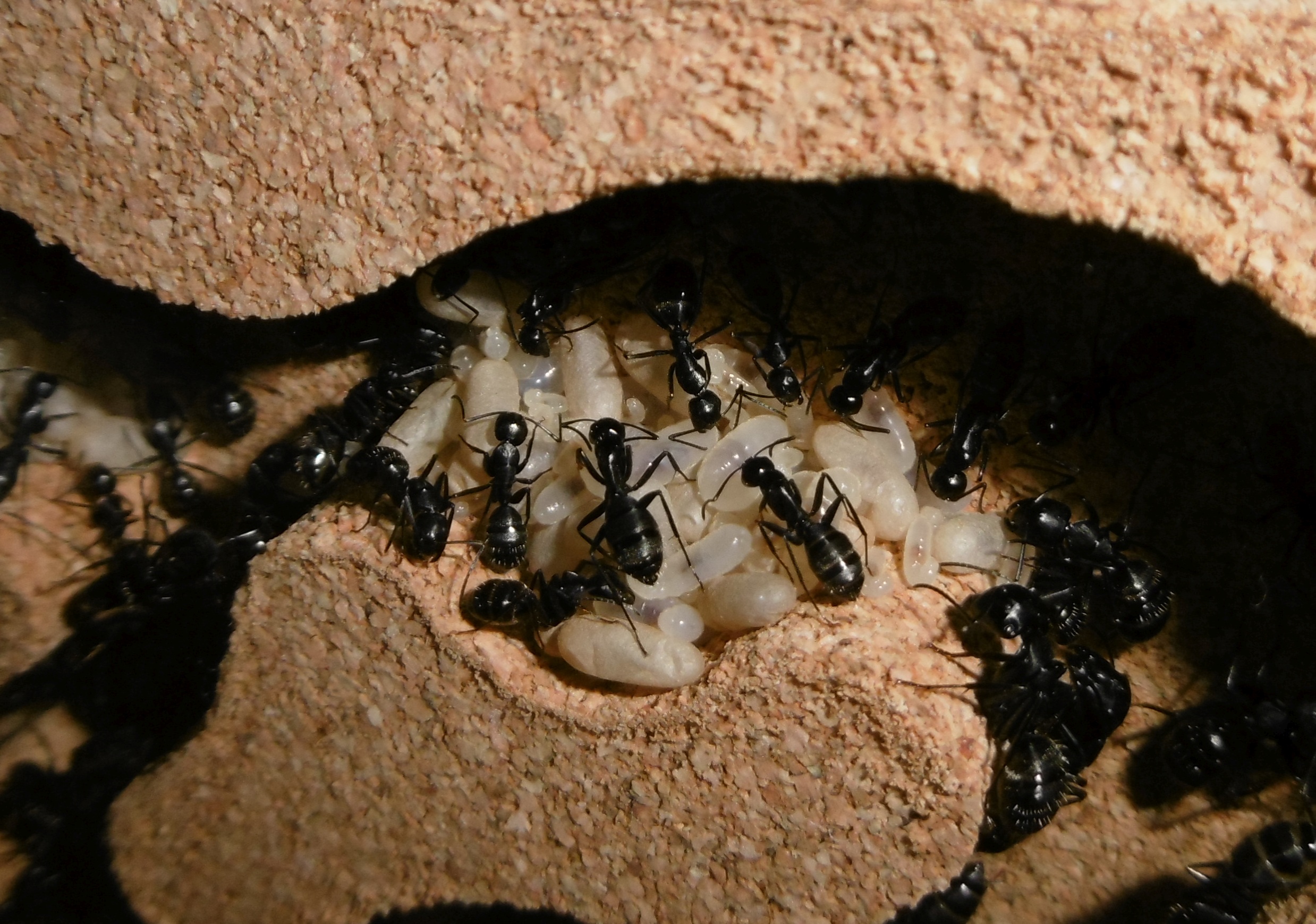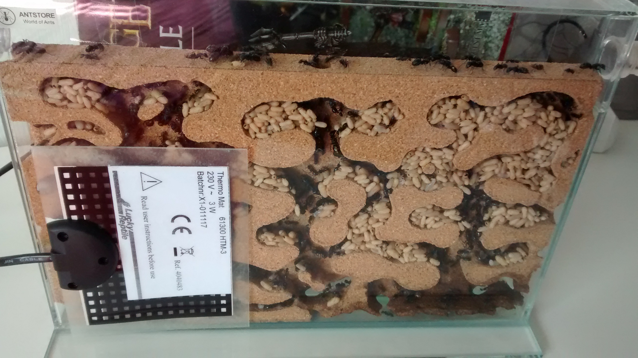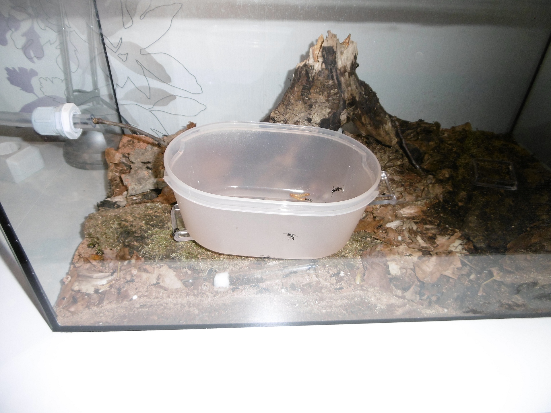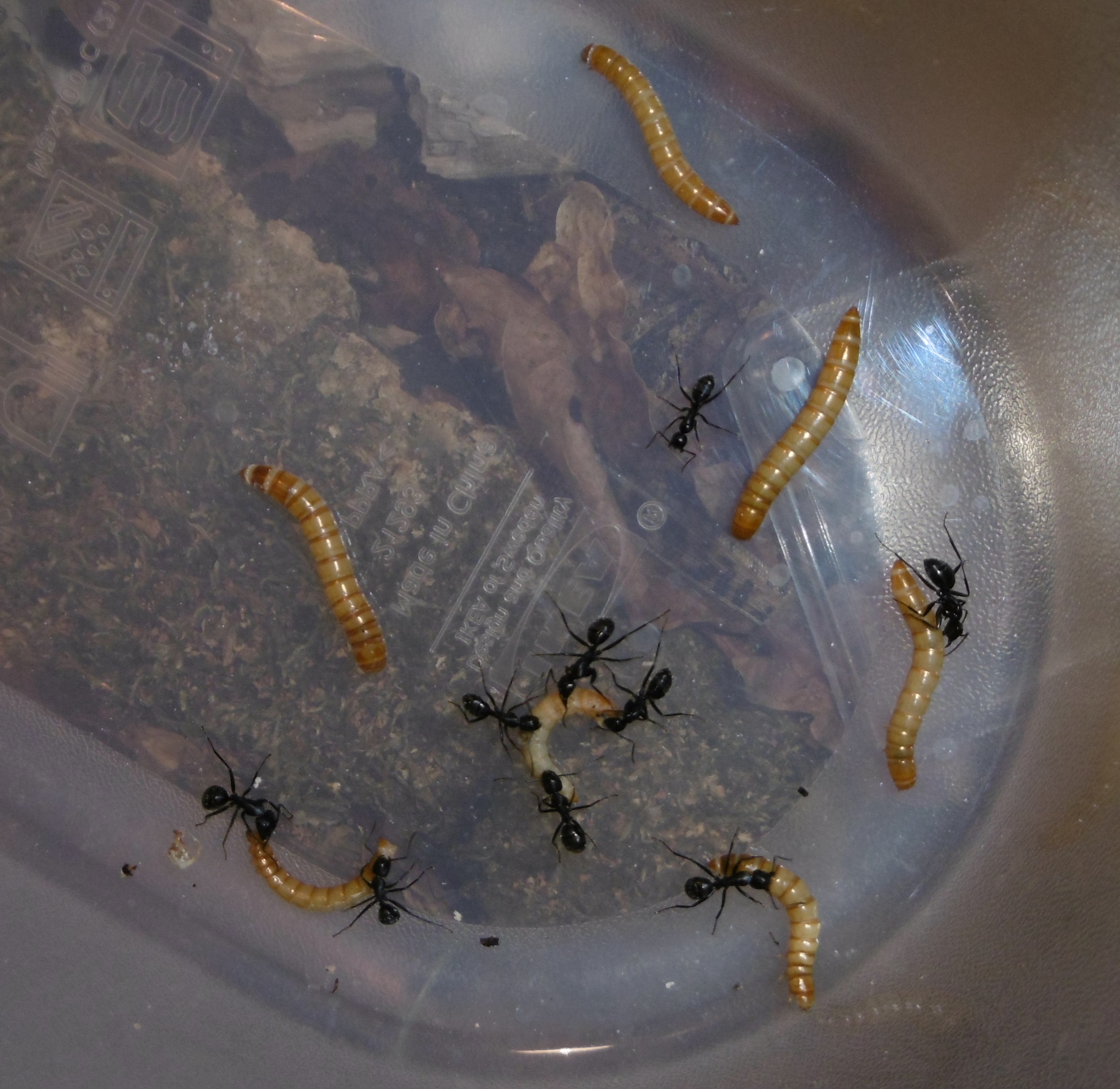 Da ich erst so wenige Mehlkäferlarven anzubieten hatte, habe ich den Ameisen dann auch noch drei mittlere (gefrorene) Heimchen dazugegeben.