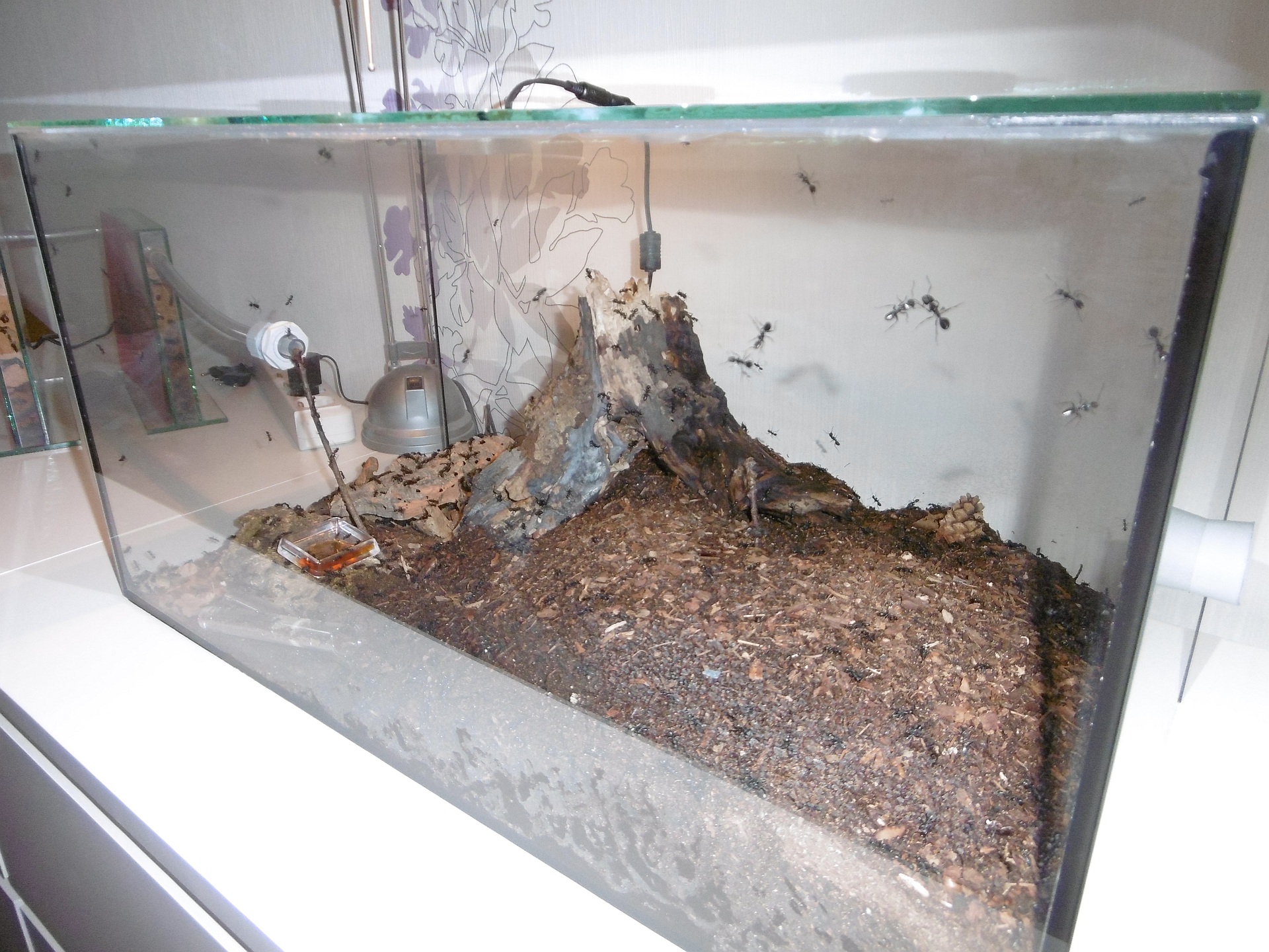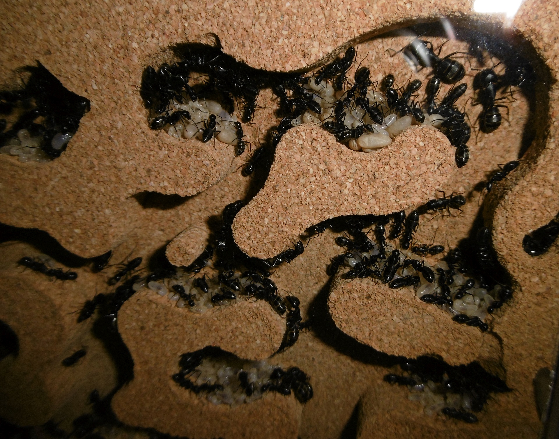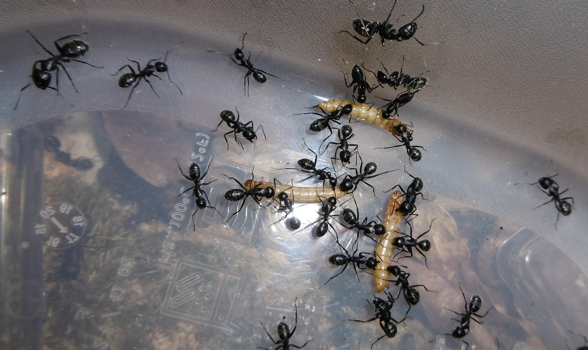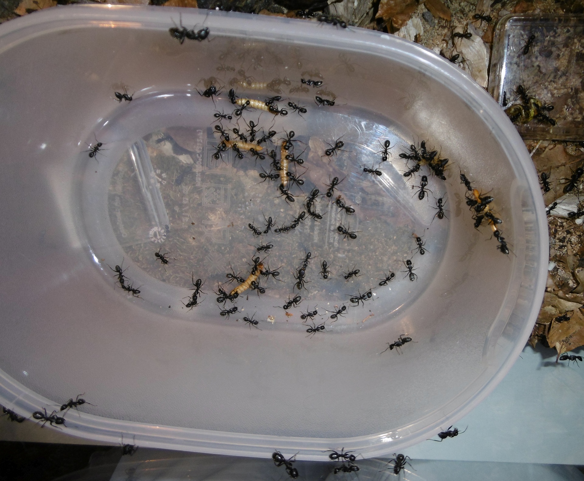 An Futterinsekten haben sie einen großen Bedarf. Ich verfüttere alle zwei Tage ca. 5-6 größere Futtertiere. Wanderheuschrecken in mittlerer und adulter Größe werden ebenso wie Heimchen in verschiedenen Größen toll angenommen und sind auch in der Handhabung für mich als Halter absolut problemlos. Diese Futtertiere kaufe ich möglichst frisch und friere sie dann direkt ein. Die gefrorenen Futtertiere gebe ich dann, ohne sie aufzutauen, direkt zu den Ameisen; je nach Laune zerbreche bzw. zerteile ich die Futtertiere noch, damit die Ameisen es einfacher haben.