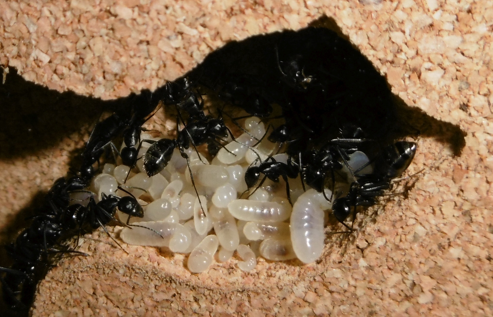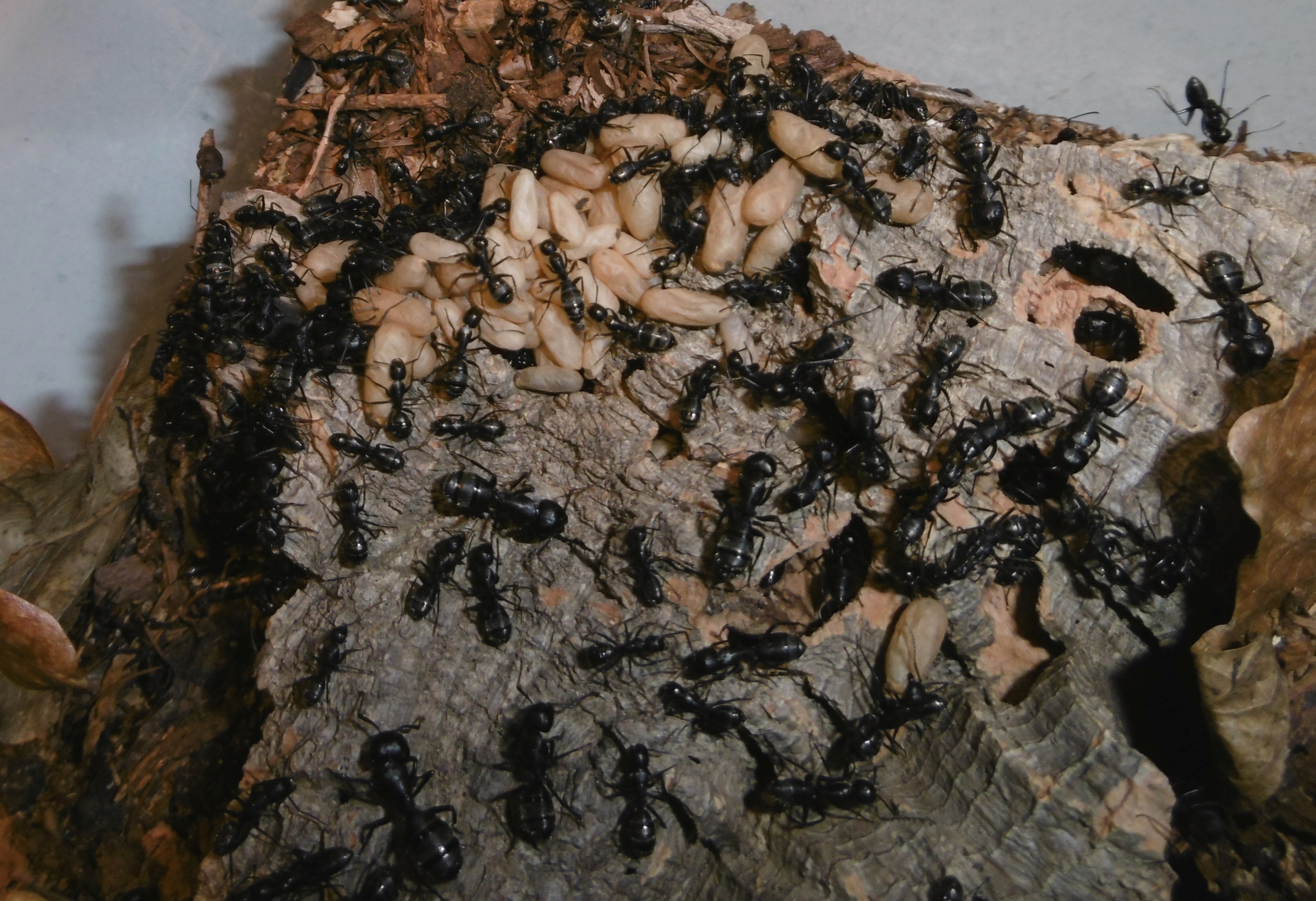 Nötig ist das aber nicht, denn die Camponotus vagus schaffen es sogar den Panzer adulter Wanderheuschrecken aufzuschneiden. Positiv überrascht bin ich über den Nutzungsgrad des Futters; alle Futtertiere werden restlos ausgehöhlt, was besonders in Anbetracht der Größe der Ameisen für eine gute Futterverwertung spricht, für mich ist jedenfalls kein großer Unterschied im Vergleich zu kleineren Ameisen wie z.B. Lasius niger erkennbar.