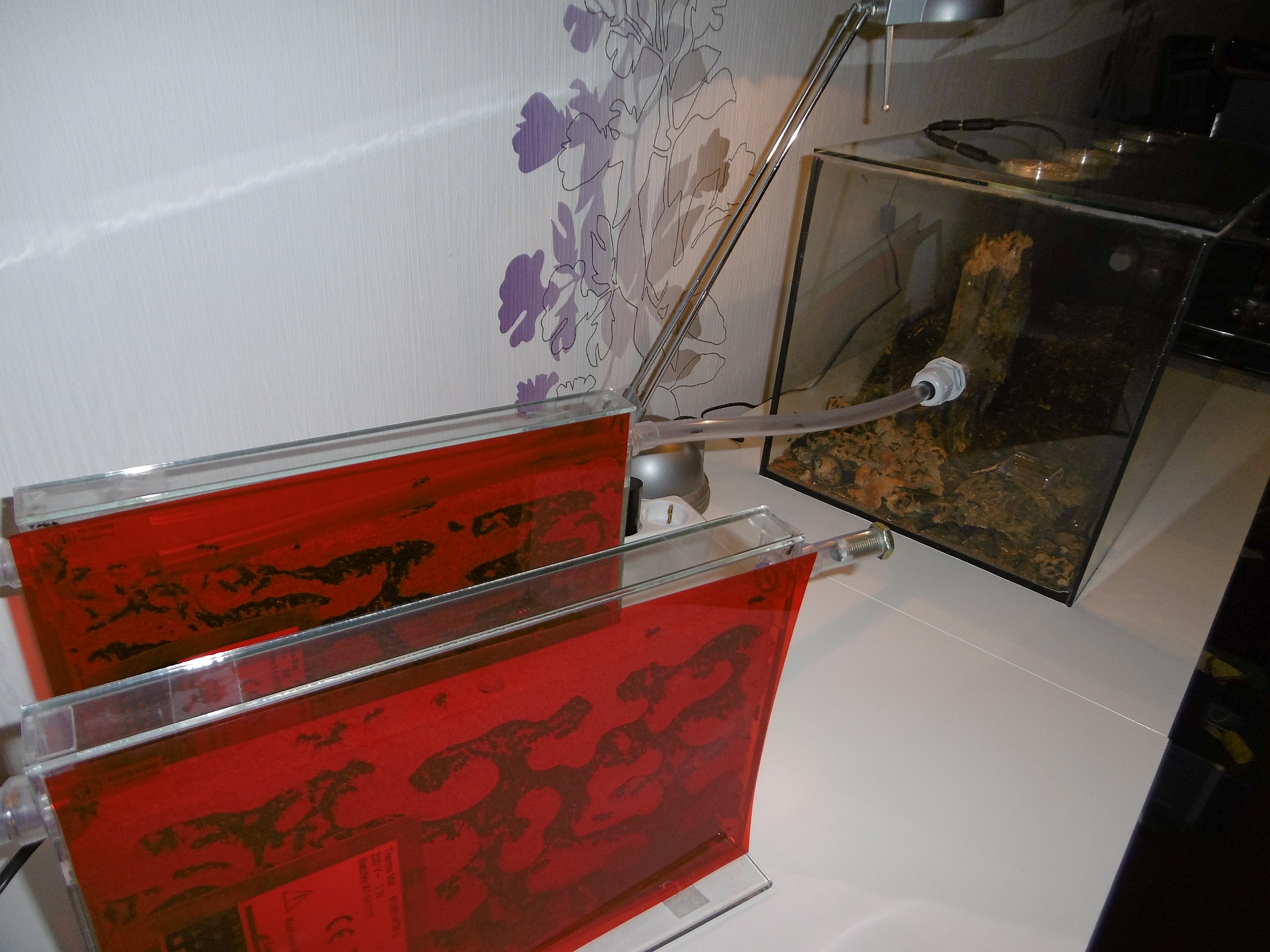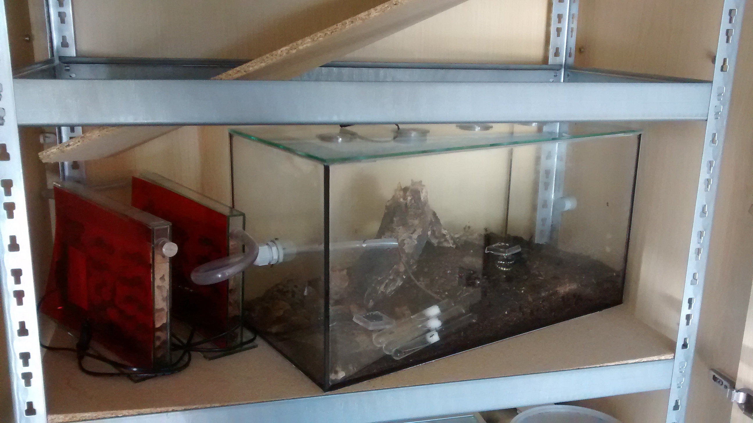 Nun kann ich im Waldbecken nicht mehr ohne weiteres das Lebendfutter in die Arena geben, da sich die Mehlkäferlarven sonst im tiefen Substrat vergraben würden. Wirklich schlimm wär das zwar nicht, aber ist halt nicht der Sinn der Sache