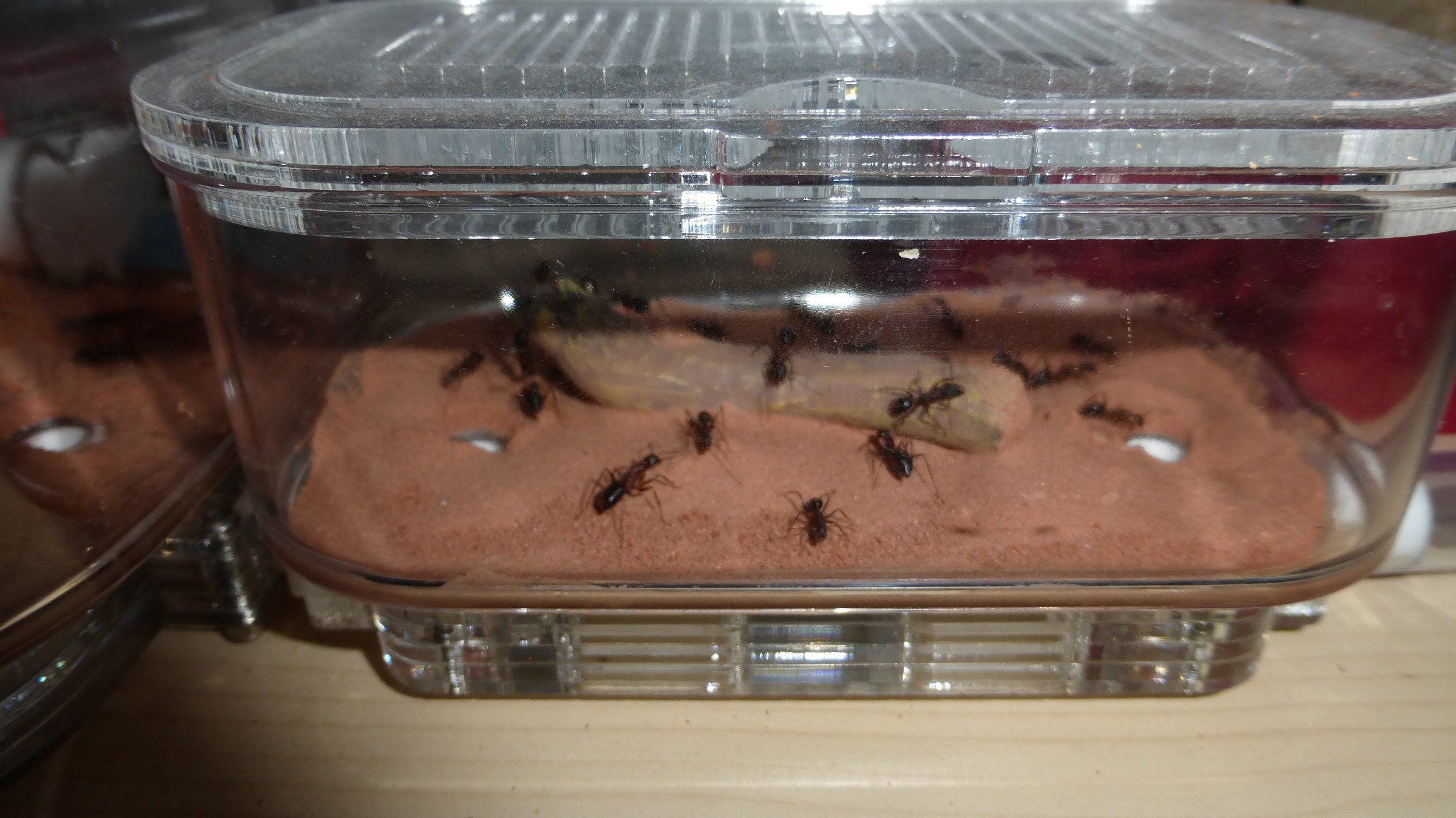 Thorax, dem hauptsächlich roten Kopf und den roten Mandiblen. Die ist auch definitiv keine Jungarbeiterin (die gehen normalerweise nicht aus dem Nest und allgemein schlüpfen die Arbeiterinnen bei mir sowieso immer fast vollständig ausgefärbt), sie rennt jetzt seit über einer Woche so in der Arena umher. Vermutlich eine etwas ungewöhnliche Farbvariante, mal sehen ob noch mehr von der Sorte auftauchen.