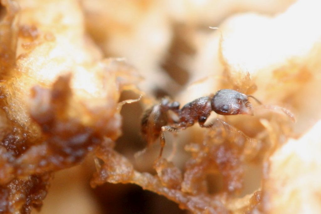 Grein/OĂ–, im Inneren eines alten von Maden zerfressenen Agaricus campestris befanden sich massenhaft Ameisen, 10.8.2019 - ca. 4-5mm
