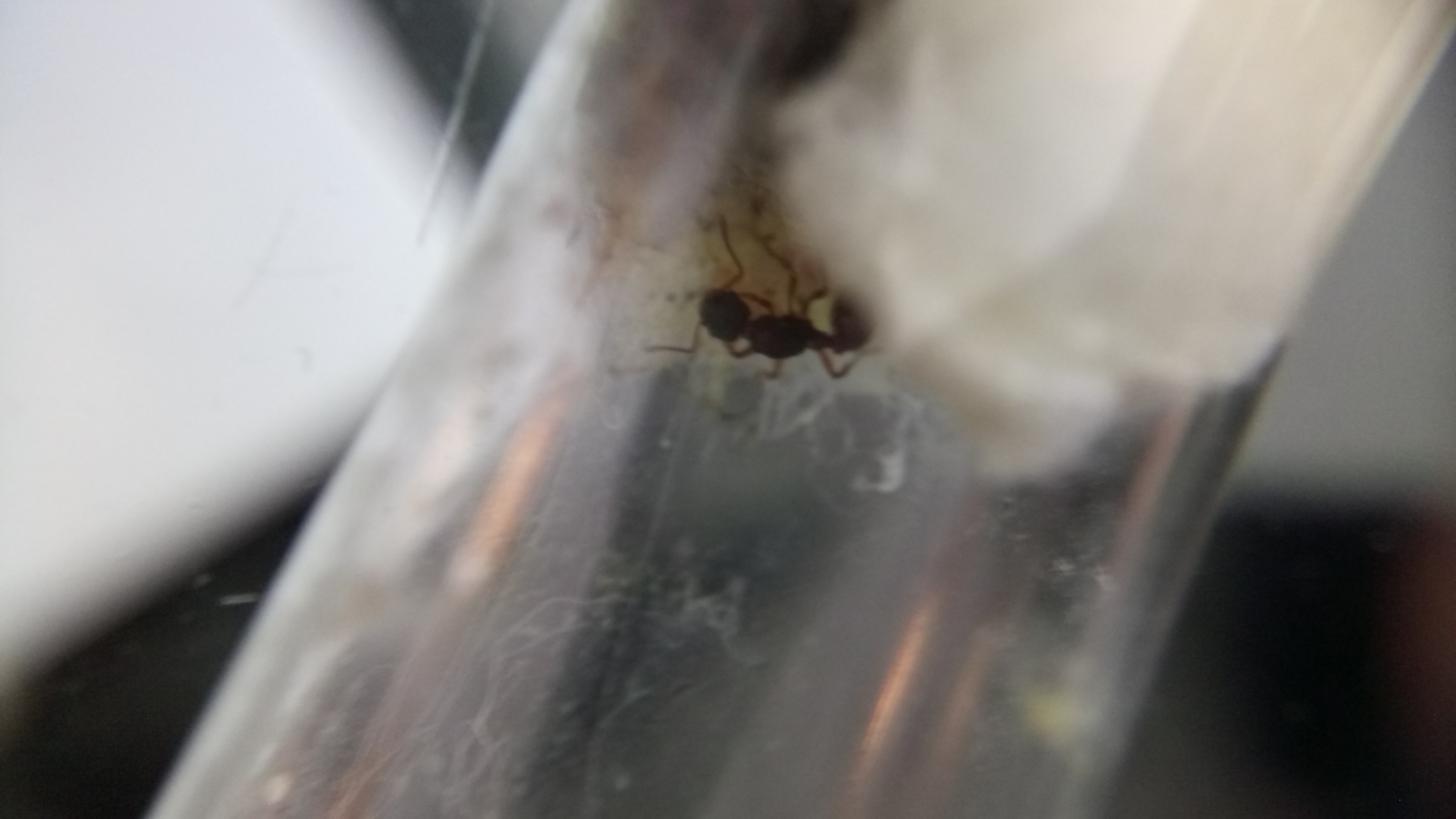 Auch nach Wochen wollten sie das Reagenzglas nicht verlassen, erst als der Tank leer war, wurde ein neues akzeptiert. Die zwei kurzzeitig vorhandenen Arbeiterinnen sind verstorben, bald darauf dieGyne . Auch hier fand ich massenhaft Milben im Reagenzglas vor.