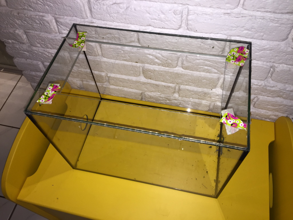Vorgestern habe ich die Glasstreifen geschnitten (5 cm breit) und den ersten auf einer Längsseite mit Aquariensilikon festgeklebt.