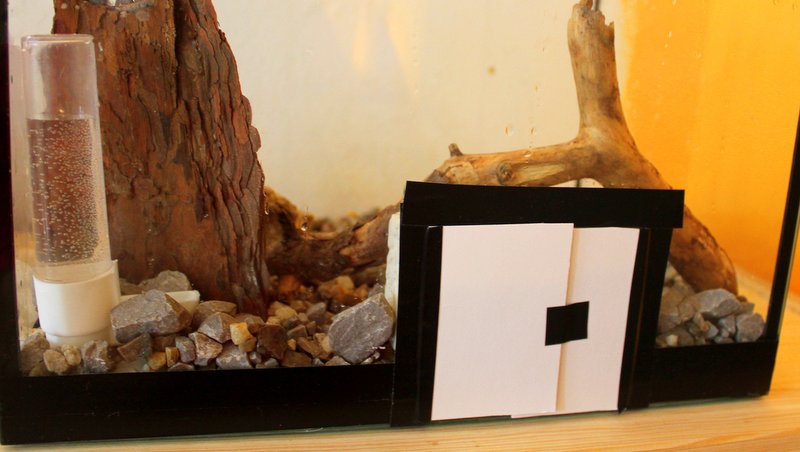 Anfänglich in einer Ikea-Plastik-Box, aber Handhabung dann doch zu umständlich und zu leichter Schimmelbefall - also umgesiedelt in ein altes Aquarium (20x30 Zentimeter ~9 Euro). Ein kleines Nest aus Gips geformt und gebohrt, momentan sind nur Steine als Bodengrund (klappt aber auch recht gut), darunter befindet sich eine Gipsplatte, die sich ebenfalls befeuchten lässt. Außerdem eine LED-Leiste vom Ikea (7 Euro), damits netter und wärmer ausschaut. Erweiterungen sind in Arbeit... ja, und restlicher Inhalt: 0 Euro, da selbst gesammelt.