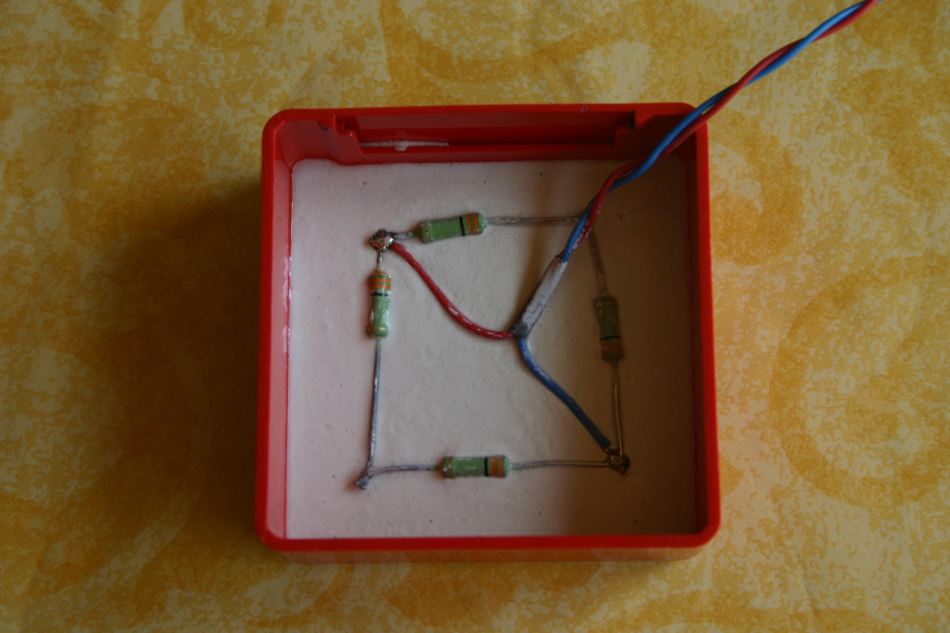 Ich verlöte 2 x 2 WiderstÀnde paralell zur Versorgungsspannung und ordne sie zu einem Quadrat an (s.Bild 02).