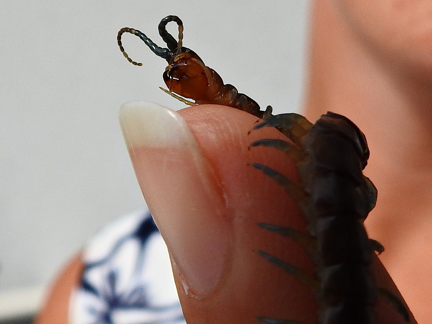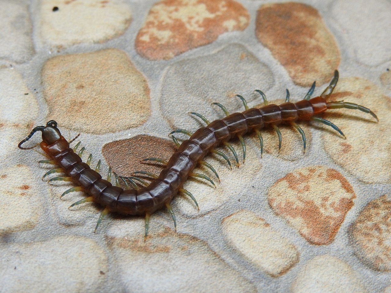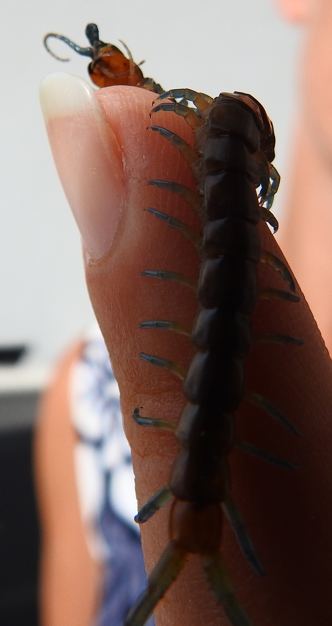 Scolopendra dalmatica - Dieser Hundertfüßer hatte sich auf dem Balkon unserer Ferienwohnung in Kroatien verirrt. Skolopender werden zwar als recht aggressiv beschrieben, dieser hier hatte dennoch keinerlei Anstalten gemacht, meiner besseren Hälfte im Finger zu beißen.