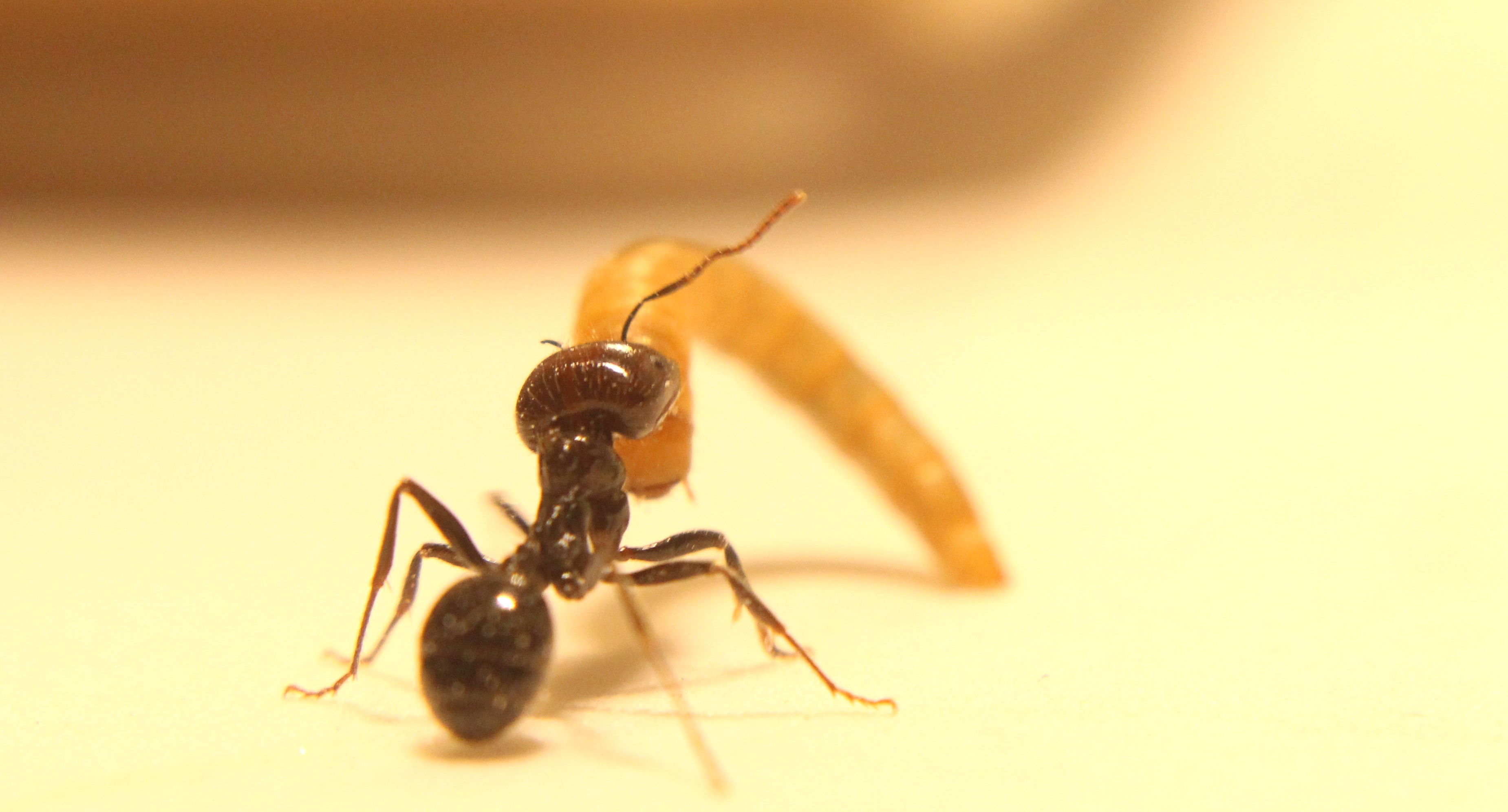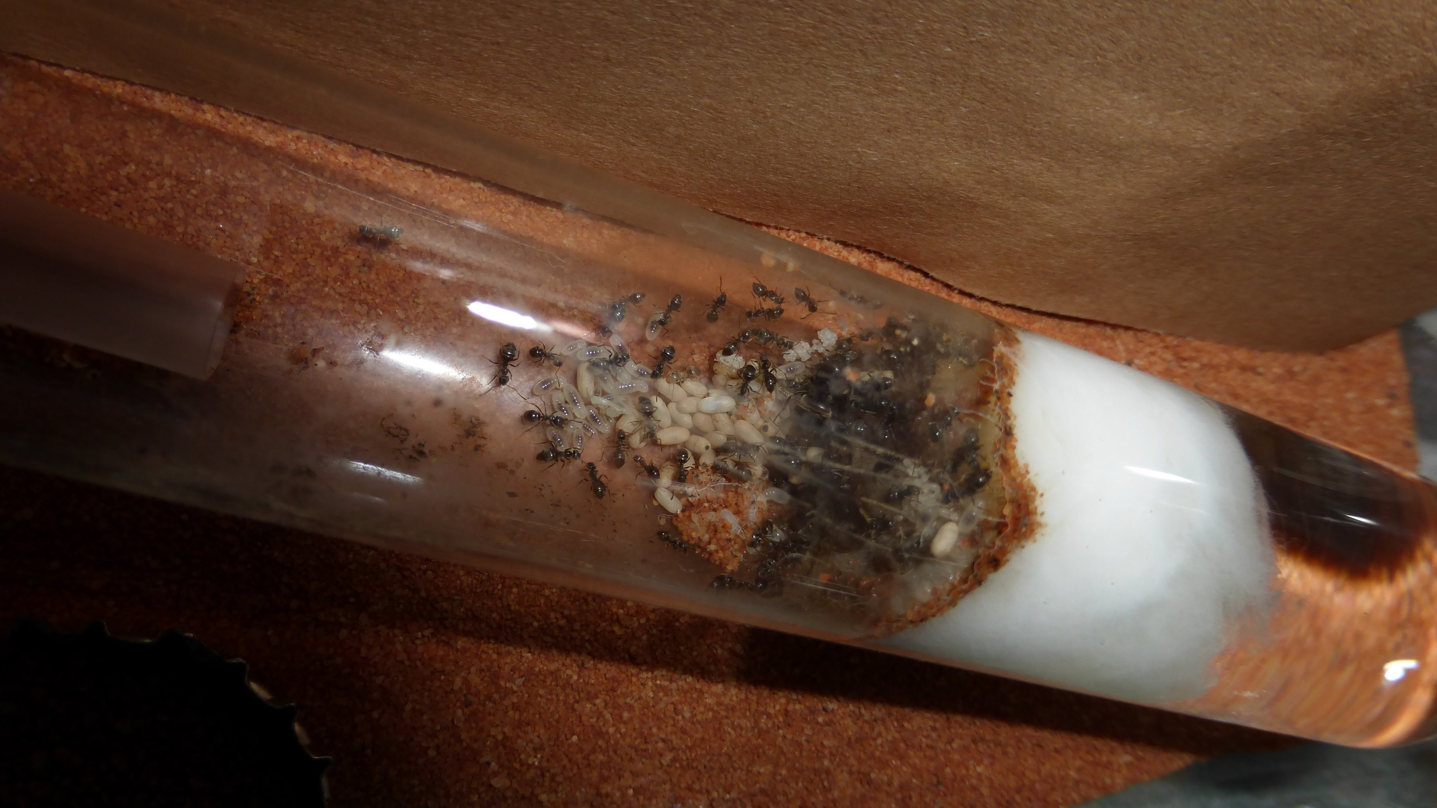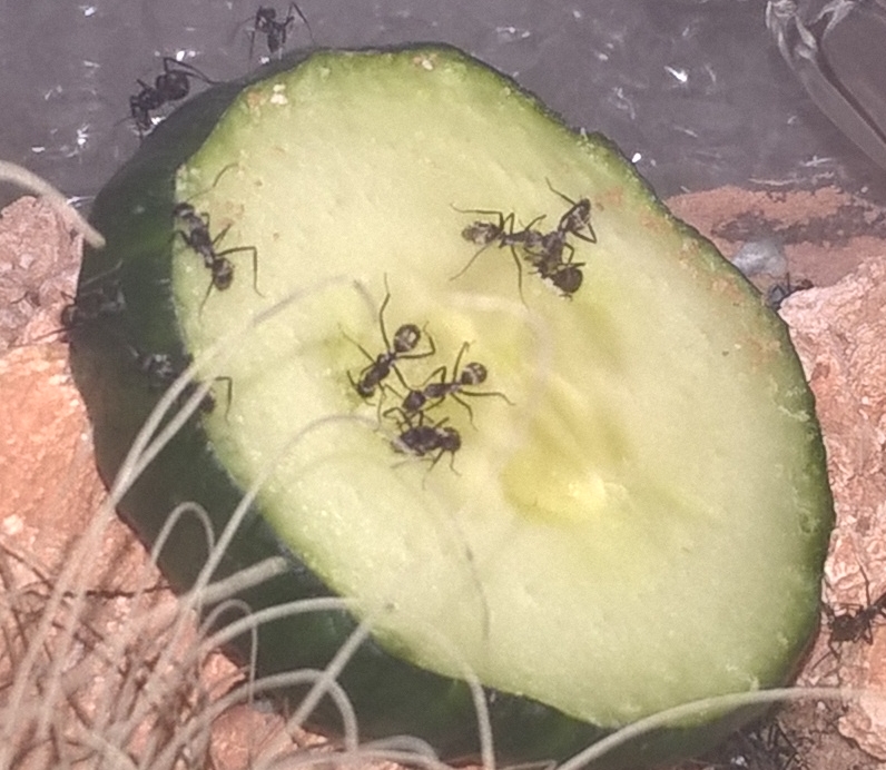 Ich konnte nicht widerstehen und habe eineMajor Arbeiterin einen Mehlwurm angeboten. Sie hat sofort zugeschnappt und lässt seit dem auch nicht mehr los.