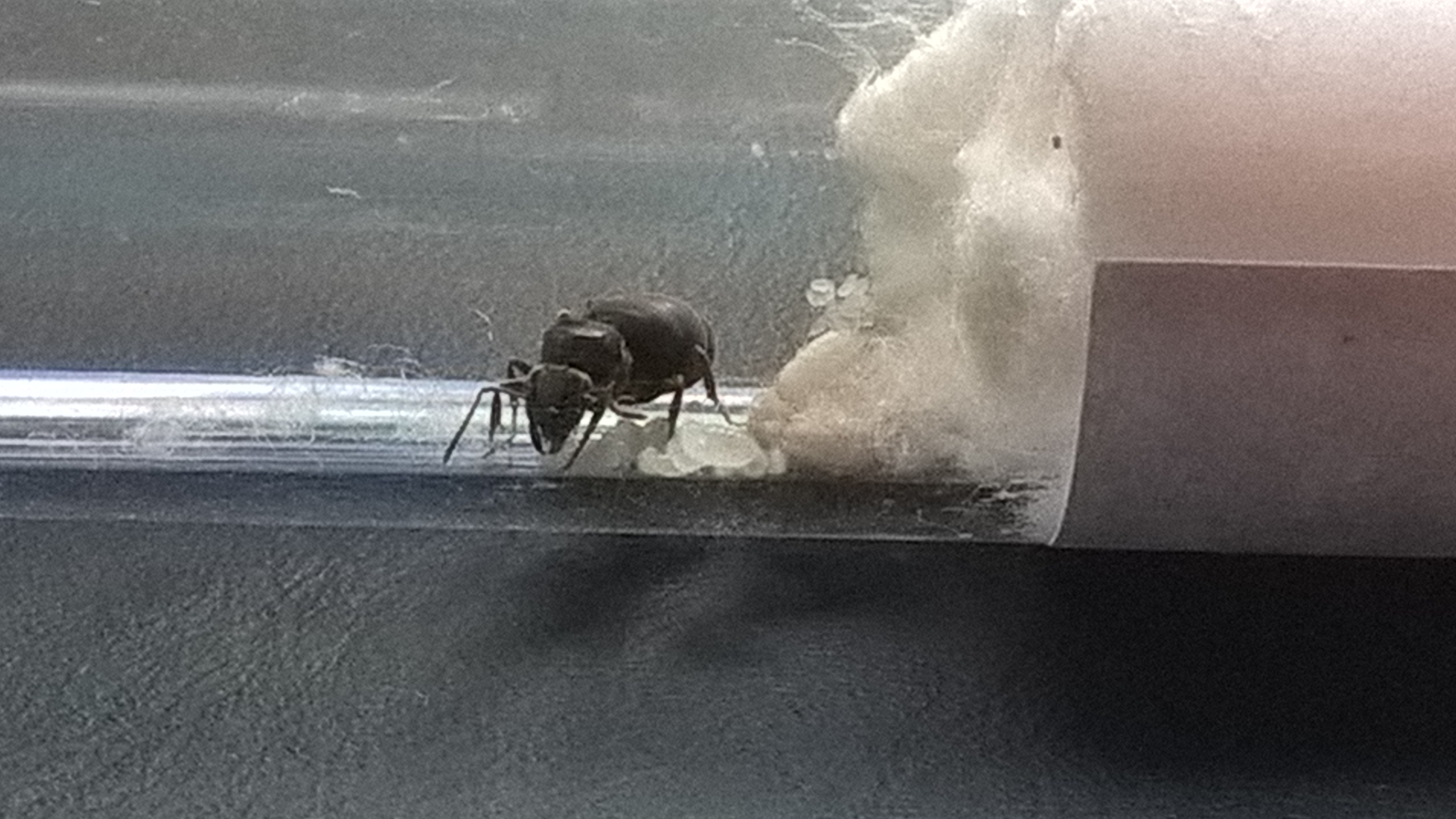 Das Eierpäckchen lag recht verstreut im Bereich bis ca 1 cm Entfernung zum Wassertank. Nach näherer Betrachtung meine Vermutungen: möglicherweise sind nochmal Eier hinzugekommen und eventuell auch welche der bereits vorhandenen geschlüpft?!? Geht das wirklich so schnell??? Da ich nicht weis wann sie die ersten Eier gelegt hat, also durchaus möglich. Aber auch mit der Lupe für mein ungeschultes Auge nicht zu erkennen.