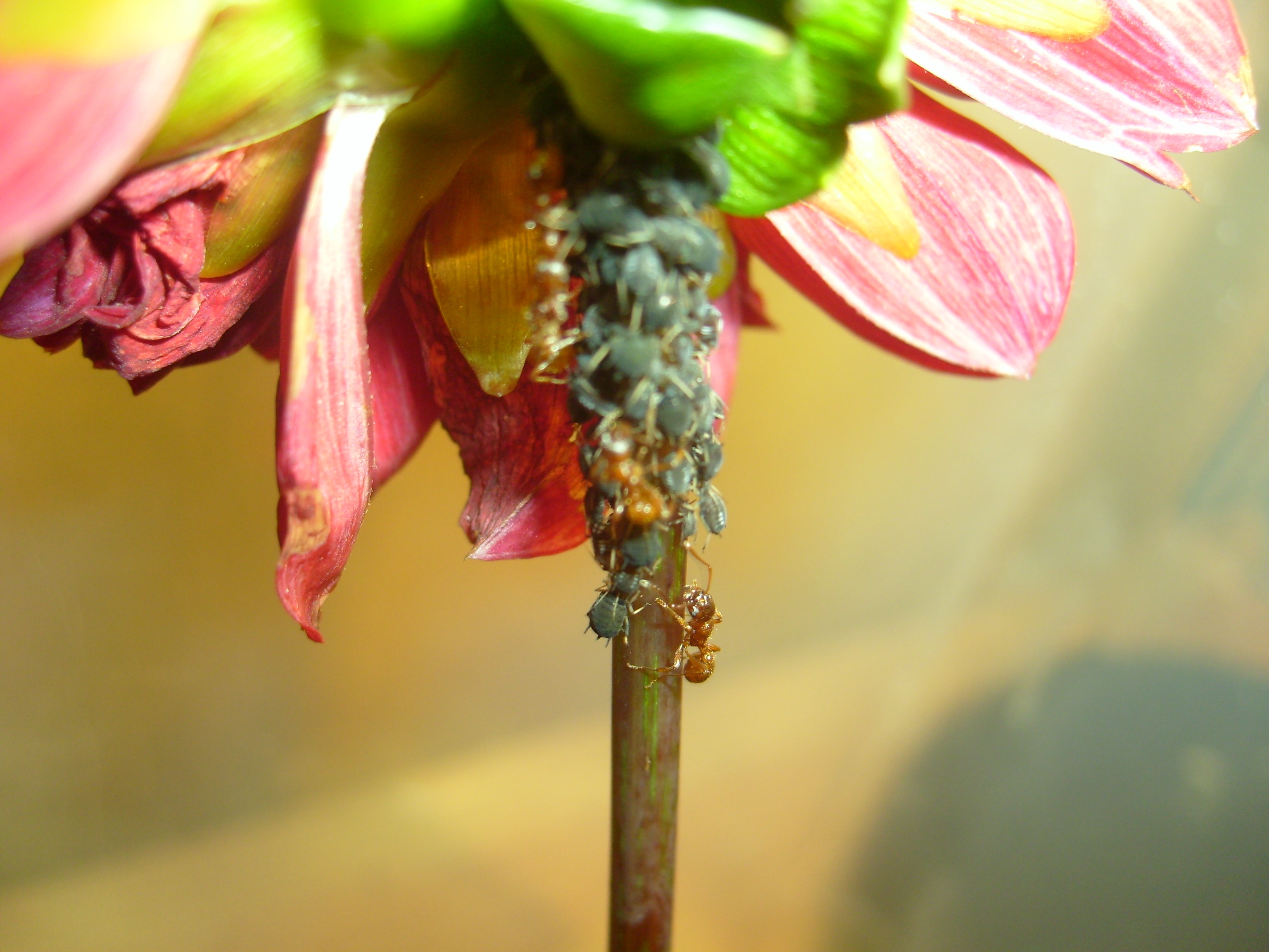 Heute zeige ich euch ein paar Bilder meiner Myrmica cf. rubra Kolonie. Diese Kolonie hatte ich mit 4 Jahren mit Abstand am lĂ€ngsten. Sie hat am Ende mehrere Tausend Arbeiterinnen gehabt. Die Bilder sind aus dem zweiten Jahr der Kolonie wo sie so um die 300-500 Arbeiterinnen hatten(schwer zu sagen). Ich habe ihnen eine Zeit in einer kleinen Vase BlĂŒten mit BlattlĂ€usen angeboten, was sehr gut angenommen wurde.