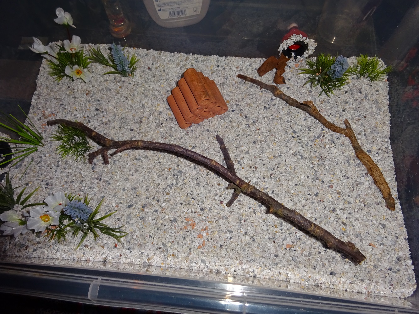 Momentan besitze ich 2 Arenen. Die große Arena (ca. 55 x 35 cm) hat 2 Ausgänge und es gibt einige Kunstblumen sowie Äste als Deko. Diese wird dieses Jahr aber wahrscheinlich nicht zum Einsatz kommen, was mir bewusst ist. Deswegen gibt es noch eine kleine Arena (ca. 35 x 25 cm) ohne Ausgänge und nur mit einigen Ästchen als Deko. Der Bodengrund bei beiden Arenen besteht aus einer Seramis-Schicht und oben drauf einer Aquarienkies-Schicht.