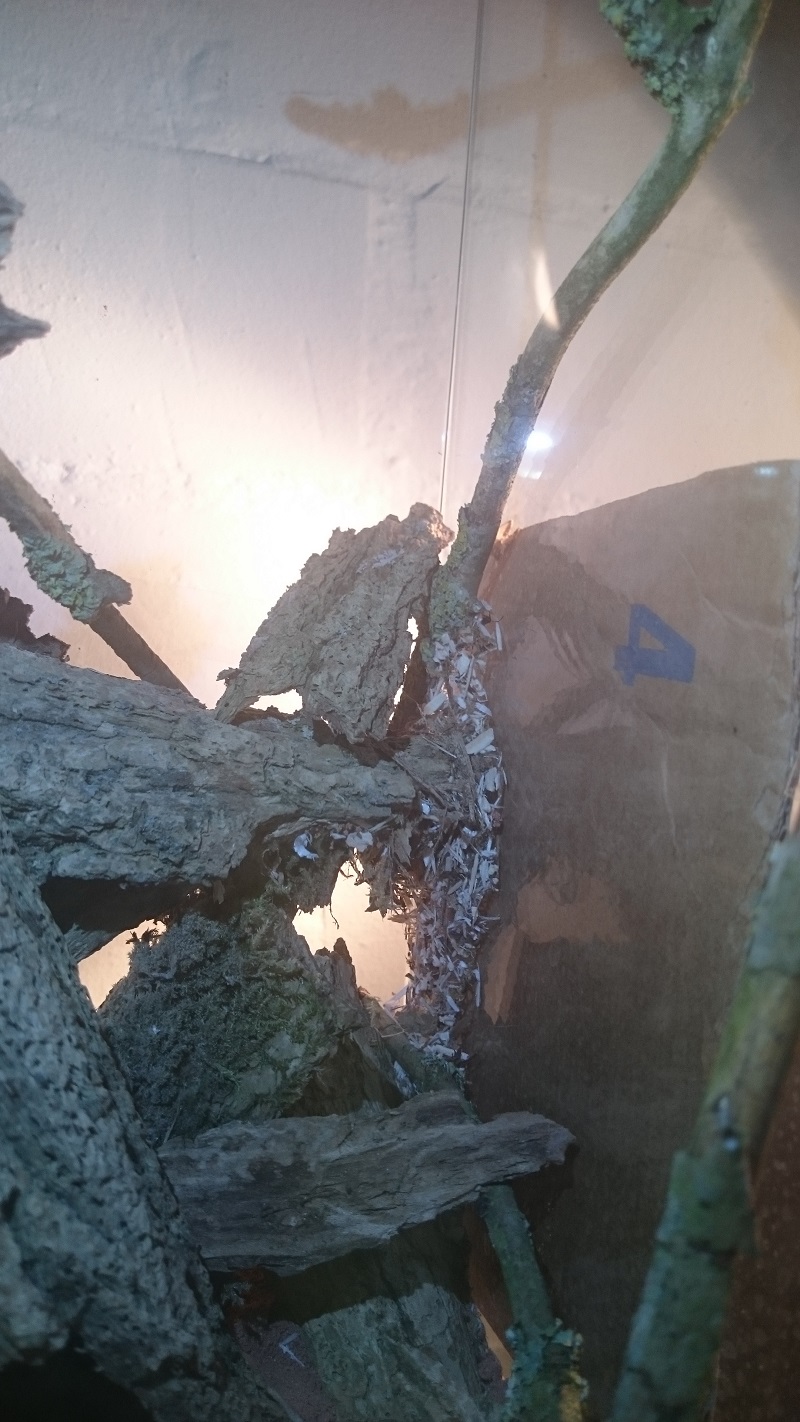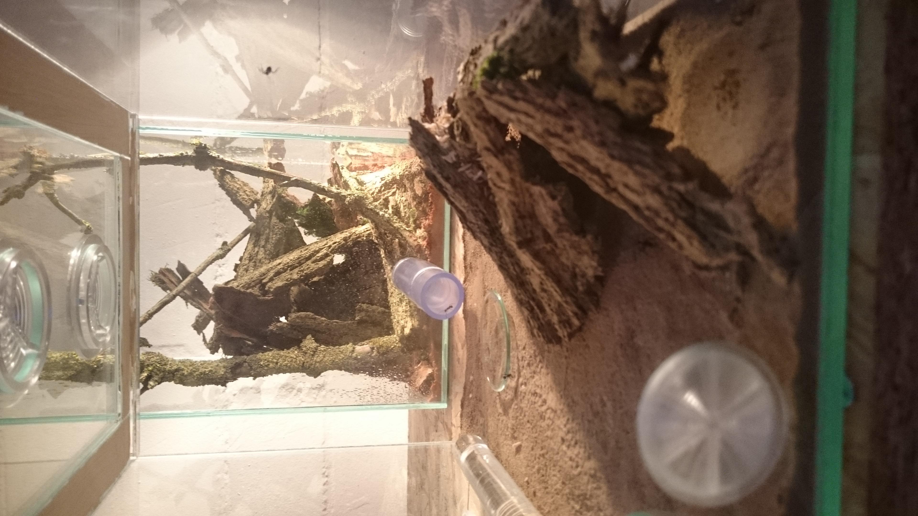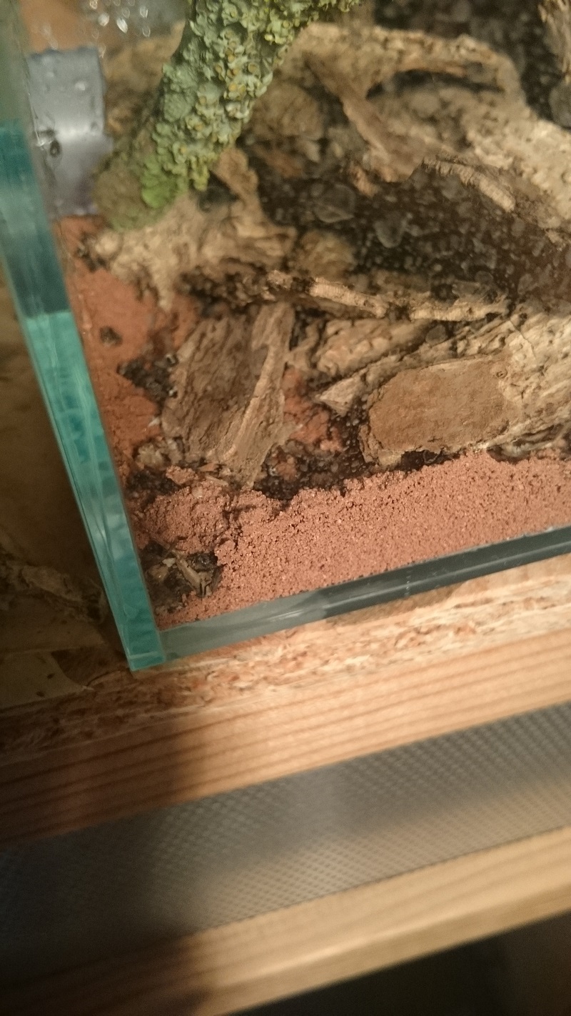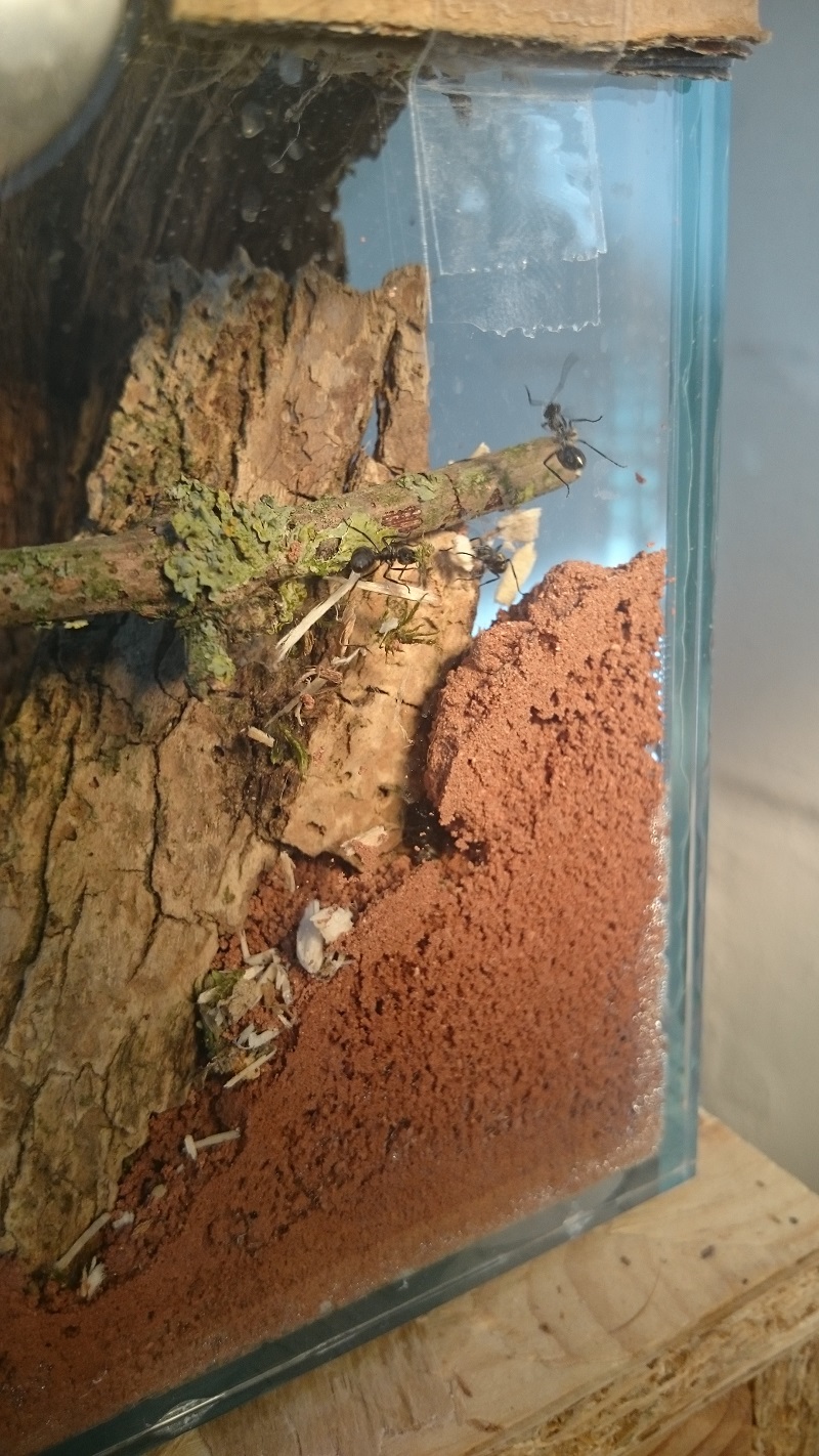 Es handelt sich um ein hohes Formicarium (20x20x40) mit Sand-Lehm-Gemisch. Die Einrichtung besteht aus aufgeschichteten, abgebackenen Rindenstücken und zwei, drei Ästen - das wars schon ;) Auf jeden Fall gibt es viel Lauffläche, was sicherlich nicht unwichtig bei dieser Art ist.