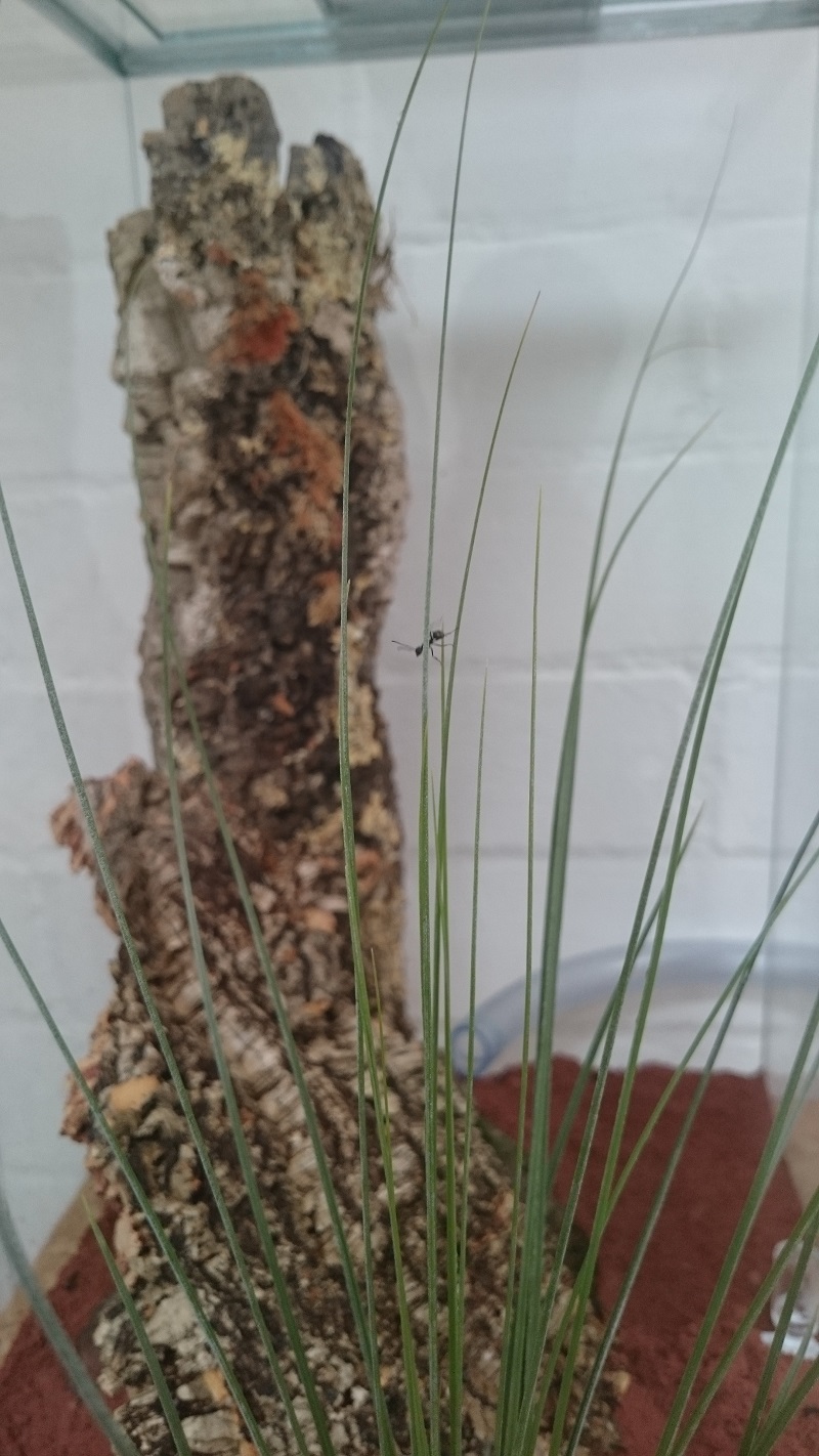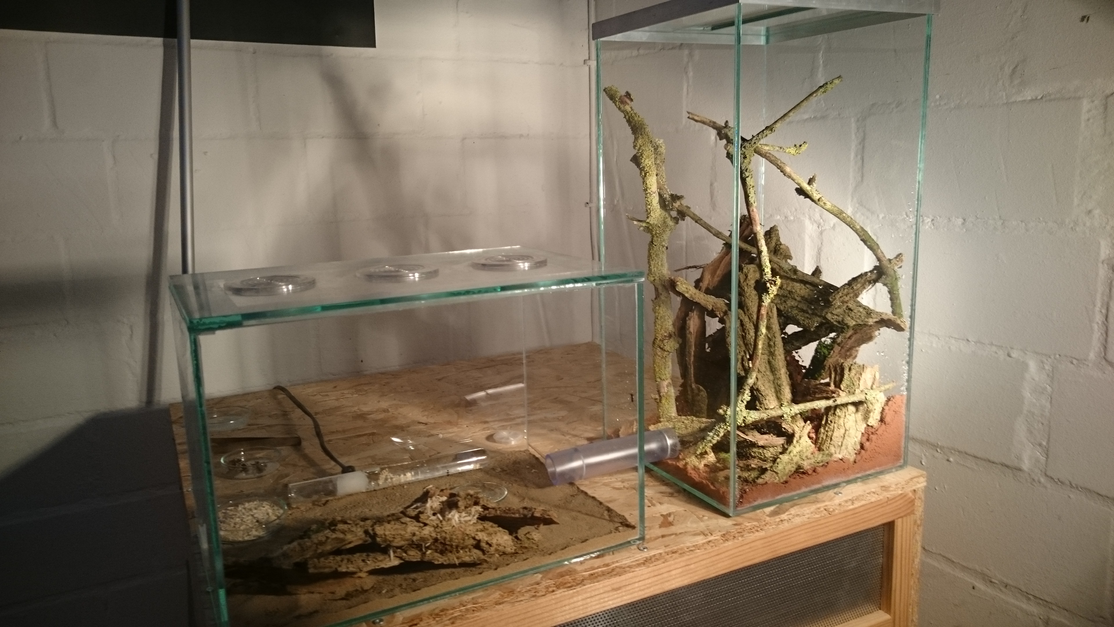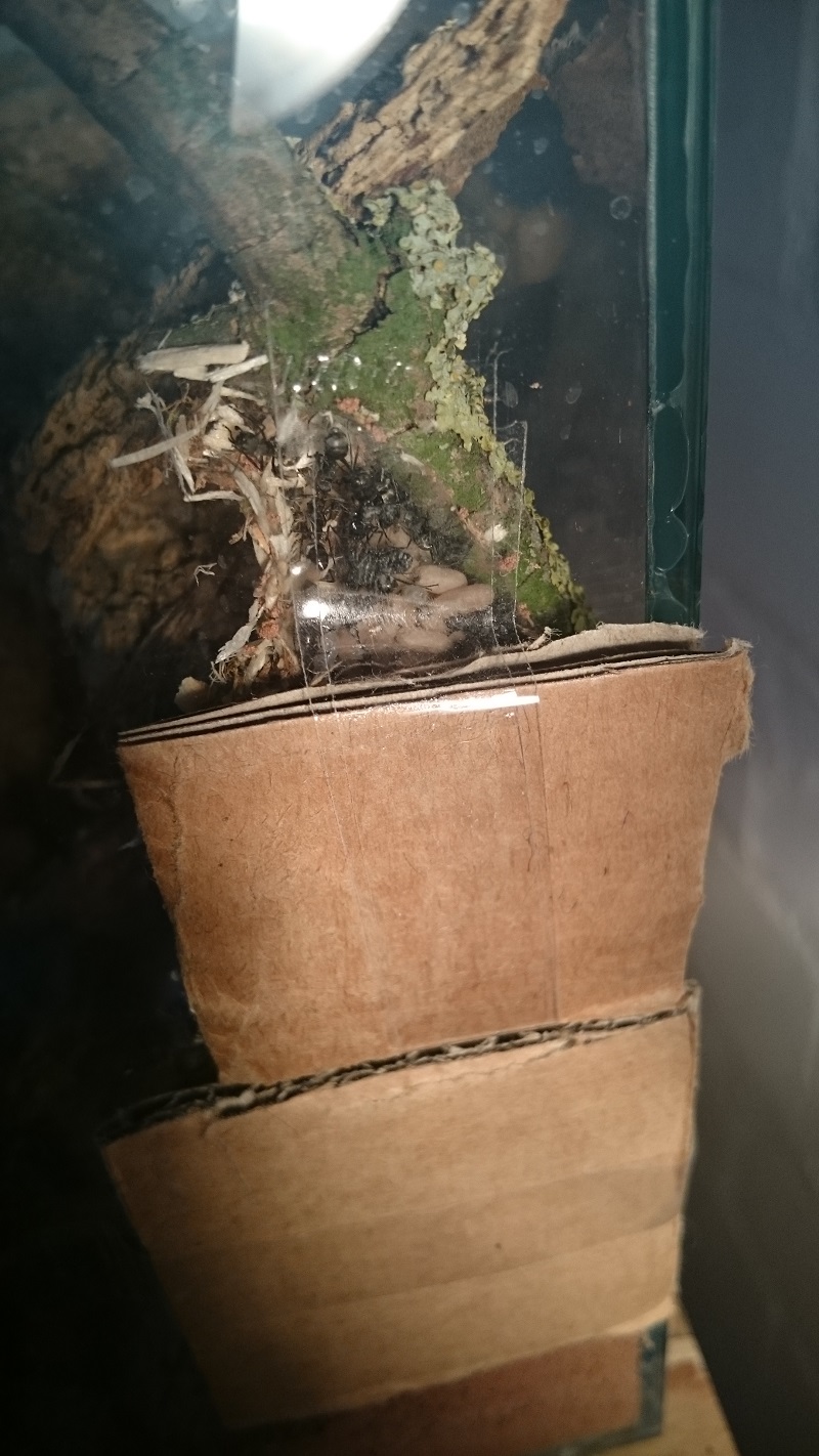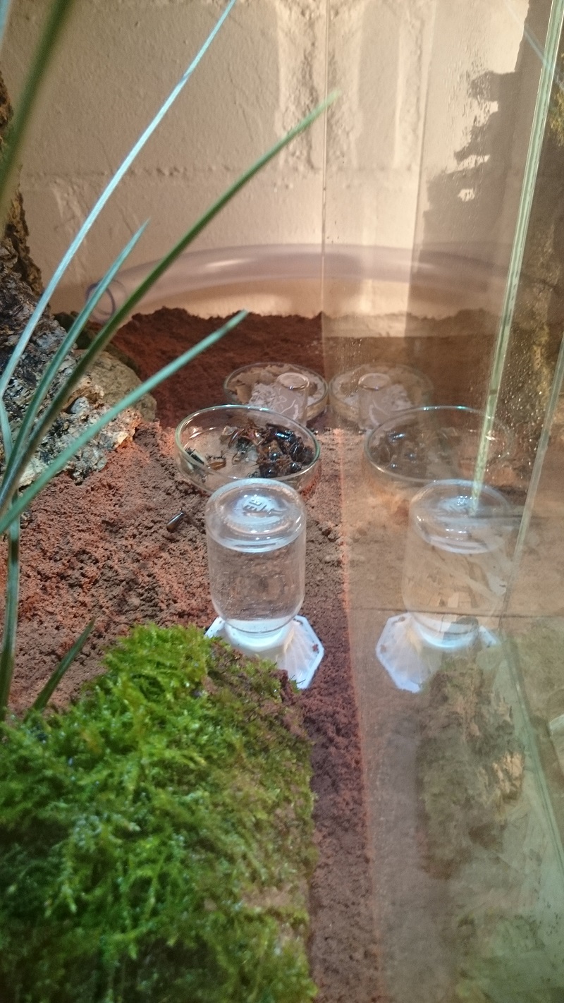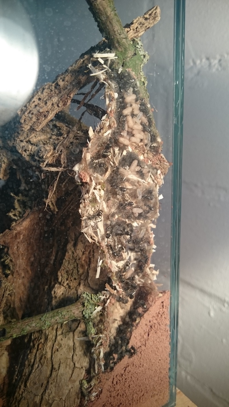 Es handelt sich um ein hohes Formicarium (20x20x40) mit Sand-Lehm-Gemisch. Die Einrichtung besteht aus aufgeschichteten, abgebackenen Rindenstücken und zwei, drei Ästen - das wars schon ;) Auf jeden Fall gibt es viel Lauffläche, was sicherlich nicht unwichtig bei dieser Art ist.