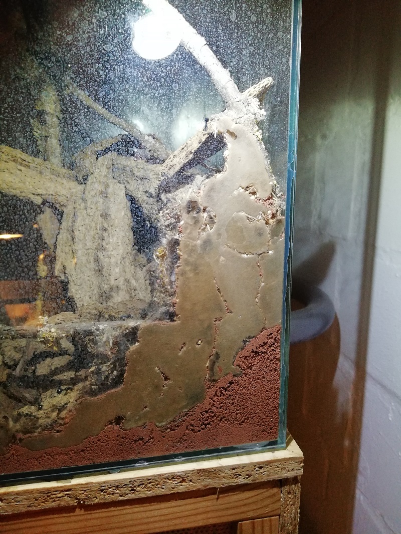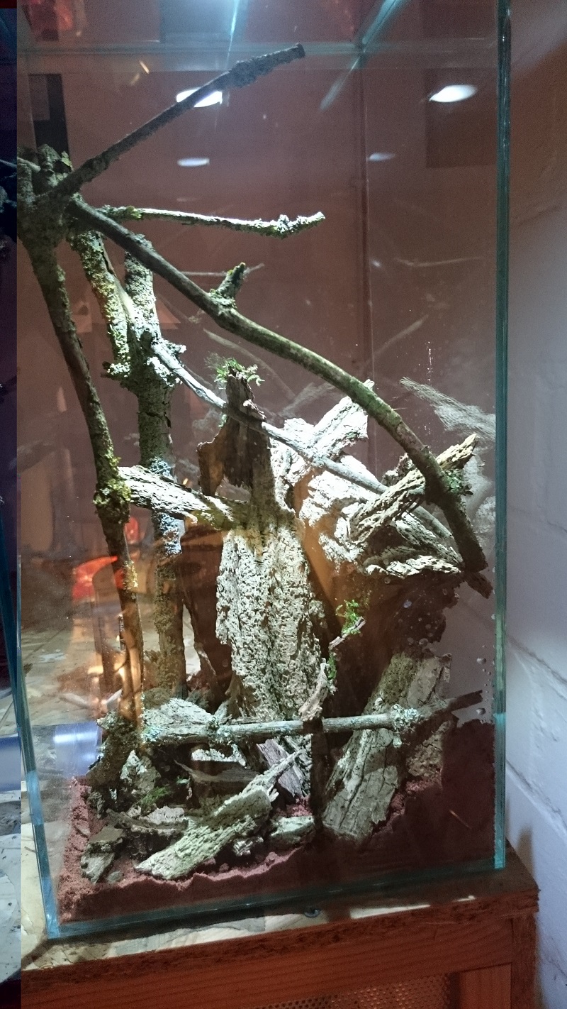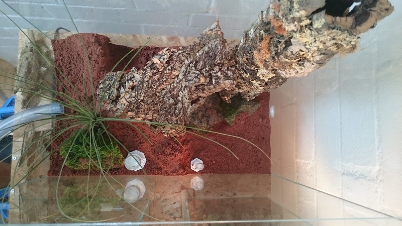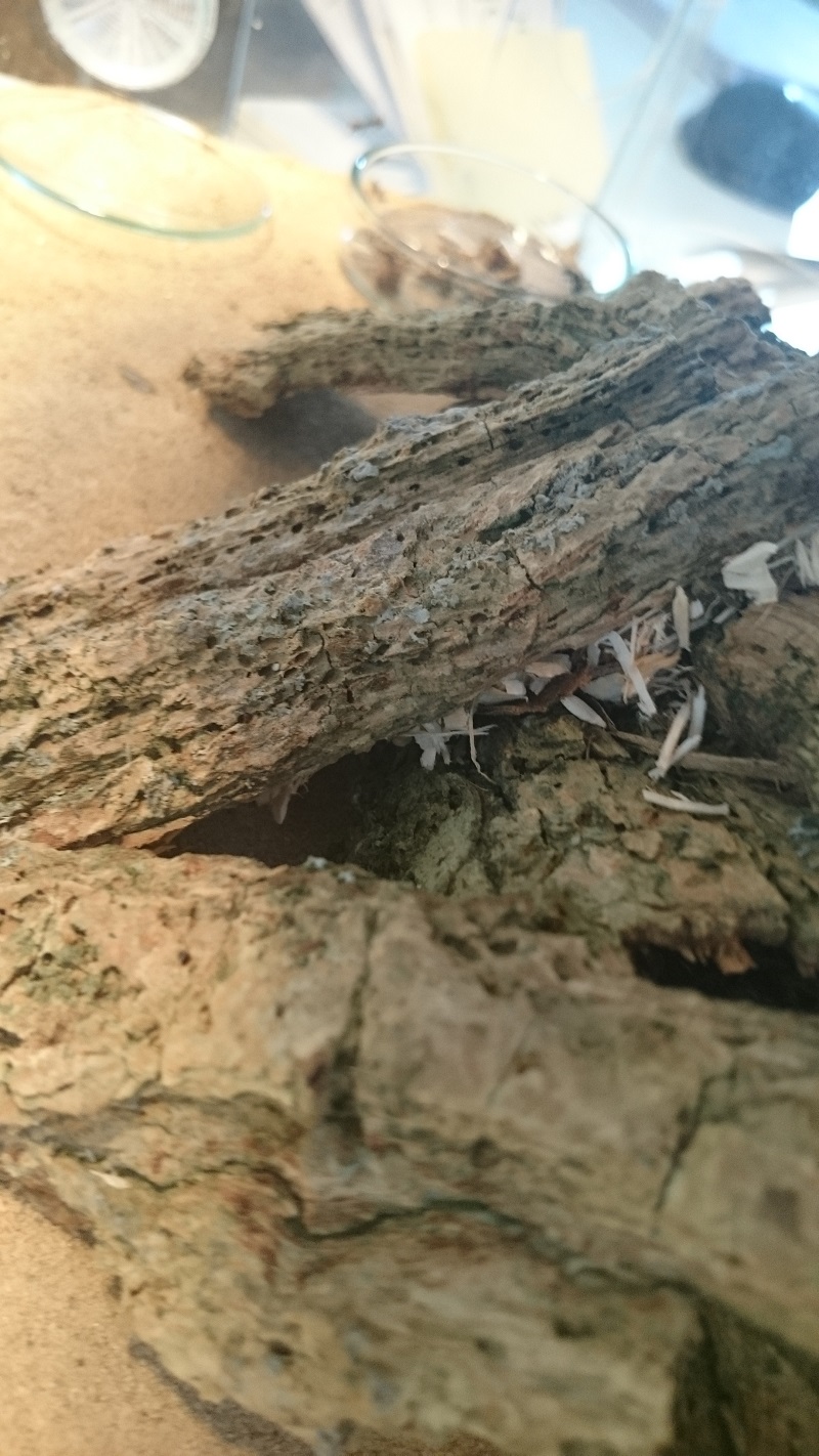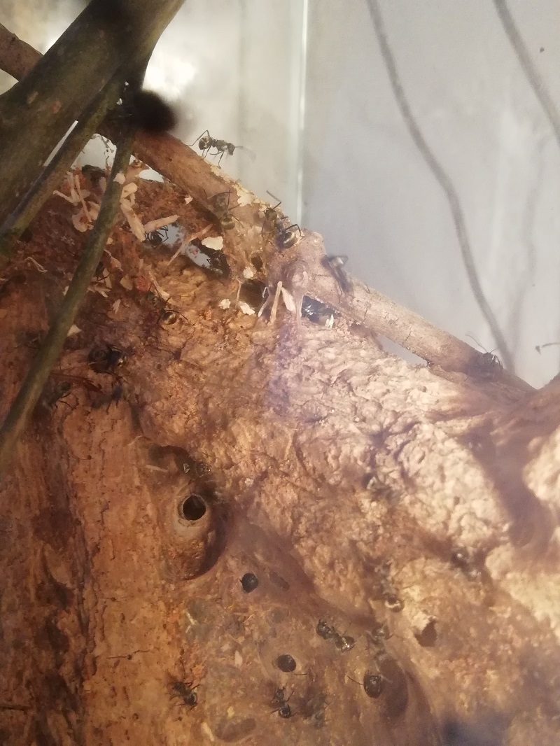 Es handelt sich um ein hohes Formicarium (20x20x40) mit Sand-Lehm-Gemisch. Die Einrichtung besteht aus aufgeschichteten, abgebackenen Rindenstücken und zwei, drei Ästen - das wars schon ;) Auf jeden Fall gibt es viel Lauffläche, was sicherlich nicht unwichtig bei dieser Art ist.