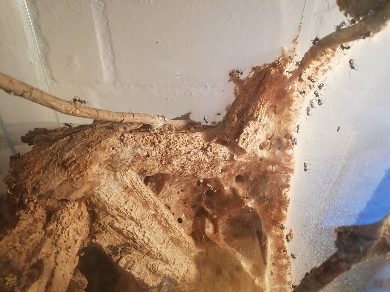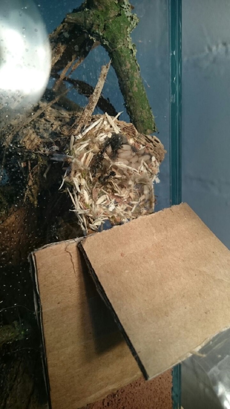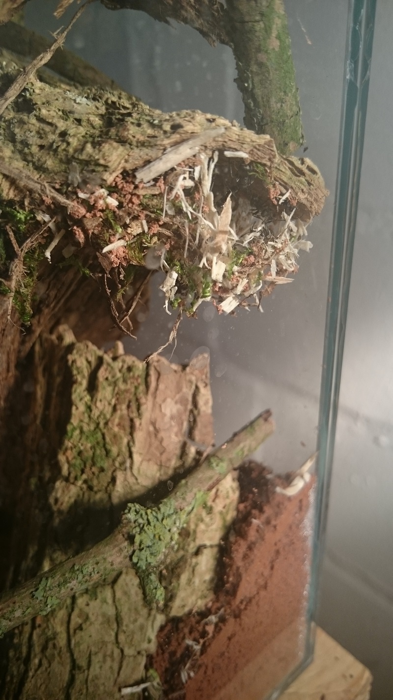 Was mir dabei besonders stark aufgefallen ist: Sobald sie eine Wärmequelle entdeckt wird (bei mir ein Spotstrahler), beginnen sie dort auch sofort mit dem Nestbau. Dies ist zwar keine großartig neue Erkenntnis, aber es ist schon wirklich sehr auffällig, wie thermophil diese Art ist.