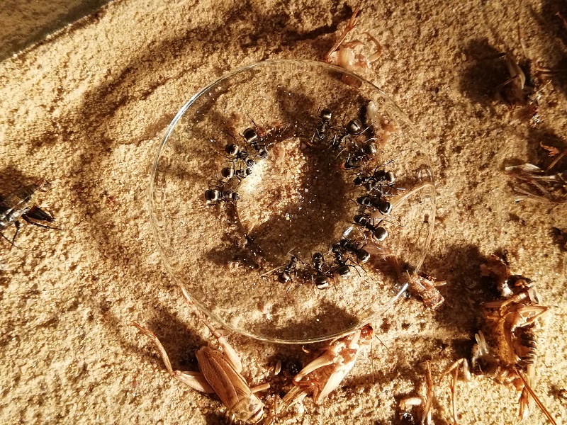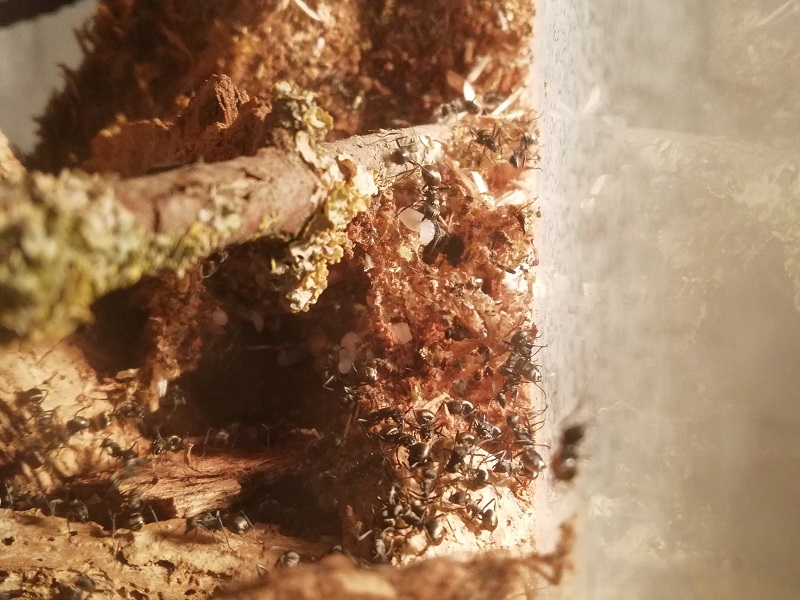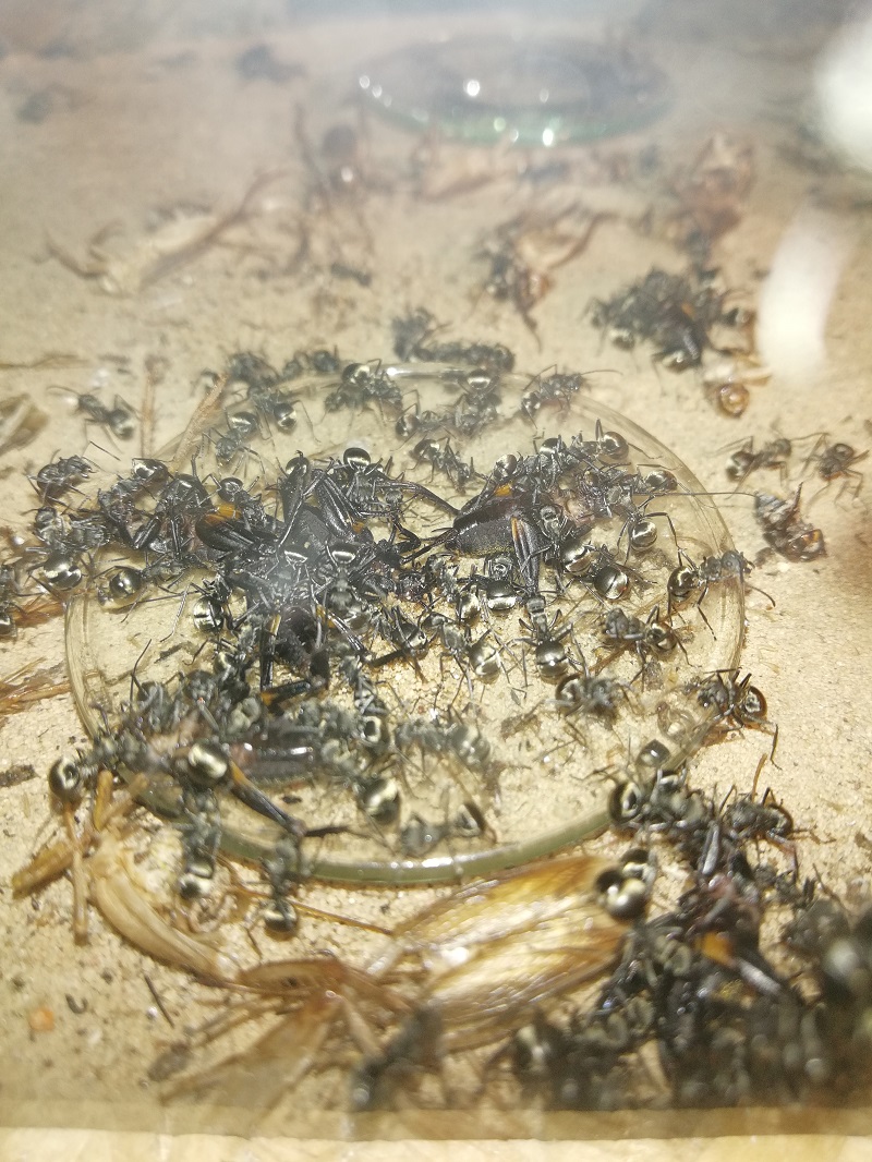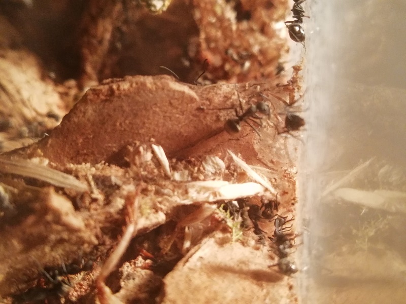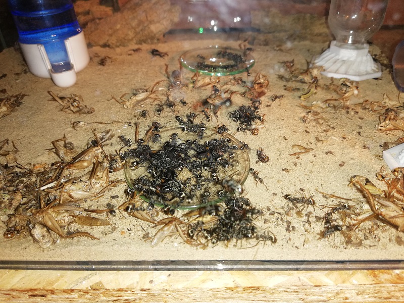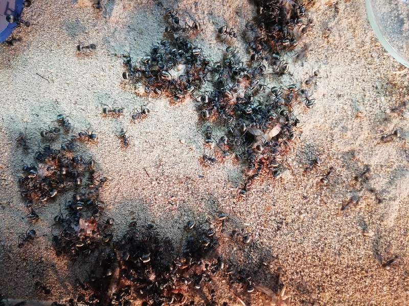 Das Formicarium war, wie sich einige bestimmt schon denken konnten, natürlich etwas klein gewählt. Zwar waren keine Aggressionen unter den Arbeiterinnen erkennbar, zwei Leichen wurden allerdings ohne Unterlass auf der Suche nach einer geeigneten Ablagestelle getragen. Das ganze Spektakel ging dann so lange, bis ich den Ameisen die Leichen mit einer Pinzette entwendete.