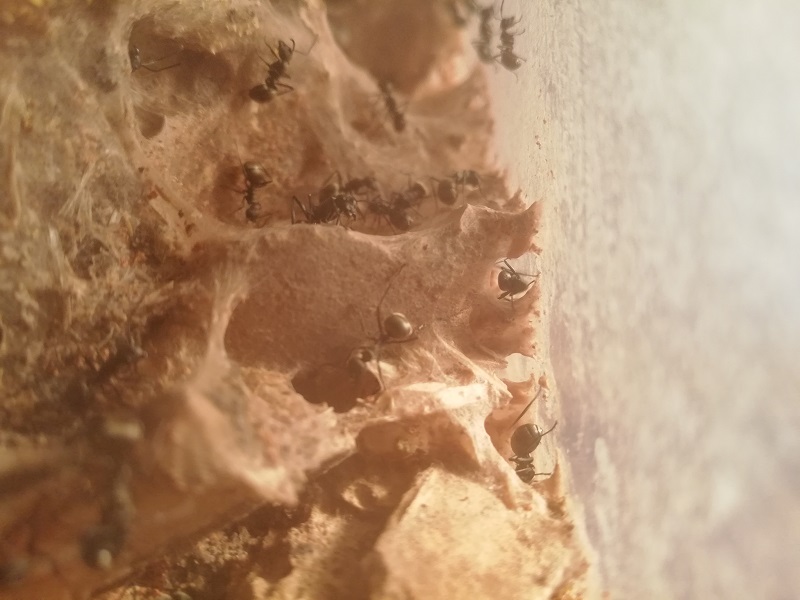 Es dauerte keine zehn Minuten, da wurde das neue Formicarium auch schon erkundigt. Keine Stunde, da wurde das Nest gewebt (siehe unten) - eine architektonische, über Kopf- und frei hängende Meisterleistung, wenn man mich fragt. Einfach genial, wie es aussieht und beim Weben selber beobachten zu dürfen macht nur noch viel mehr Freude :)