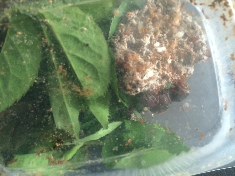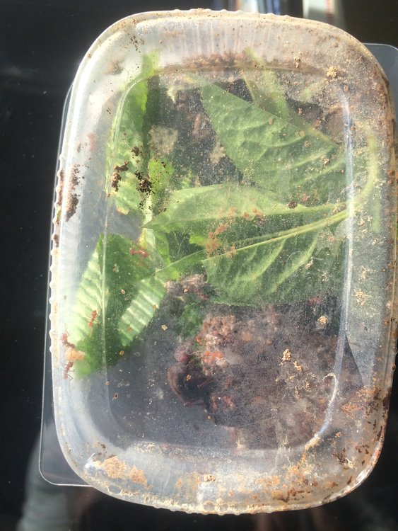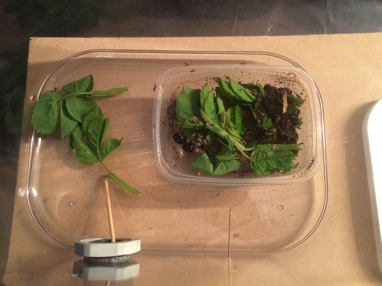 5 Arbeiterinnen arbeiteten daran, den Pilz abzubauen und ihn aus dem Nest in die viel größere Fütterungsarena (Kapazität 4,5 Liter) zu bringen. Die Kolonie schien es also im Nest, das ich für sie bestimmt hatte, nicht zu mögen. Sie bauten den Pilz in der Blattachse eines Liguster Zweigs wieder auf und die ganzeBrut wurde dorthin gebracht. Ich befürchtete jedoch, dass der Pilz an dieser Stelle austrocknen würde, wodurch die Kolonie verloren gehen würde.