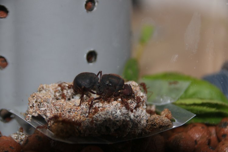 Ich habe diese Box mit dem Deckel auf den Kopf gelegt. Die Kolonie würde dann den Pilz auf dem Deckel aufbauen. Wenn das Nest voll gebaut wurde.