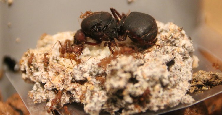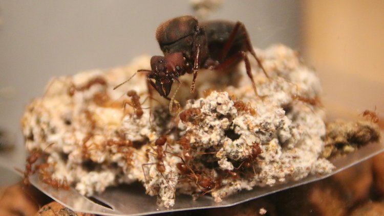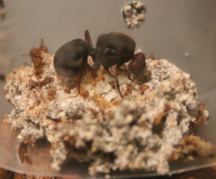 Unten rechts auf dem Foto sehen Sie einen Pilzklumpen, der nur braun ist. Dieser Pilz ist tot. Irgendwann werden sie diese Art von Schimmelstücken entfernen. Es ist gut zu sehen, wie klein die kleinsten Arbeiter im Vergleich zumGyne sind (siehe unten links).