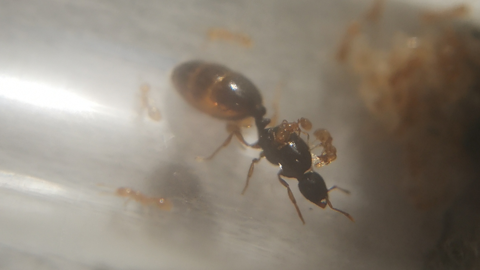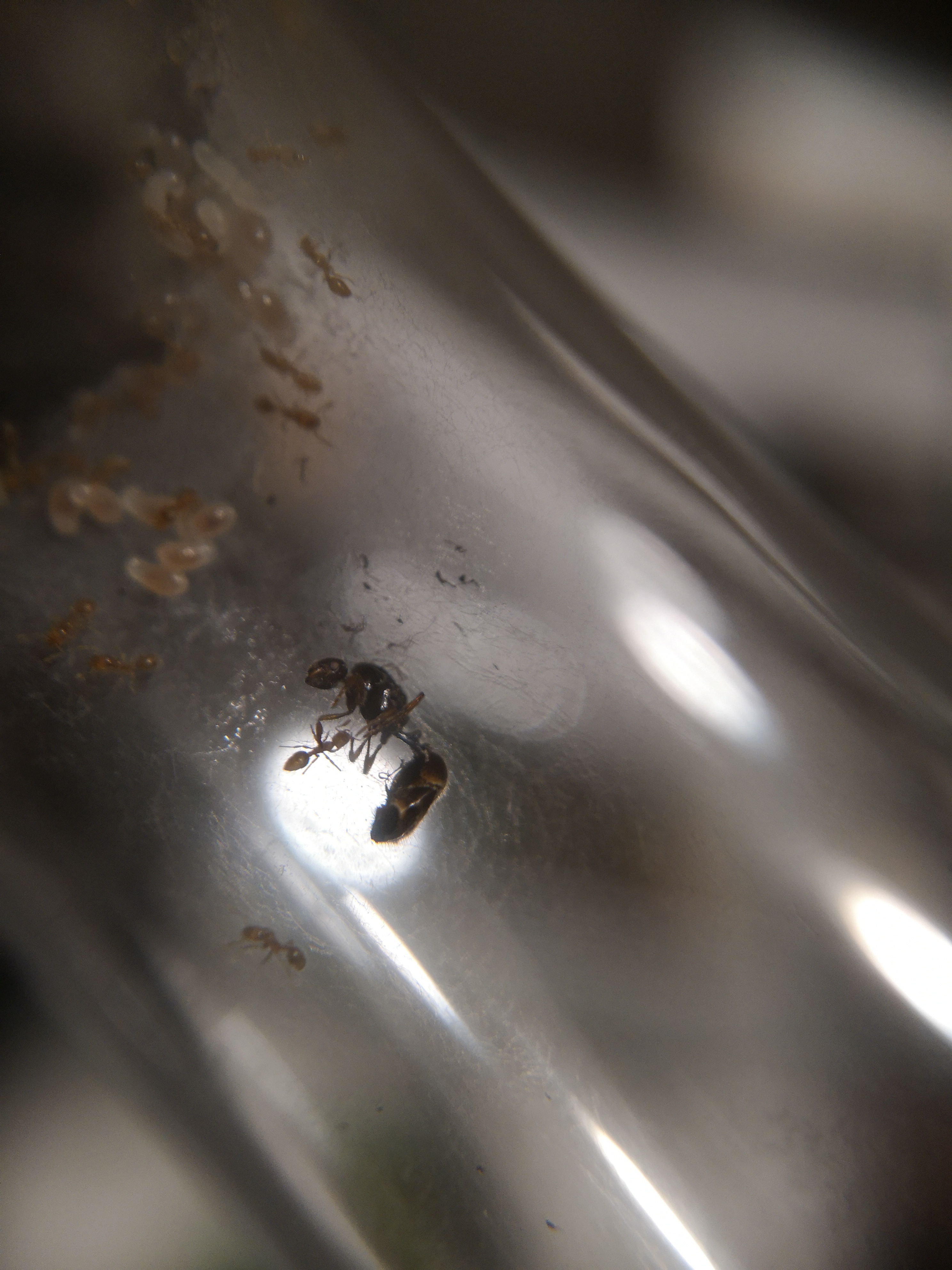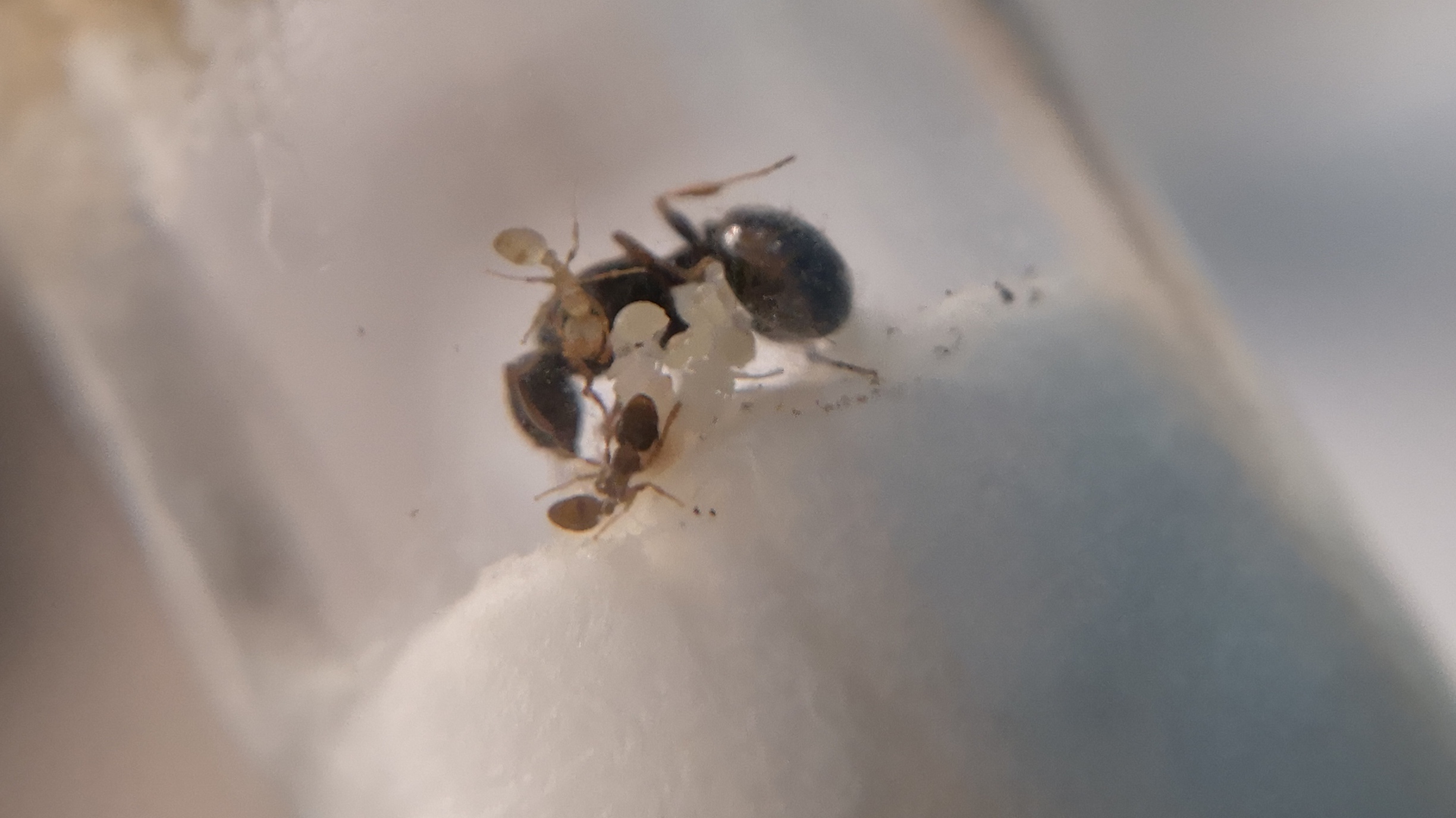 Tetramorium sp.Nachdem der Tank leer war, musste diese Kolonie zwangsweise in ein neues RG umziehen. Dabei ging eine Arbeiterin und eine