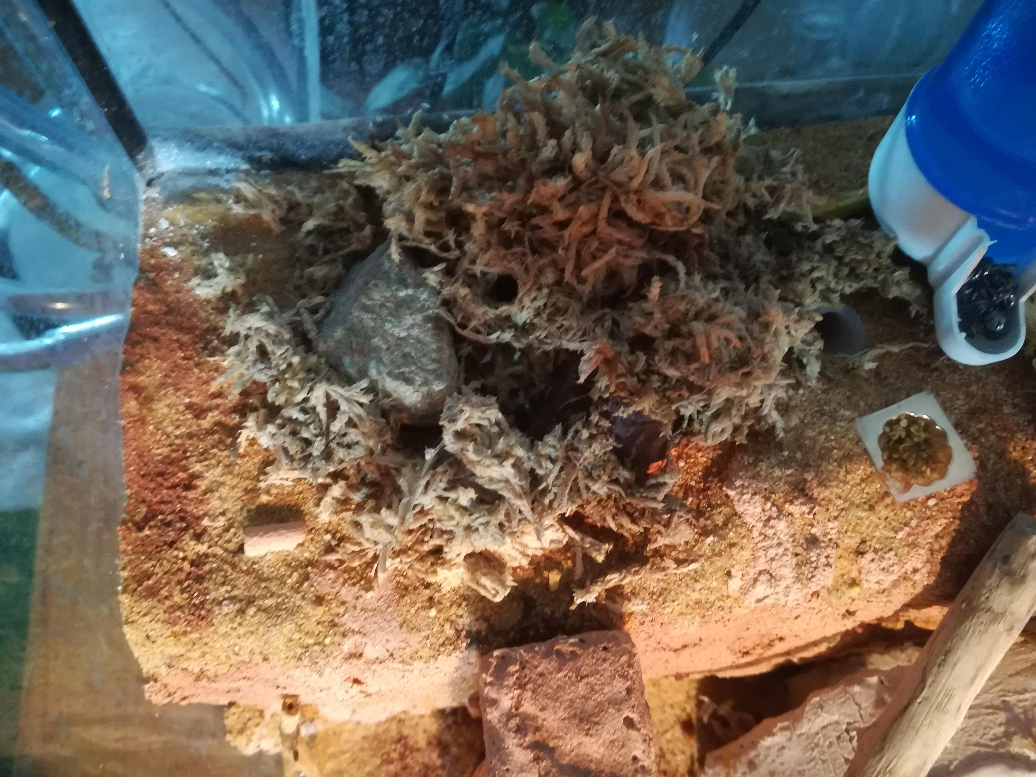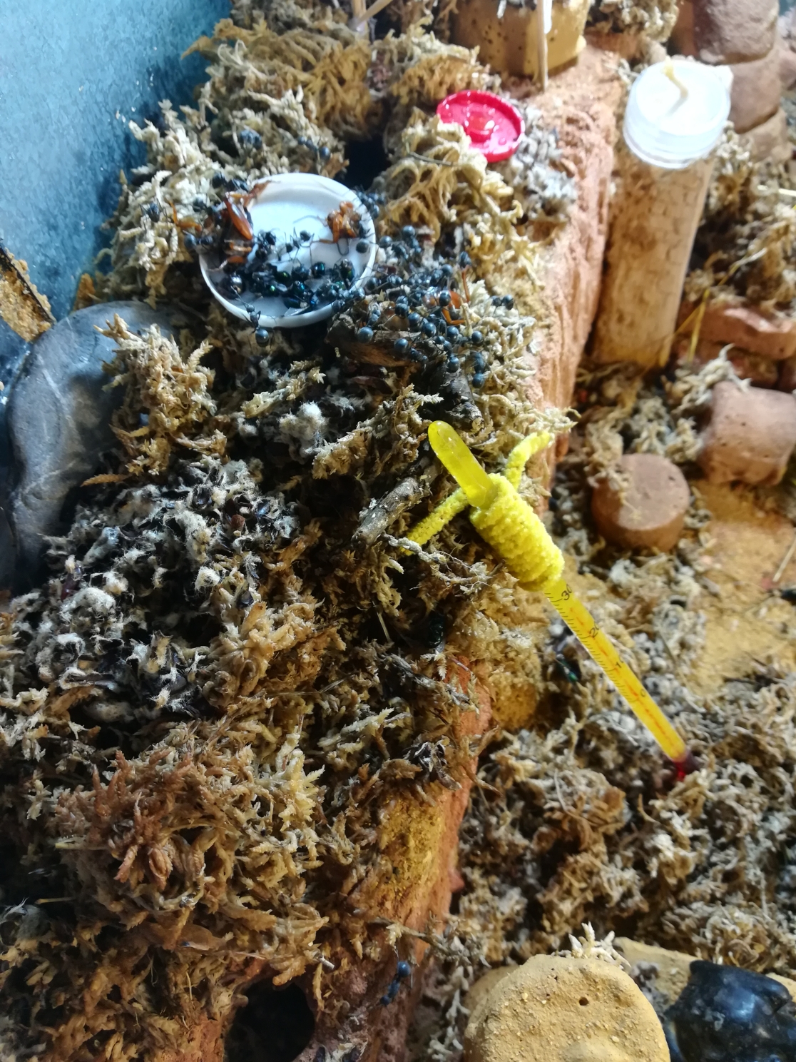 Wenn ich etwas Wasser ĂŒber die Landschaft sprĂŒhe springen sie erstmal erschrocken am Nesteingang herum, dann schwĂ€rmen sie vermehrt im Becken aus und gehen auf Futtersuche. Wieviel Luftfeuchte optimal ist habe ich noch nicht herausgefunden.